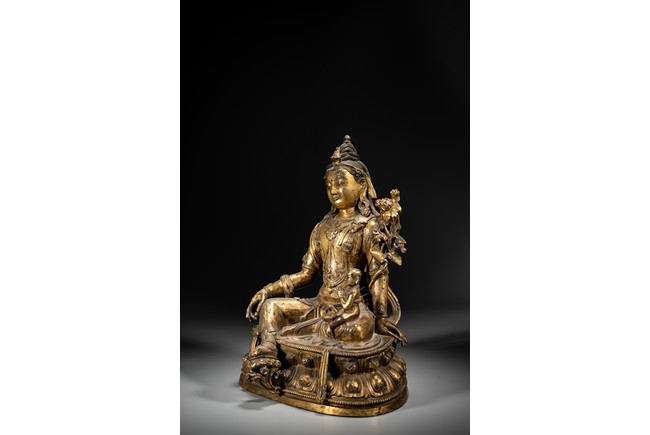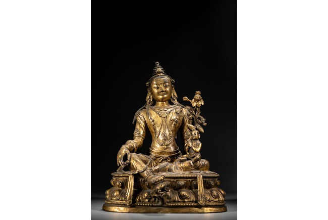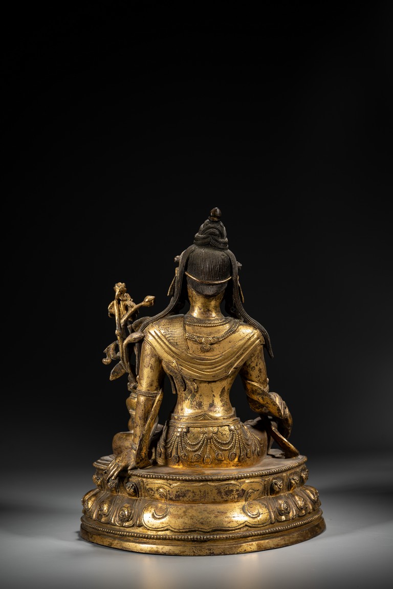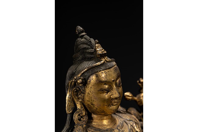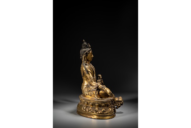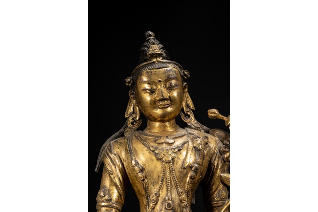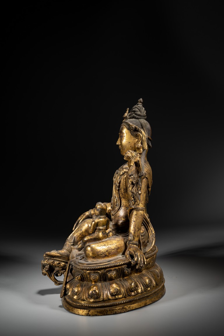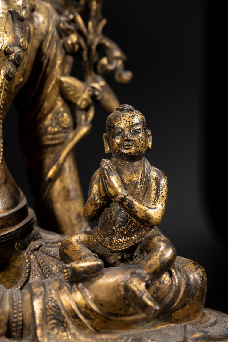 《妙法蓮華經·觀世音普門品》雲:「若有女人,設欲求男,禮拜供養觀世音菩薩,便生福德智慧之男;設欲求女,便生端正有相之女。」送子觀音題材的造像在北宋時期已有之,到明清時期大量出現。在中原地區,送子觀音被認為具有助生育的法力,倍受人們崇信,如此造型接近民間多子多嗣的願望,為人們喜聞樂見。此尊觀音面頰豐腴,白毫圓凸,頭戴髮箍,正中有阿彌陀佛,髮辮垂至兩肩,頭微偏轉,目光下斂,低眉若有所思,神情嫻淑,姿態端莊,微含笑意,相容慈和。身穿通肩天衣,胸前珮飾三層式瓔珞,左肩披一仁獸及綻開肩花,衣紋刻畫寫實自然。觀音呈大自在相,坐於雙層式蓮花座上,蓮座樣式為典型康熙宮廷風格,觀音左腿盤曲,左腿下垂並踩踏蓮花,左手撐於蓮座上方,右手輕撫膝部。憨態可掬的童子則坐於觀音的左膝上,雙手合十,面容靜謐,生動傳神。整像尺寸碩大,通體鎏金,造型端莊,比例勻稱,體態優美。歷經常年供奉,銅色沈穆,包漿古潤。在宋至清代中原造像中,送子觀音為一位世俗化的慈祥的婦人造型,而此尊送子觀音來自於康熙宮廷造像,觀音融化了漢藏風格,為藏傳佛教中介於男女之間的善男子形象,與常見的送子觀音有很大區別,但比善男子形象同樣的慈眉善目,盡可能的追求一種疼愛幼童的慈祥形象。目前存世的造像中,此造型共不多見,極具收藏價值。明代中原送子觀音銅像偶有所見,但清康熙的送子觀音像兼有如此尺寸大者則極為罕見。