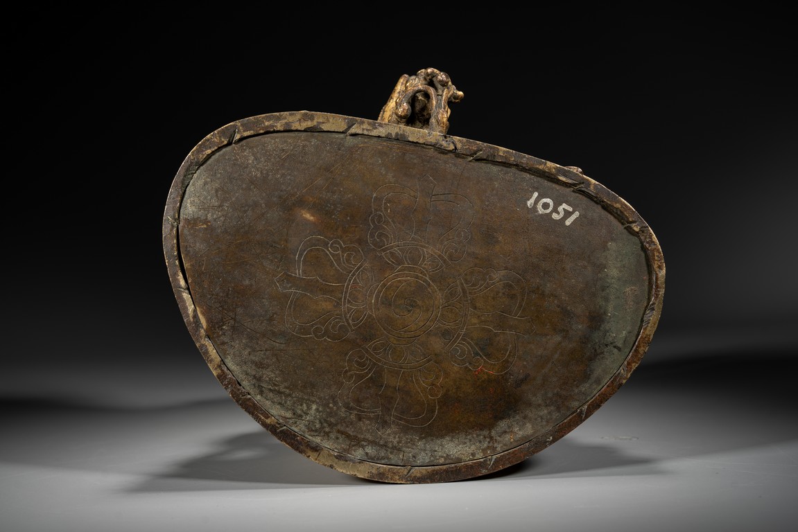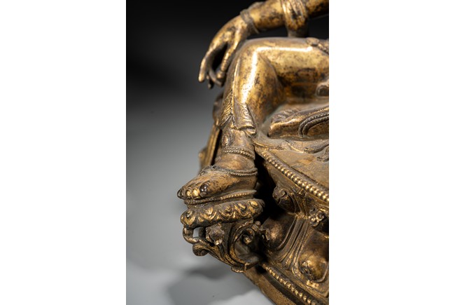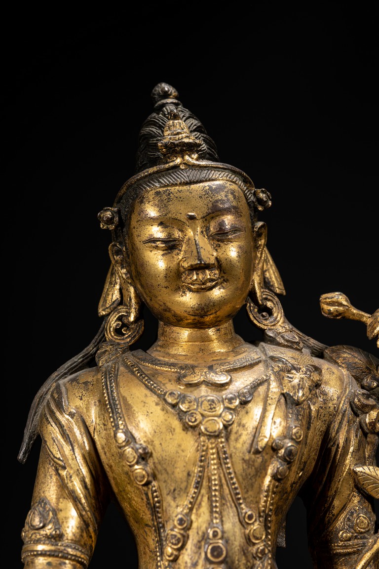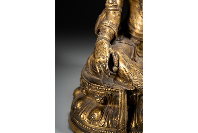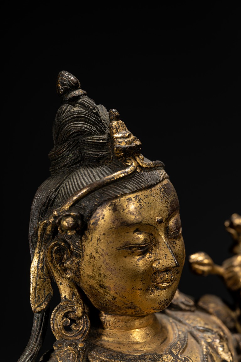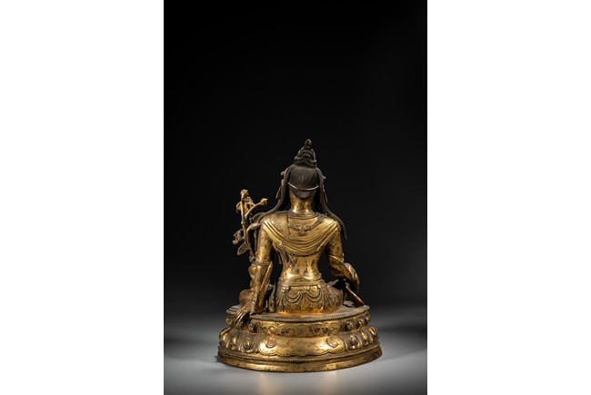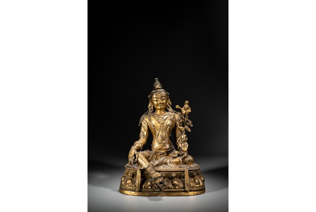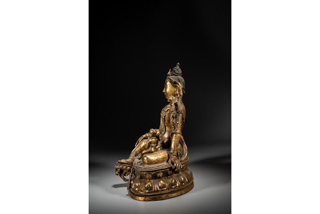《妙法蓮華經·觀世音普門品》雲:「若有女人,設欲求男,禮拜供養觀世音菩薩,便生福德智慧之男;設欲求女,便生端正有相之女。」送子觀音題材的造像在北宋時期已有之,到明清時期大量出現。在中原地區,送子觀音被認為具有助生育的法力,倍受人們崇信,如此造型接近民間多子多嗣的願望,為人們喜聞樂見。此尊觀音面頰豐腴,白毫圓凸,頭戴髮箍,正中有阿彌陀佛,髮辮垂至兩肩,頭微偏轉,目光下斂,低眉若有所思,神情嫻淑,姿態端莊,微含笑意,相容慈和。身穿通肩天衣,胸前珮飾三層式瓔珞,左肩披一仁獸及綻開肩花,衣紋刻畫寫實自然。觀音呈大自在相,坐於雙層式蓮花座上,蓮座樣式為典型康熙宮廷風格,觀音左腿盤曲,左腿下垂並踩踏蓮花,左手撐於蓮座上方,右手輕撫膝部。憨態可掬的童子則坐於觀音的左膝上,雙手合十,面容靜謐,生動傳神。整像尺寸碩大,通體鎏金,造型端莊,比例勻稱,體態優美。歷經常年供奉,銅色沈穆,包漿古潤。在宋至清代中原造像中,送子觀音為一位世俗化的慈祥的婦人造型,而此尊送子觀音來自於康熙宮廷造像,觀音融化了漢藏風格,為藏傳佛教中介於男女之間的善男子形象,與常見的送子觀音有很大區別,但比善男子形象同樣的慈眉善目,盡可能的追求一種疼愛幼童的慈祥形象。目前存世的造像中,此造型共不多見,極具收藏價值。明代中原送子觀音銅像偶有所見,但清康熙的送子觀音像兼有如此尺寸大者則極為罕見。