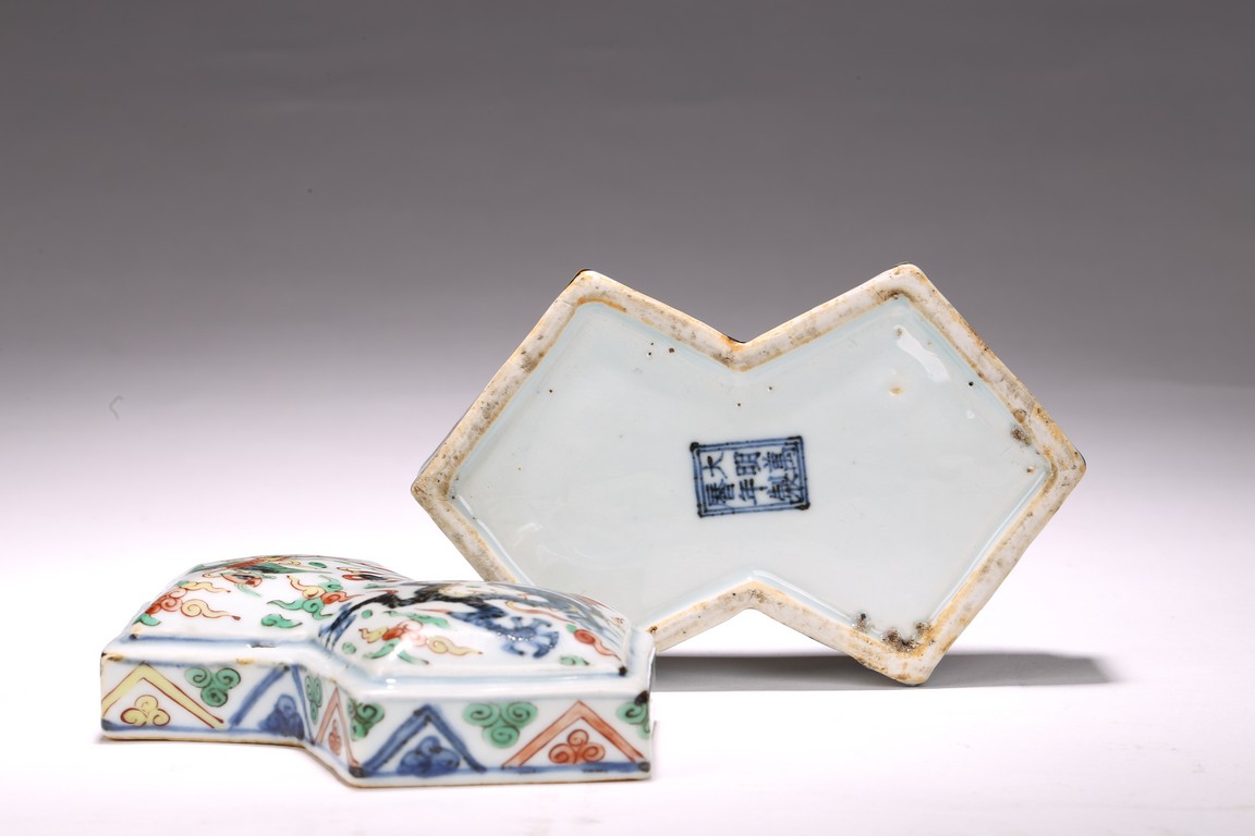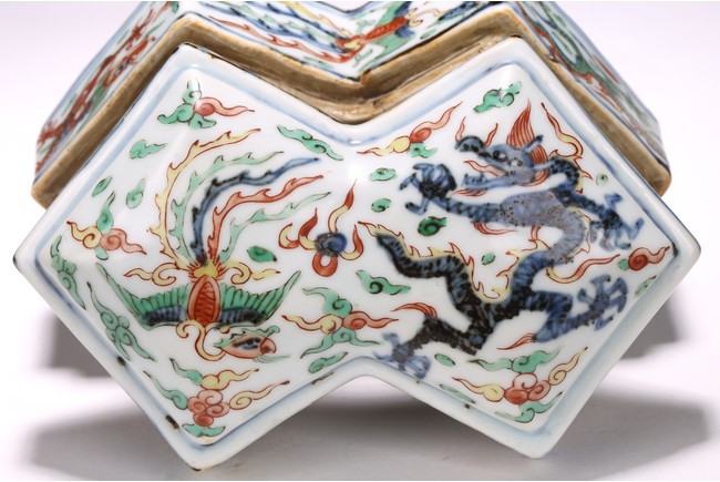 盒呈方勝形,子母口,上下結合緊密。該盒釉質亮白如玉,胎體制作精細。通體以五彩為飾,繪“龍鳳紋”,設色古雅,畫面筆致工整,填色濃艷,紋飾布局繁密。“大明萬歷年制”款識。