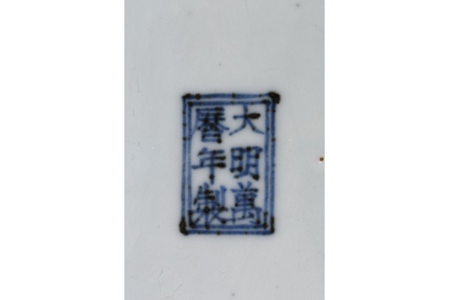 Ming Dynasty period. The domed top cover decorated with pair of confronting dragon and phoenix amidst ruyi-clouds, the sides painted with a band of triangular geometric pattern enclosing cloud motif, the lower body similarly decorated band of with dragon and phoenix, underside inscribed with six character Wanli mark in underglaze blue.