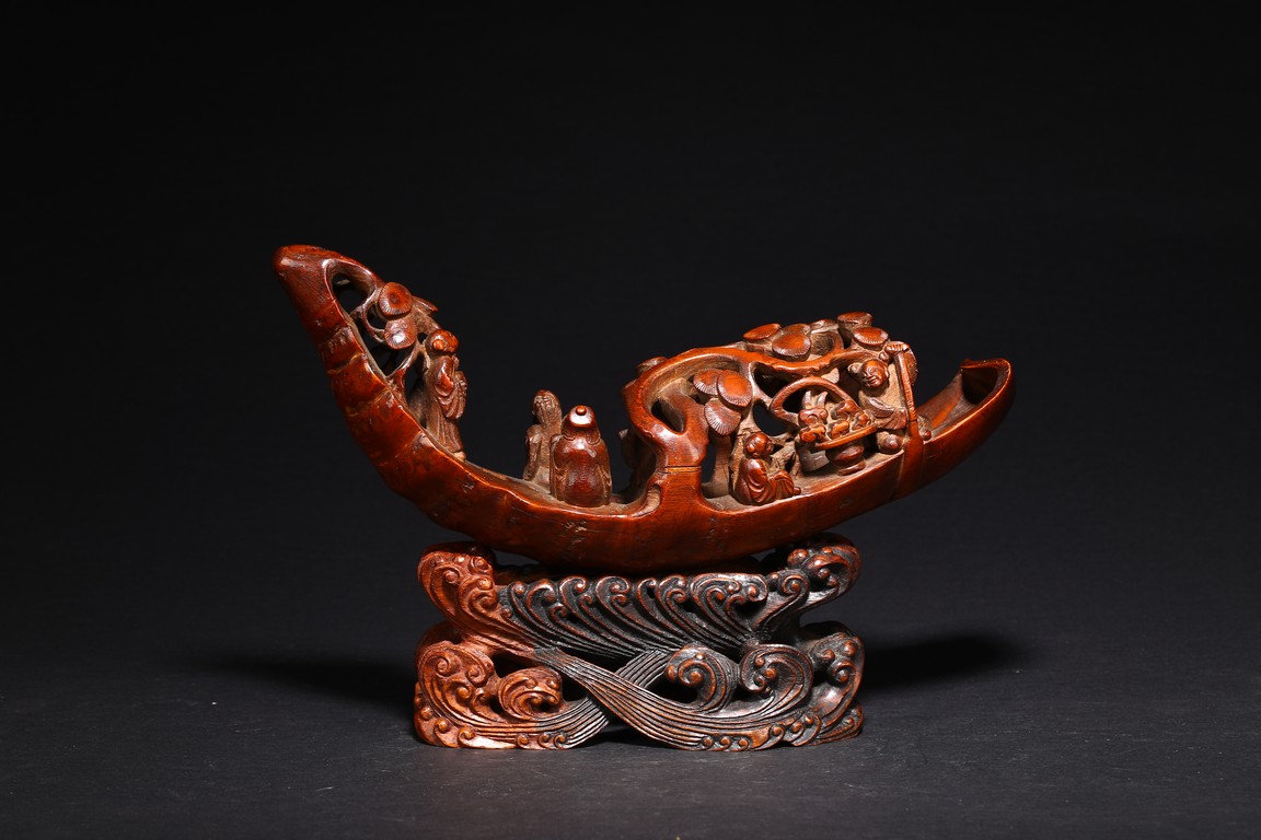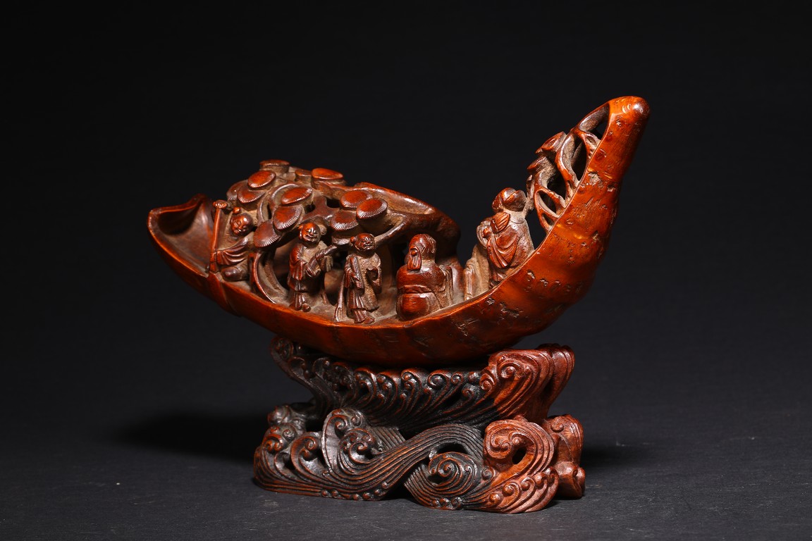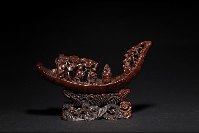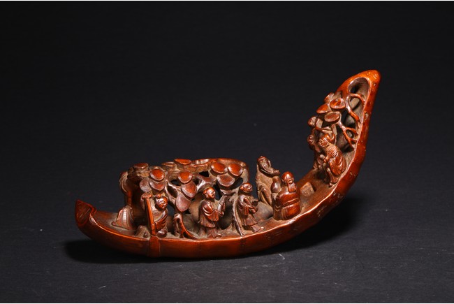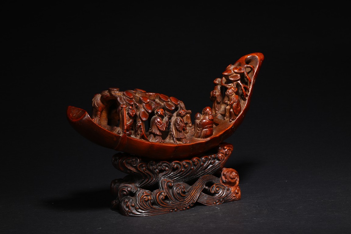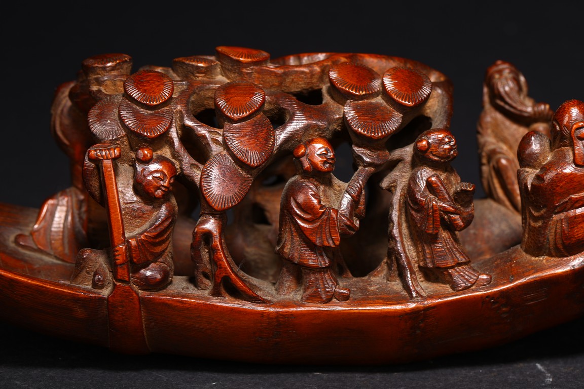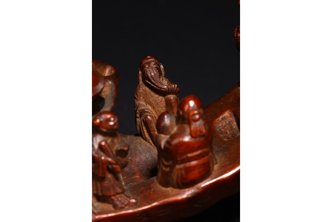 取天然竹根為材,依其本形鏤雕成舟,精工雕琢而成,造型秀雅,雕刻纖細生動,人物神態各異,或持扇,或持壽桃,或持卷書,或持松幹,奇巧玲瓏,刀工渾然天成,妙在人工匠意與造化天成的契合無間。海水紋底座與舟相呼應,仿佛身臨其境,活靈活現。