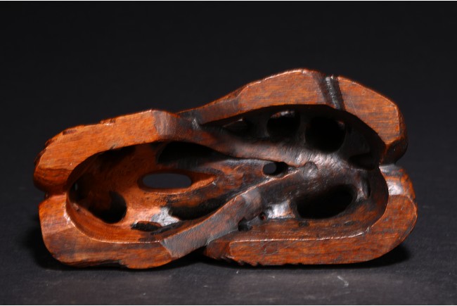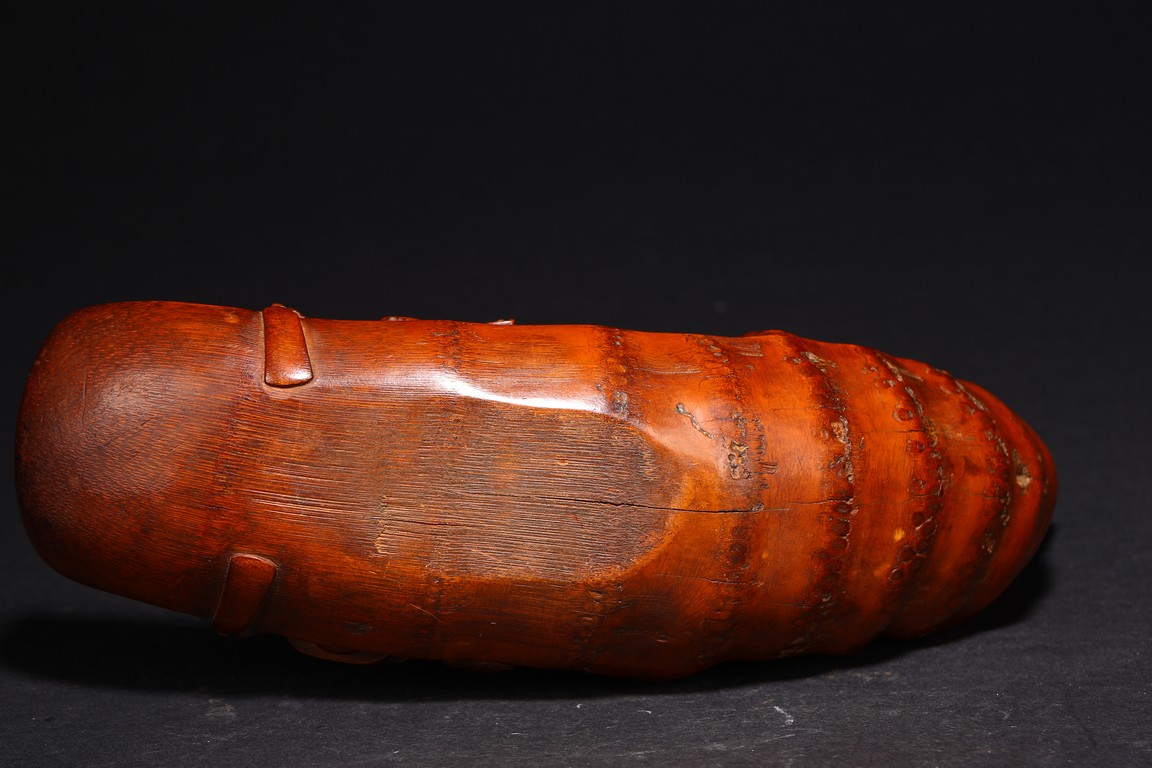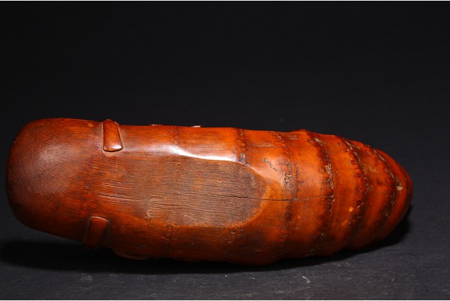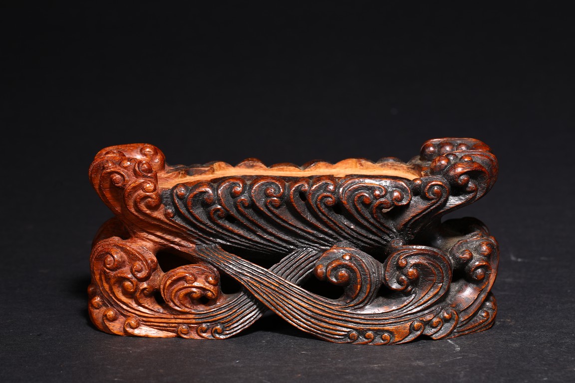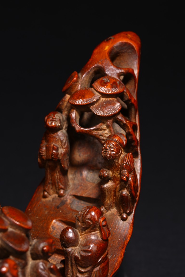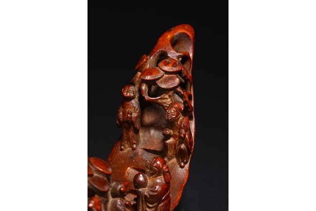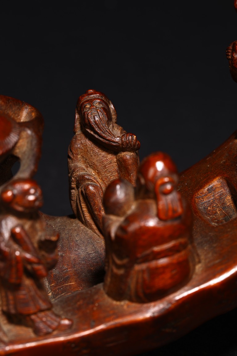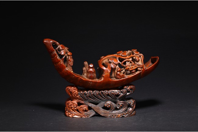 取天然竹根為材,依其本形鏤雕成舟,精工雕琢而成,造型秀雅,雕刻纖細生動,人物神態各異,或持扇,或持壽桃,或持卷書,或持松幹,奇巧玲瓏,刀工渾然天成,妙在人工匠意與造化天成的契合無間。海水紋底座與舟相呼應,仿佛身臨其境,活靈活現。