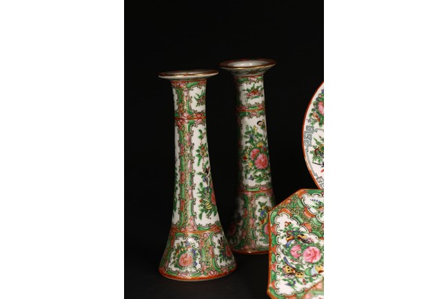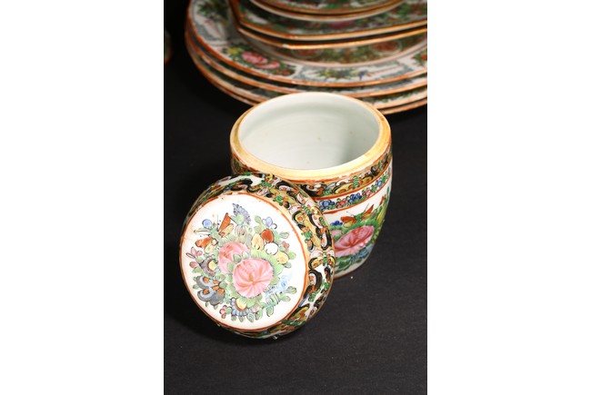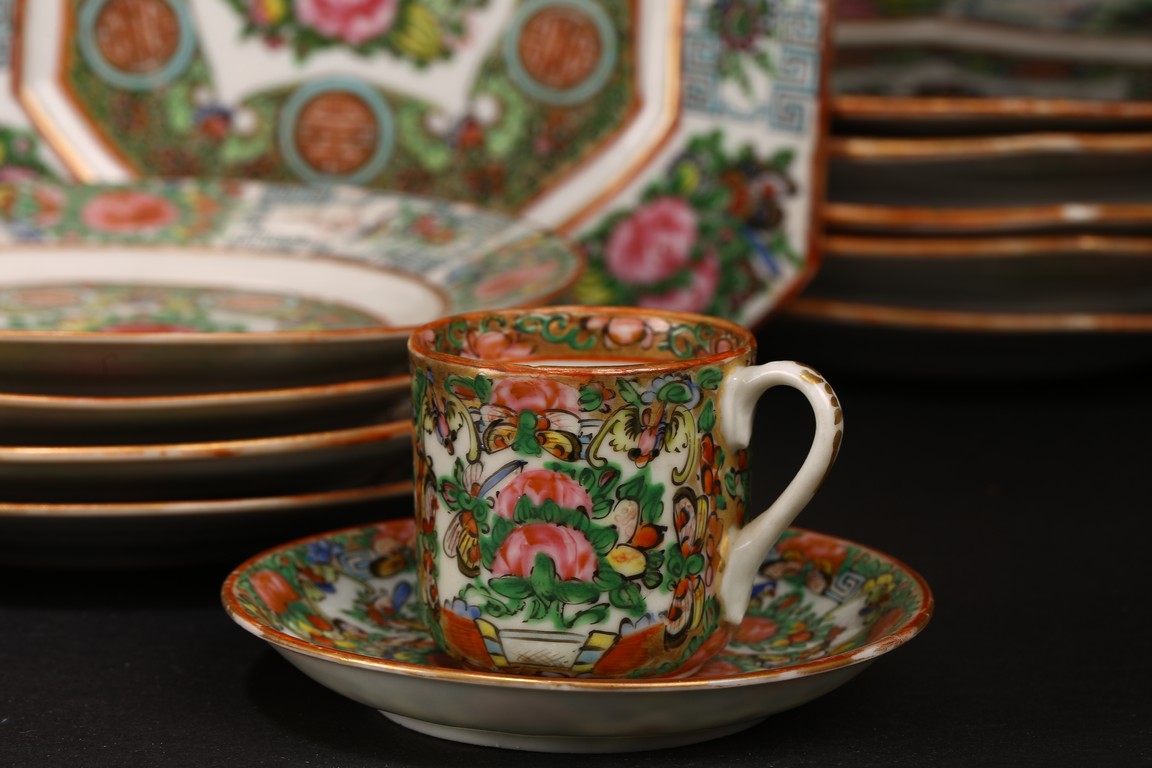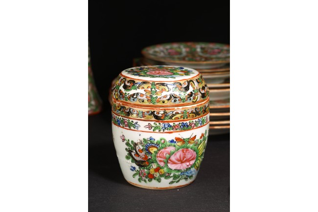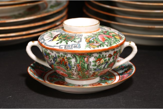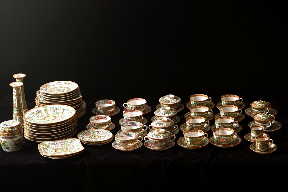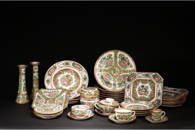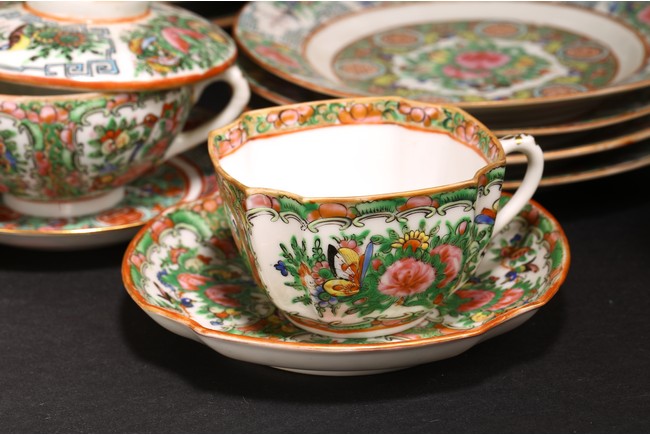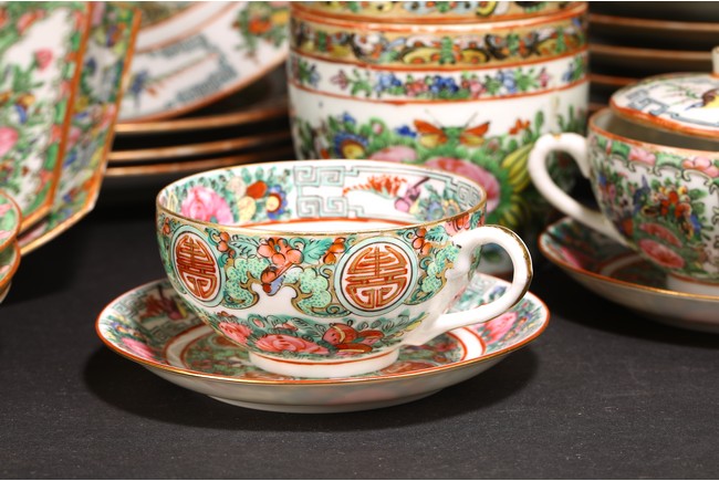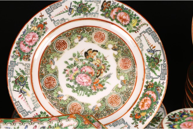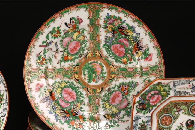 7 世紀以來歐洲人重華瓷,而清廷規定中國與歐洲賈舶的通商僅在廣州互市,為了方便按洋人的要求彩繪圖案,國內商人乃將景德鎮燒造的白瓷運至廣州,另雇工匠,仿照西洋或中國的傳統圖案彩繪,於珠江南岸開爐烘燒制成彩瓷,“廣彩”之名由此而來。其大量產品外銷,圖案裝飾性強。此組器具分別有“圓盤”“蓋碗”“方盤”“杯具”等,既充滿了異域情調,又富有東方古國的韻味。整體構圖緊密、色彩濃艷造型優美,彩繪发色純正,極具實用性及觀賞性。來源: 阿拉斯加州Yale女士私人收藏 Provenance: Property from the collection of Ms. Yale, Alaska