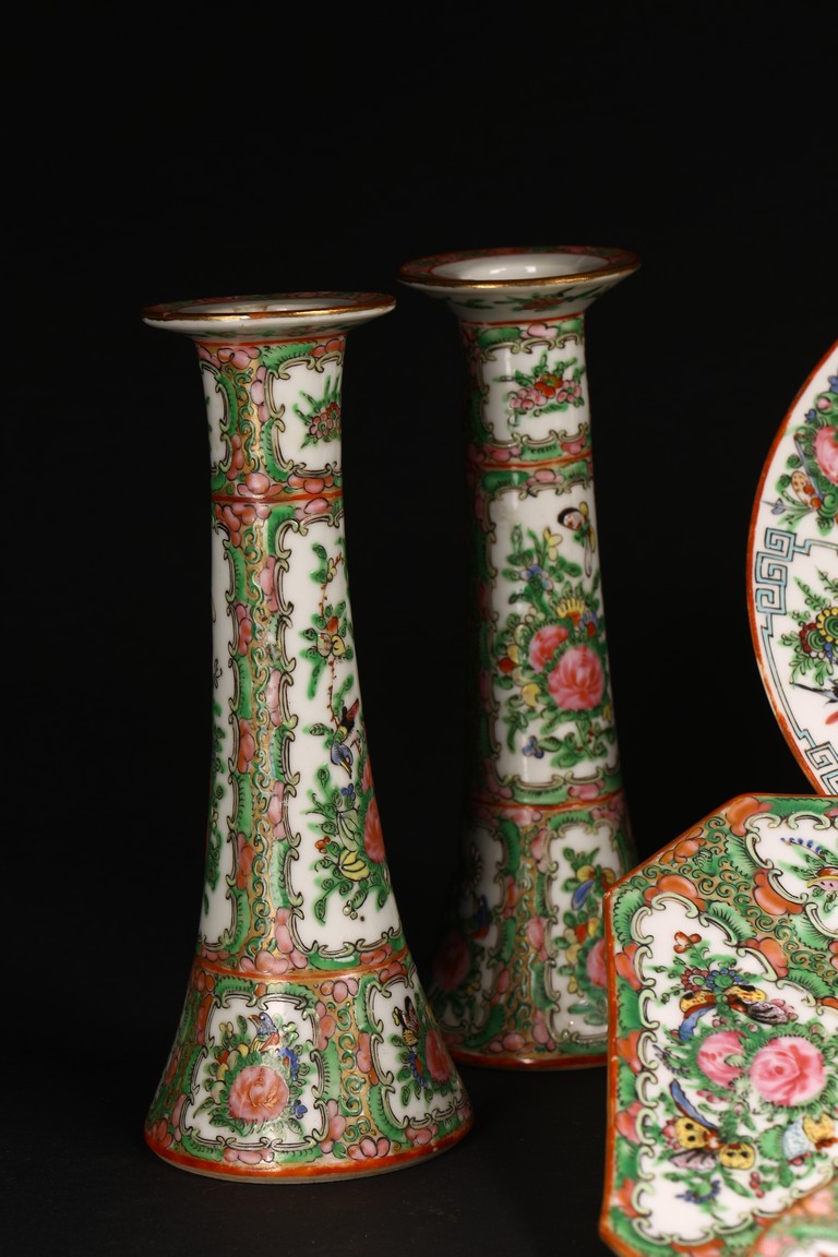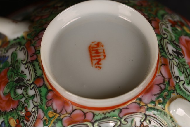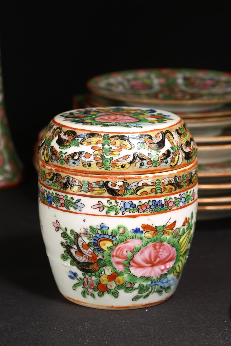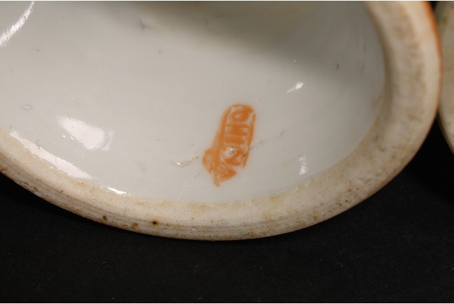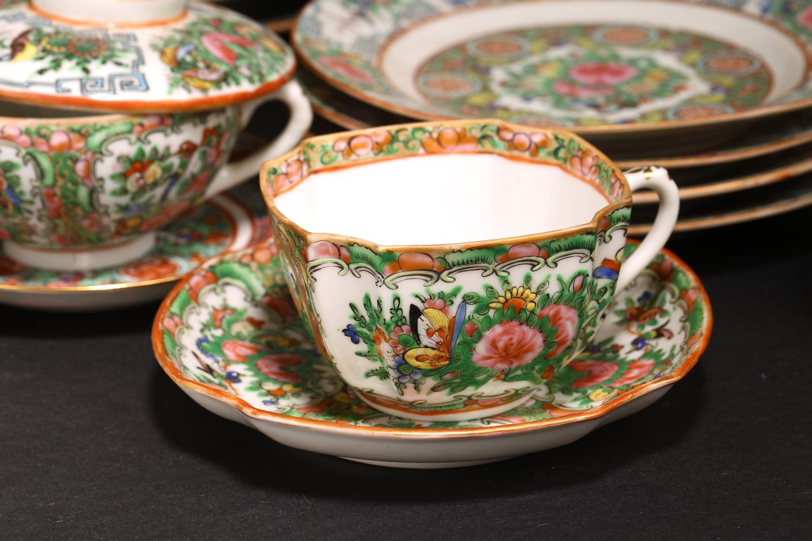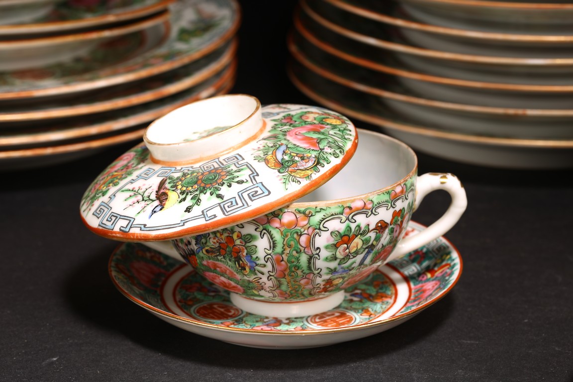 7 世紀以來歐洲人重華瓷,而清廷規定中國與歐洲賈舶的通商僅在廣州互市,為了方便按洋人的要求彩繪圖案,國內商人乃將景德鎮燒造的白瓷運至廣州,另雇工匠,仿照西洋或中國的傳統圖案彩繪,於珠江南岸開爐烘燒制成彩瓷,“廣彩”之名由此而來。其大量產品外銷,圖案裝飾性強。此組器具分別有“圓盤”“蓋碗”“方盤”“杯具”等,既充滿了異域情調,又富有東方古國的韻味。整體構圖緊密、色彩濃艷造型優美,彩繪发色純正,極具實用性及觀賞性。來源: 阿拉斯加州Yale女士私人收藏 Provenance: Property from the collection of Ms. Yale, Alaska