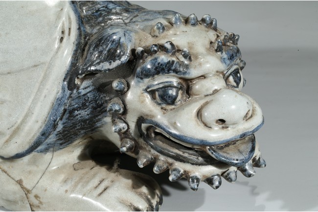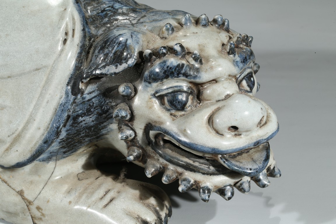 Modelled standing foursquare, the large head with bulging eyes and large snout, tails and mane in underglaze blue.