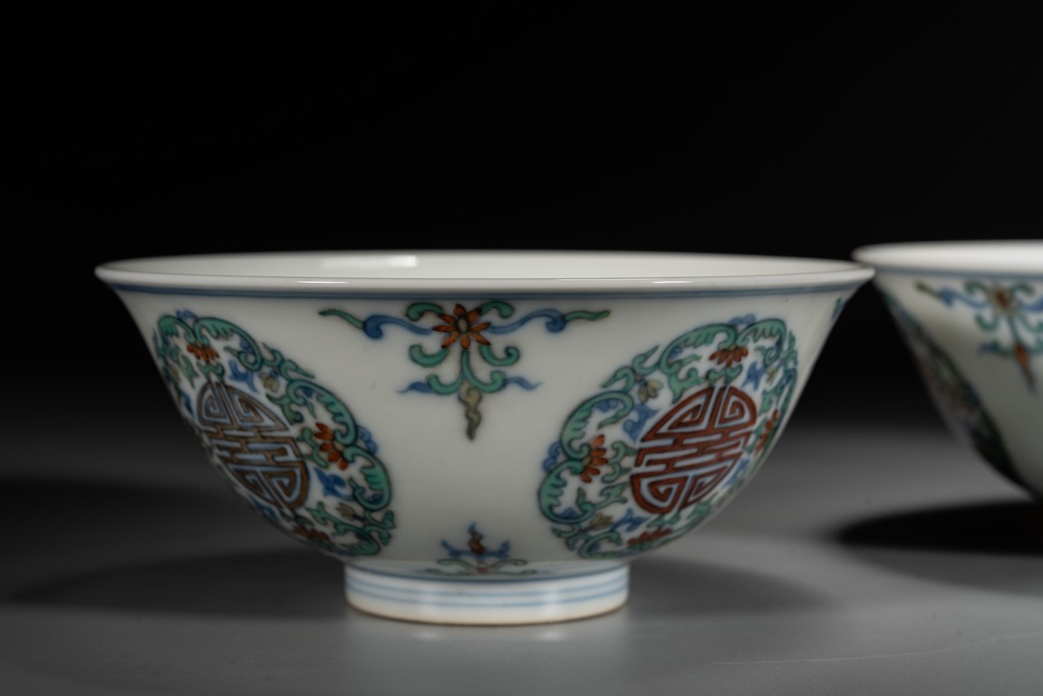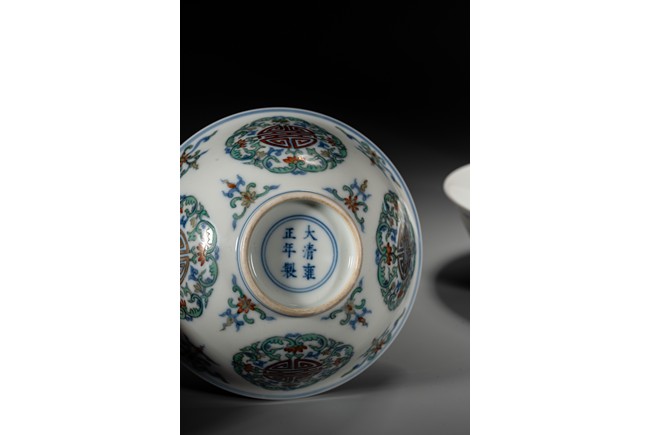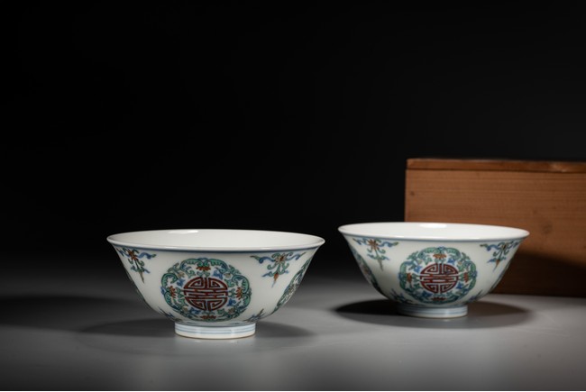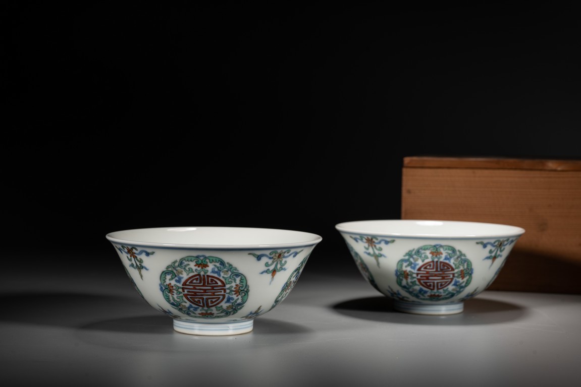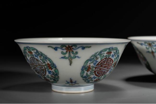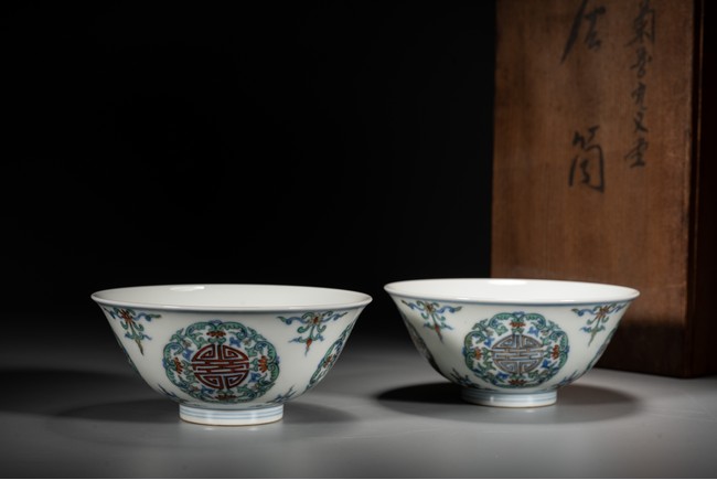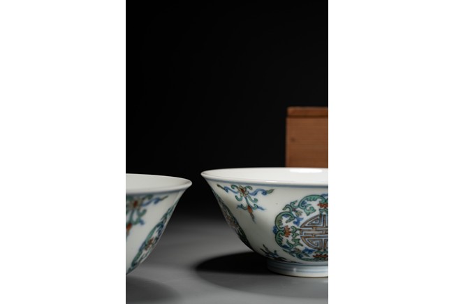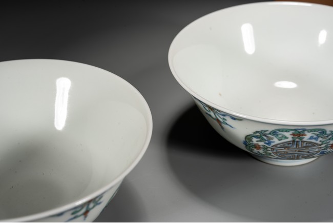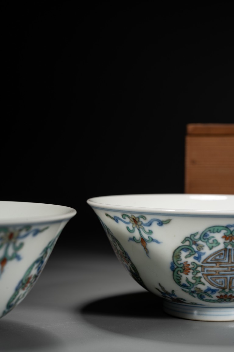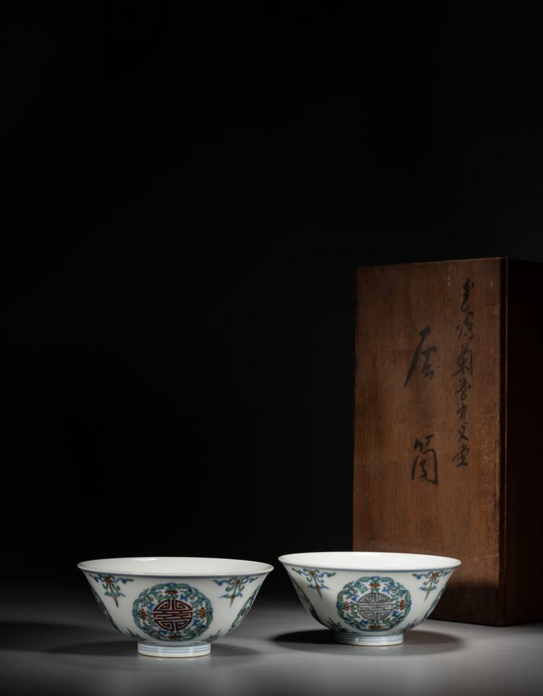 雍正鬥彩以其凈雅清瑩的釉色、逸麗清新的繪工、別具一格的構圖獨步古今。所造之器,輪廓造型拿捏精妙,紋飾著色脫離庸塵,其審美品位之高,令無數藏家為其傾倒。此對碗造型典雅精巧,敞口,通體施釉瑩潤平滑,外壁繪“團壽紋”,紋飾以淡描青花及綠彩勾勒輪廓,青花線條纖細流暢,整體填彩精準,釉上填紅、黃、綠等多彩,色彩淡雅,筆觸細膩,襯托出紋飾的清雅柔麗,極為精彩新穎,釉上、釉下層次感強烈,給人以清新、明快之感,有著極強的藝術感染力。 “大清雍正年制”款識,成對
