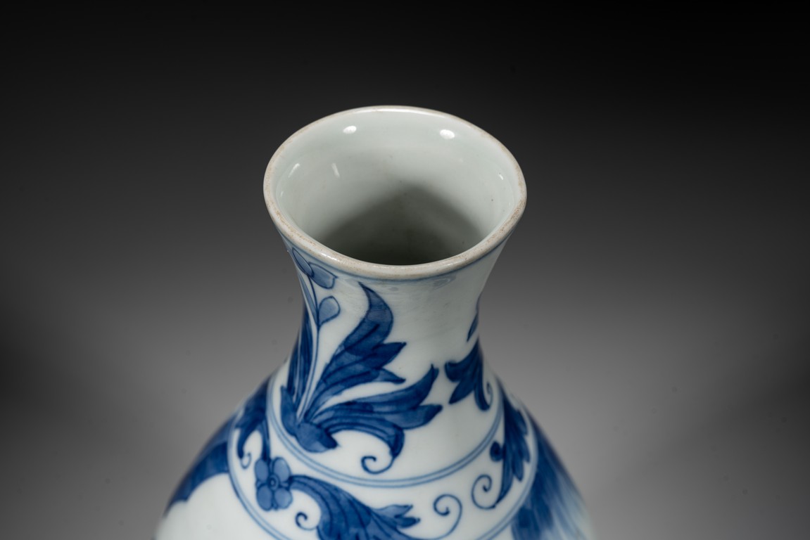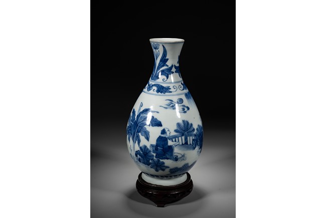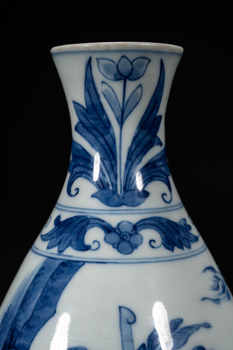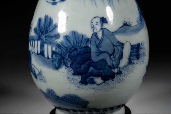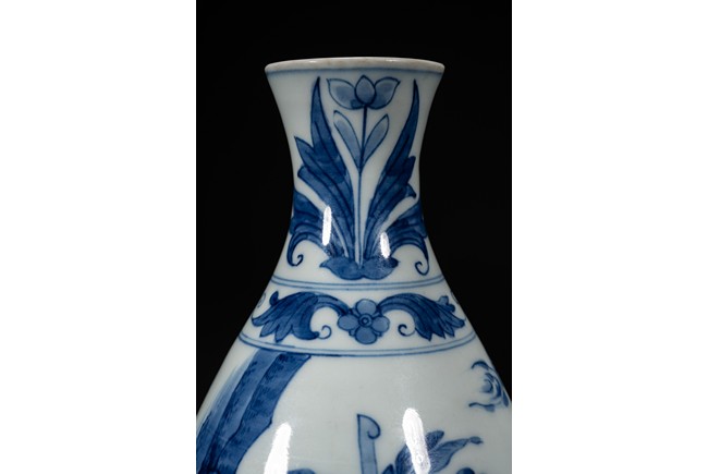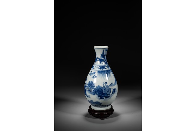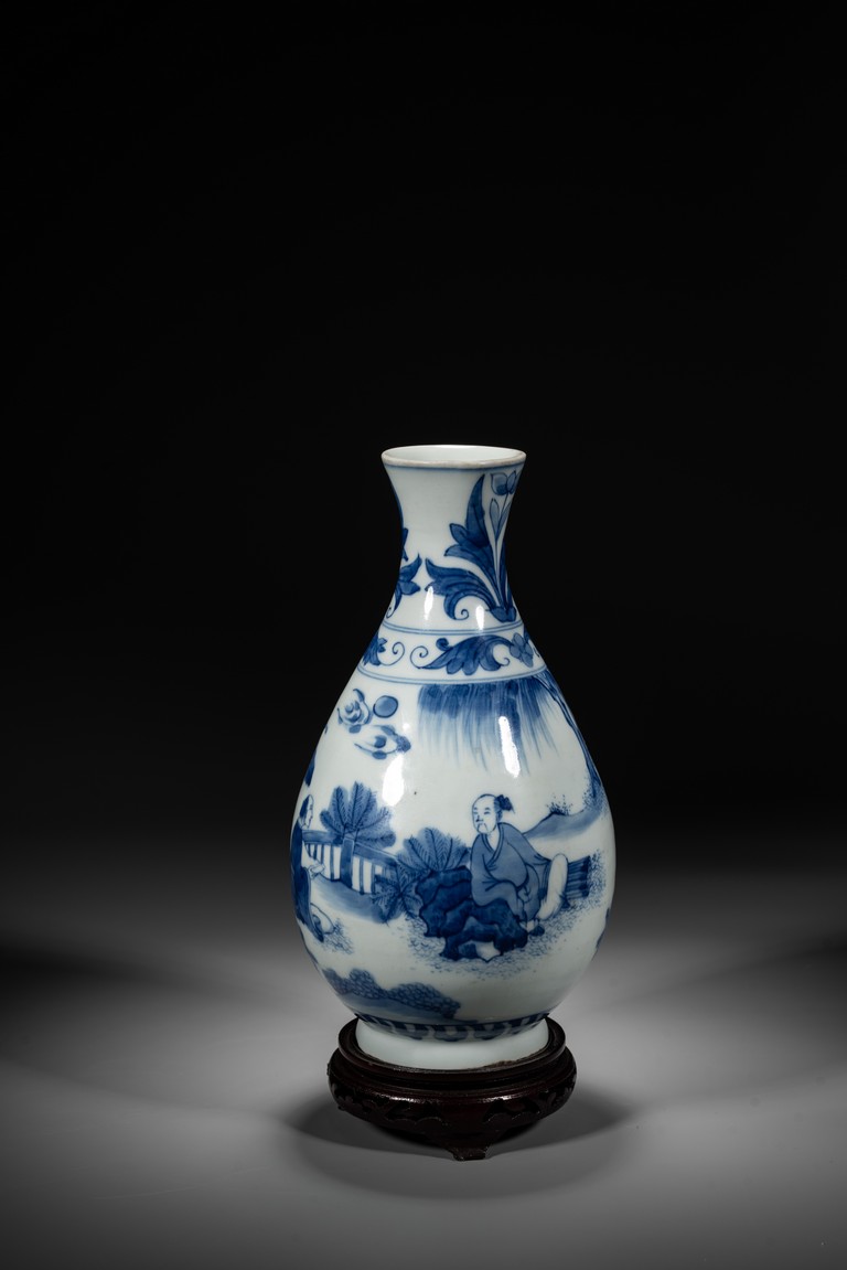此玉壺春瓶為傳統器型延續,撇口,束頸,長弧腹,圈足。通體以青花繪制四層紋飾,分別為花卉紋、纏枝紋、腹部開光通景繪高士、欄桿、山石、樹木等,下部為變形蓮瓣紋,紋飾精美,繪制精細,構圖疏密有致。胎質細膩潔白,釉面潔凈亮潤,青花发色菁麗明快,器型規整端莊,保存完好,值得收藏。