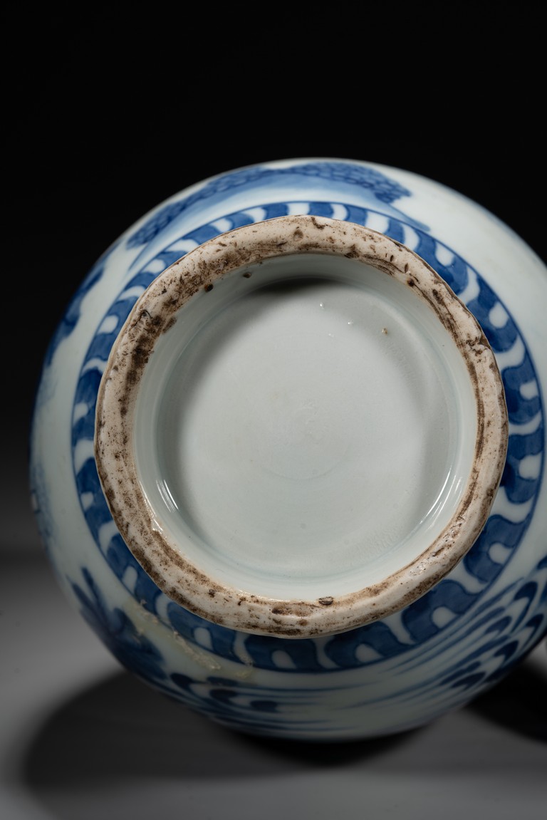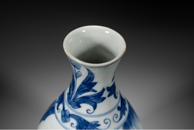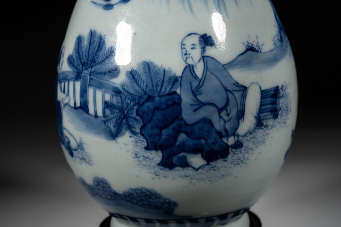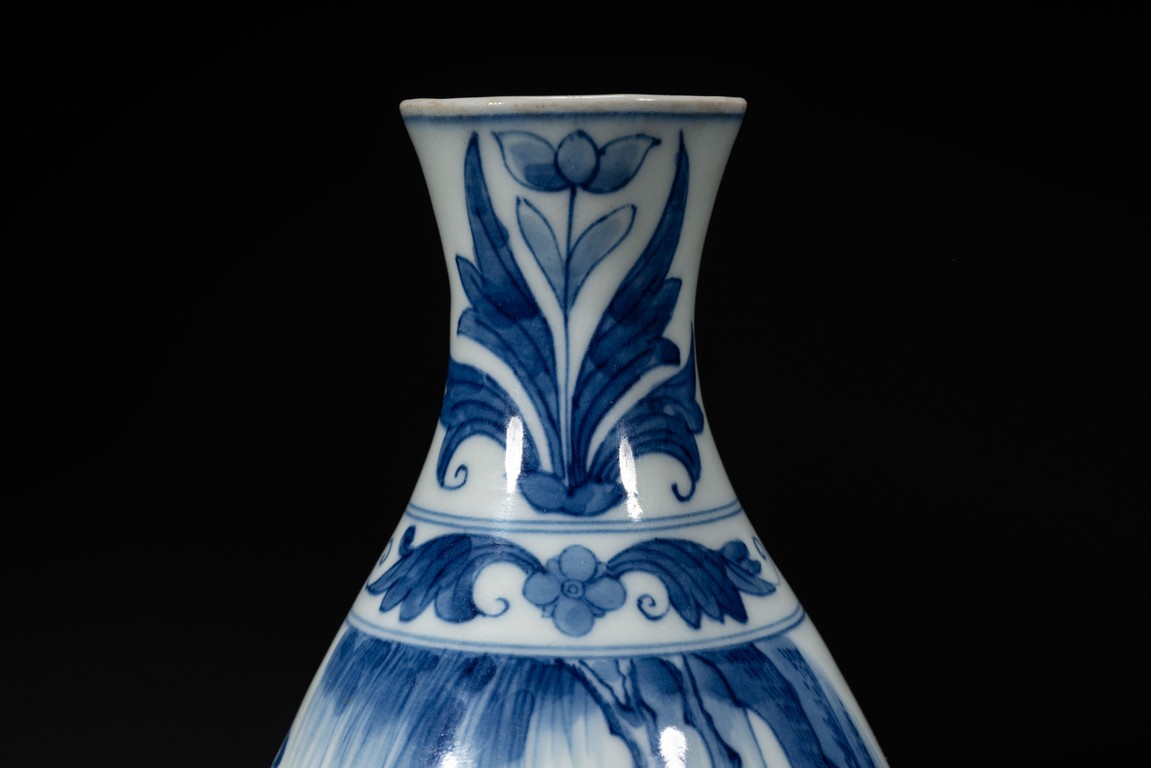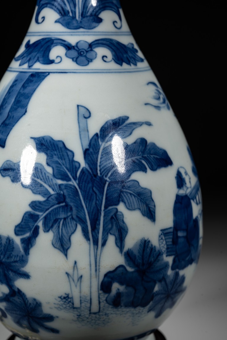 此玉壺春瓶為傳統器型延續,撇口,束頸,長弧腹,圈足。通體以青花繪制四層紋飾,分別為花卉紋、纏枝紋、腹部開光通景繪高士、欄桿、山石、樹木等,下部為變形蓮瓣紋,紋飾精美,繪制精細,構圖疏密有致。胎質細膩潔白,釉面潔凈亮潤,青花发色菁麗明快,器型規整端莊,保存完好,值得收藏。
