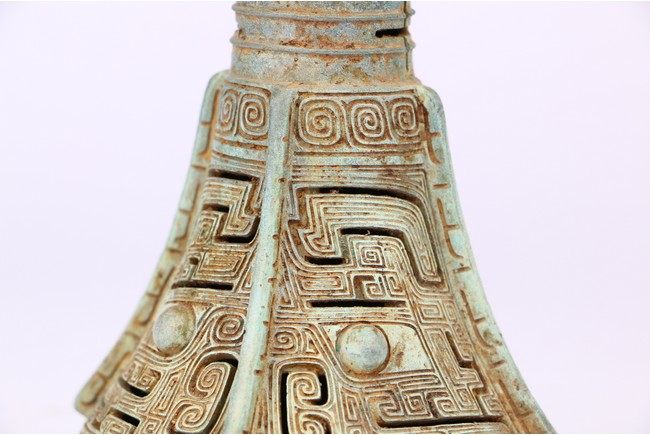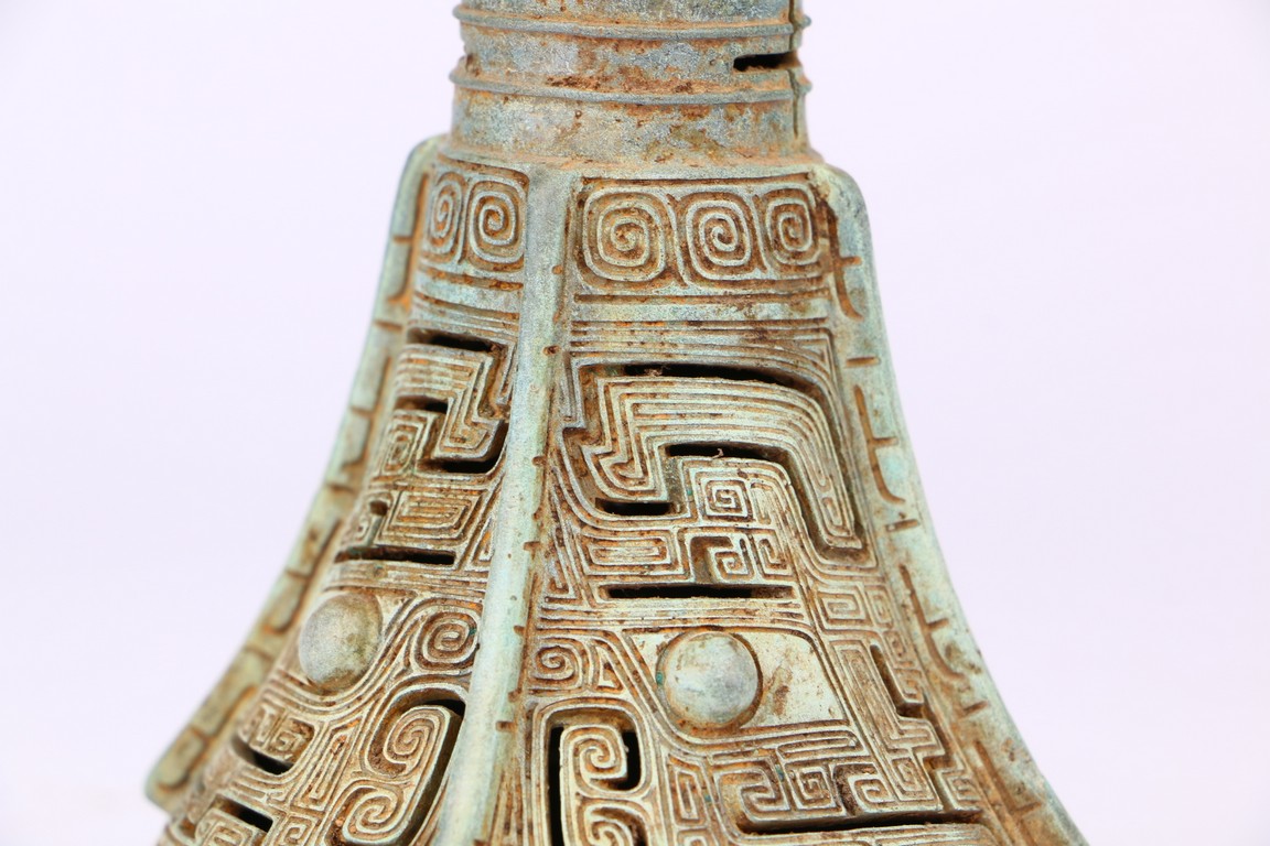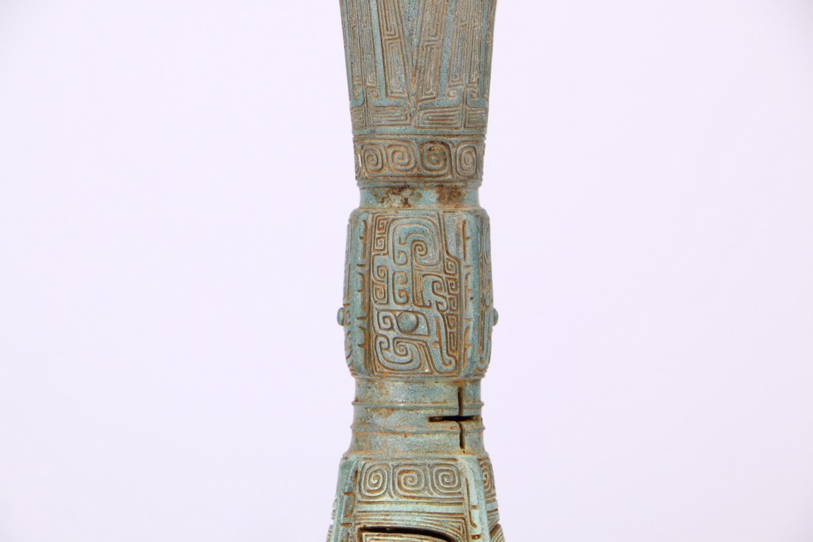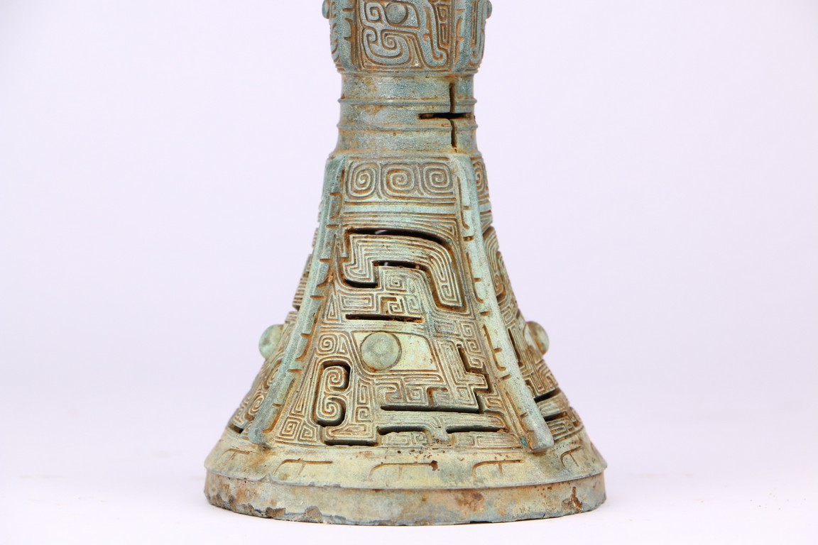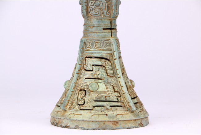 Western Zhou Dynasty period. The neck flaring to a wide mouth, cast with tapering blades extending to the rim, the central section cast with taotie masks, the spreading foot reticulated to depict mythical beast masks divided by raised flanges.