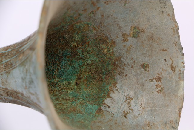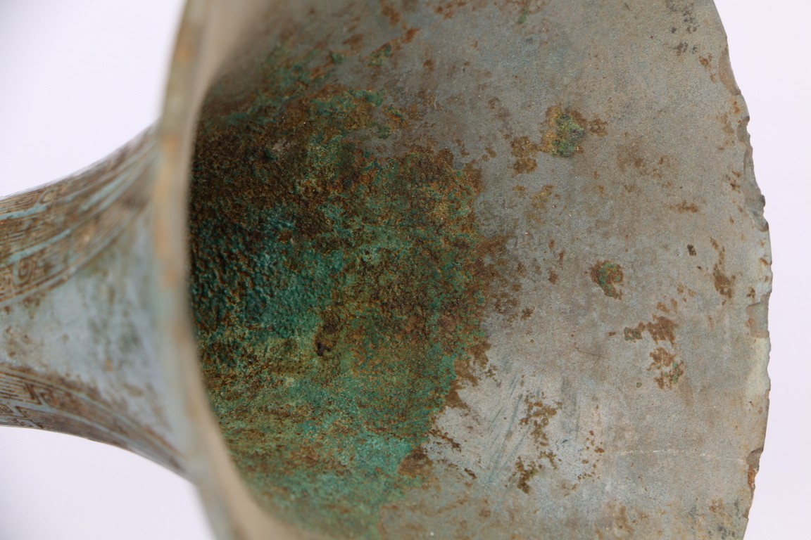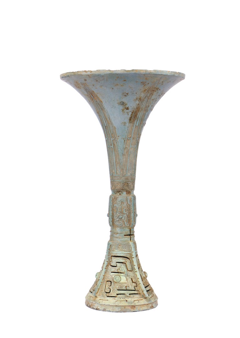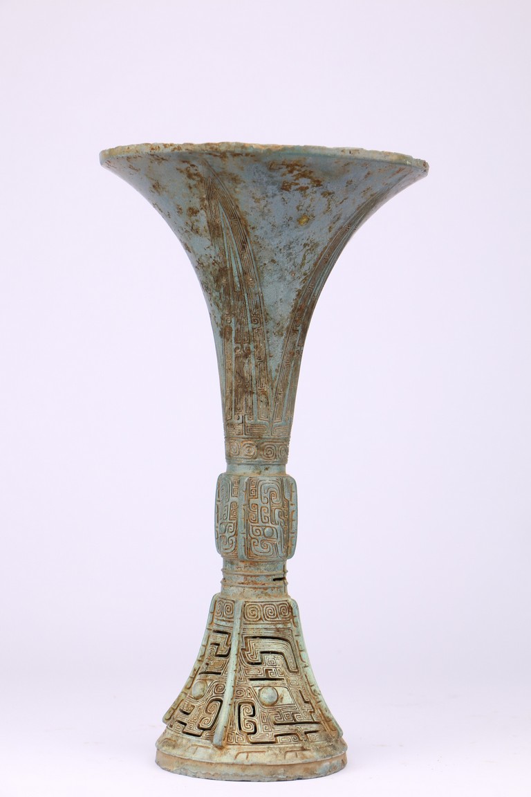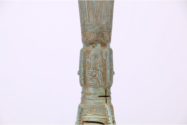 Western Zhou Dynasty period. The neck flaring to a wide mouth, cast with tapering blades extending to the rim, the central section cast with taotie masks, the spreading foot reticulated to depict mythical beast masks divided by raised flanges.