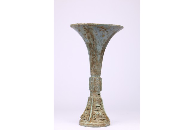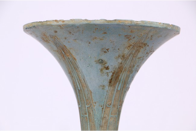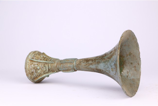 觚,是中國古代一種用於飲酒的容器,也用作禮器。器身份為三部分,上部敞口,頸較長, 中間腹部略鼓,下部圈足外撇。腹部及下部各飾以四條突起的扉棱 。上部飾以微突蕉葉紋, 腹部飾以“鳳鳥紋”,下部飾“迴紋”及“獸面紋”。整器造型俊俏挺拔,沉穩端莊,紋飾 繁縟,高雅精緻,肅穆神秘。