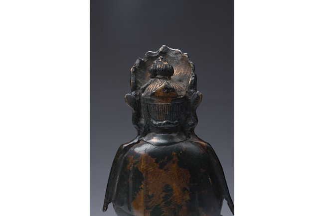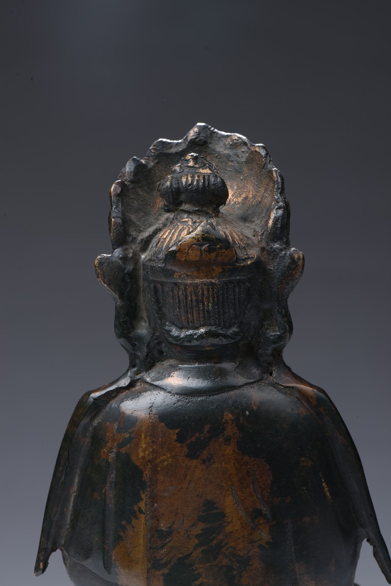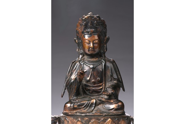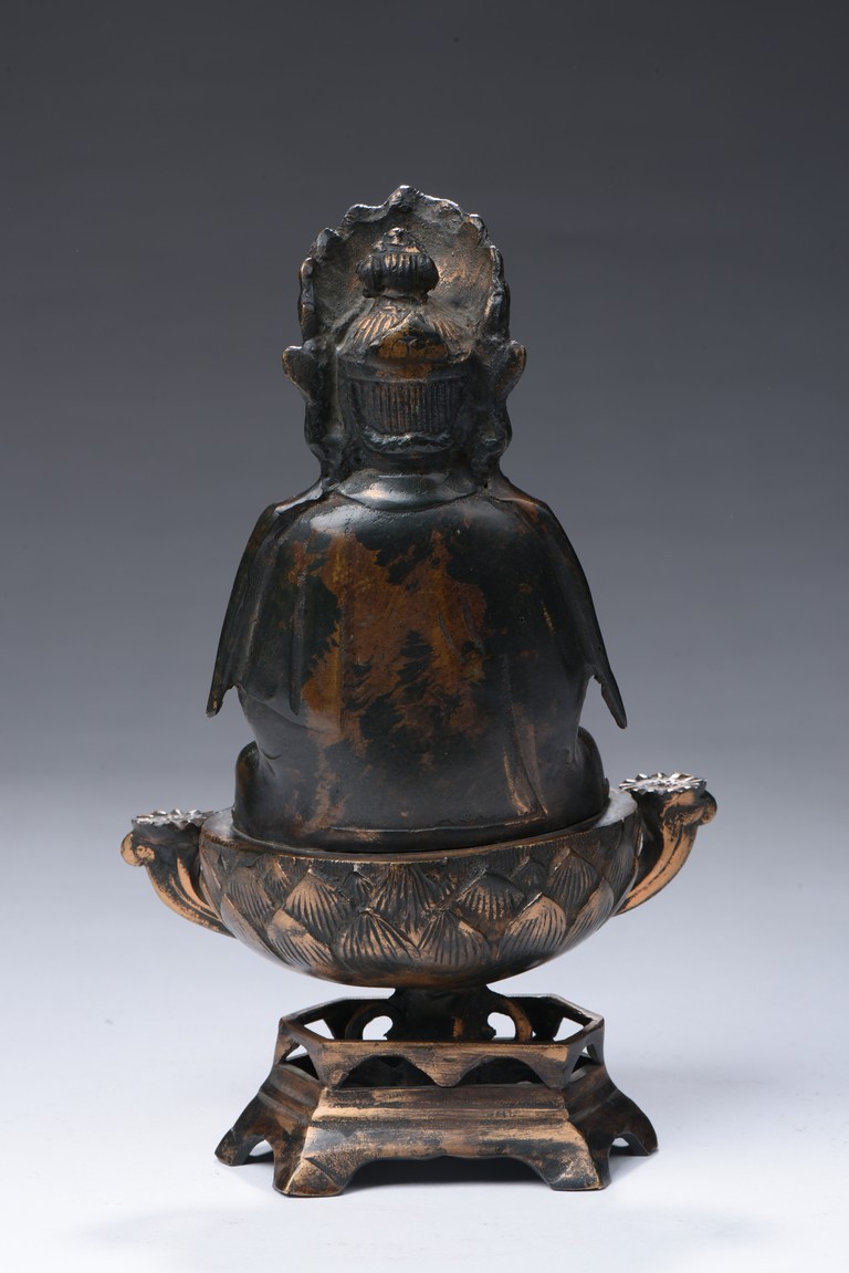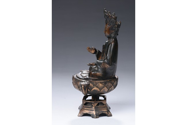Qing Dynasty period. Shown seated on a lotus throne supported by a stand, the bodhisattva is shown in dhyanasana, hands in abhaya mudra , wearing long and voluminous robe, chest adorned with beaded jewelry, the face shown in meditative expression.