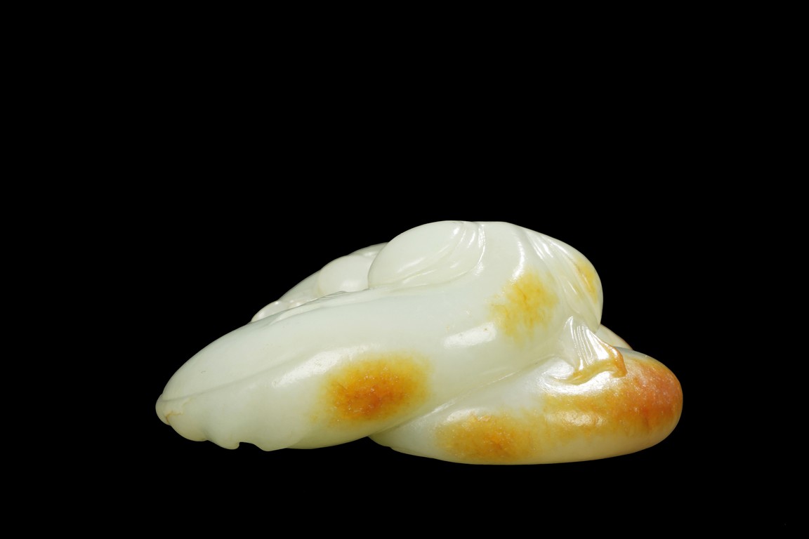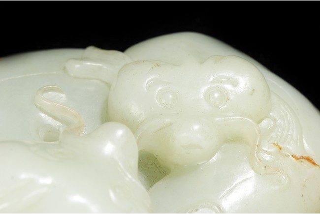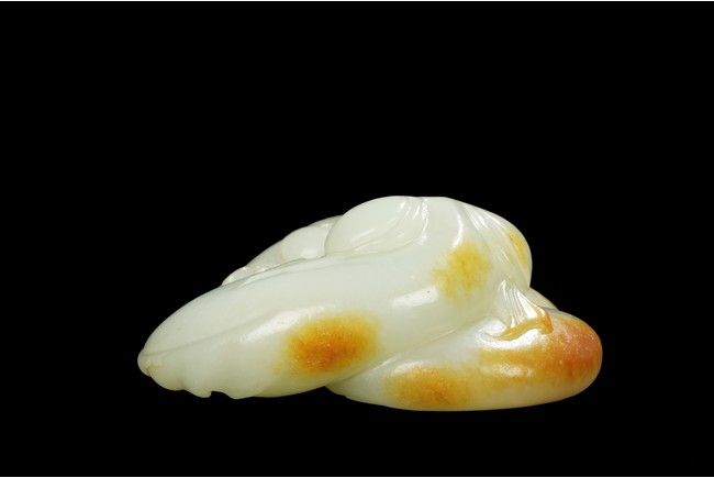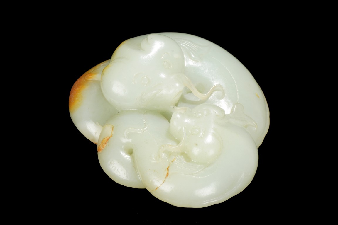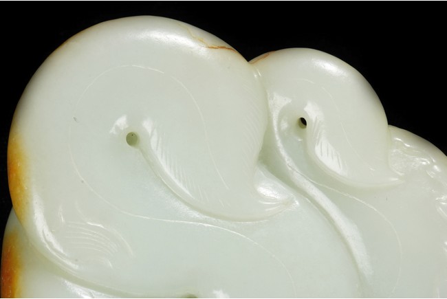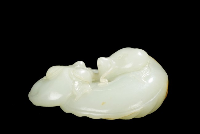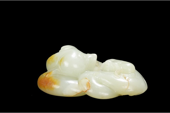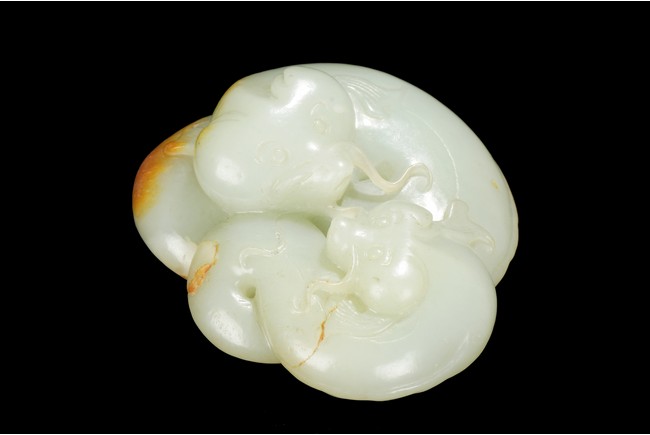 The two silver carps curled and huddled next to each other, one slightly larger than the other, both with prominent whiskers and fins. The stone of creamy white with translucency, and a few small russet patches.