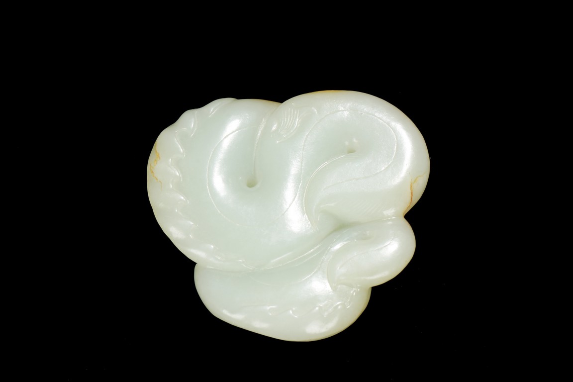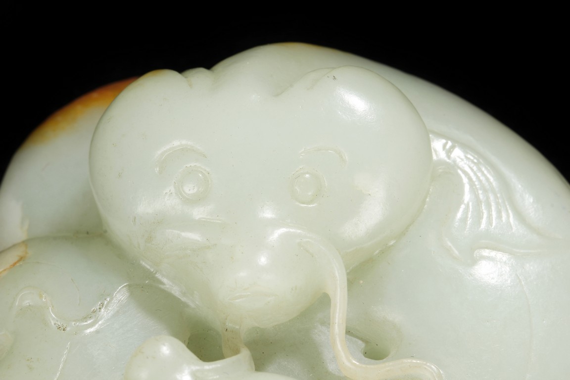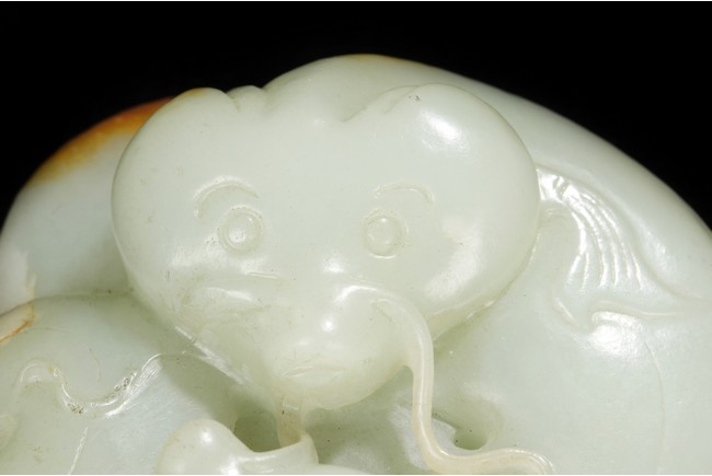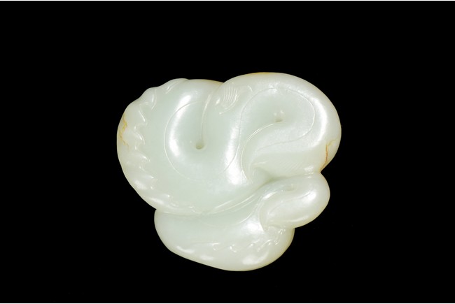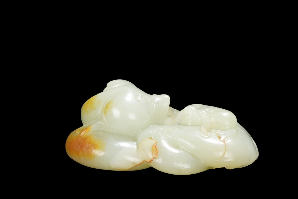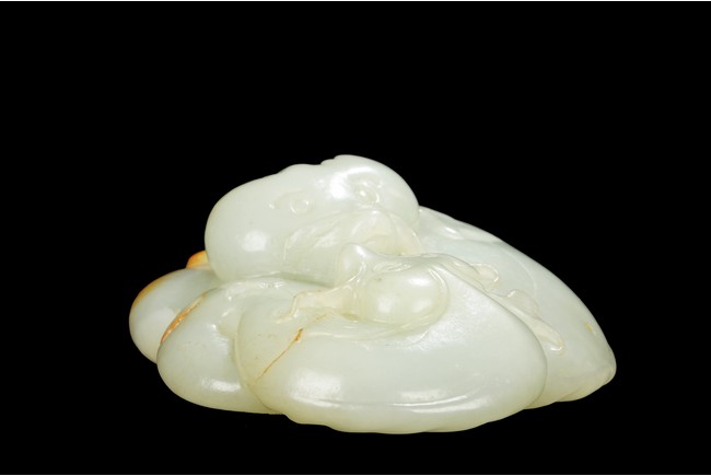The two silver carps curled and huddled next to each other, one slightly larger than the other, both with prominent whiskers and fins. The stone of creamy white with translucency, and a few small russet patches.