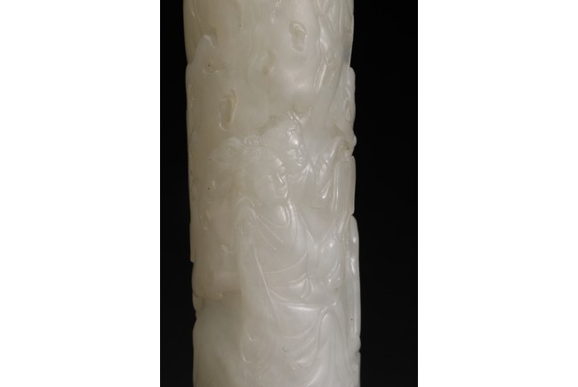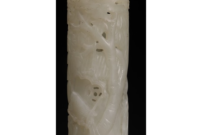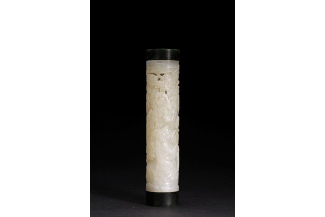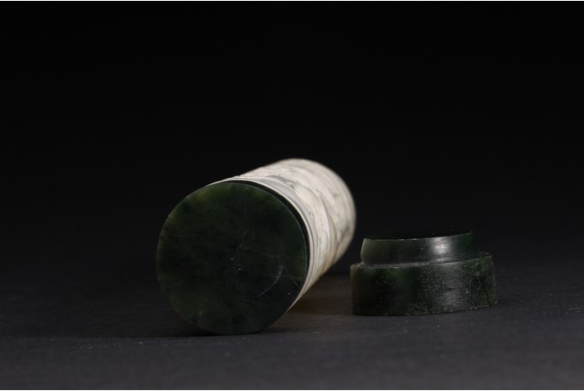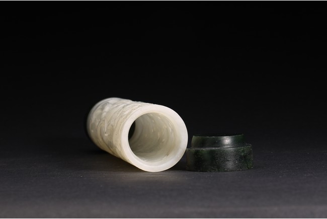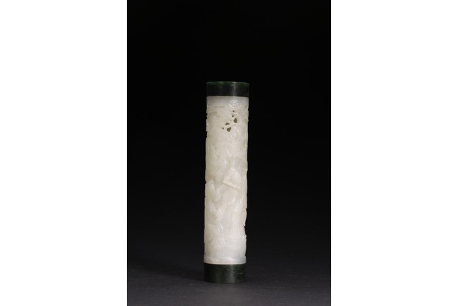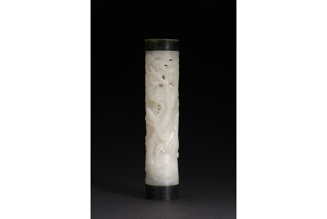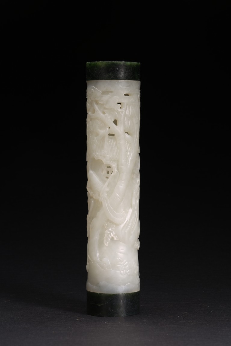 Of cylindrical form, carved and reticulated in relief with landscape scene, with green jade cover on both ends.