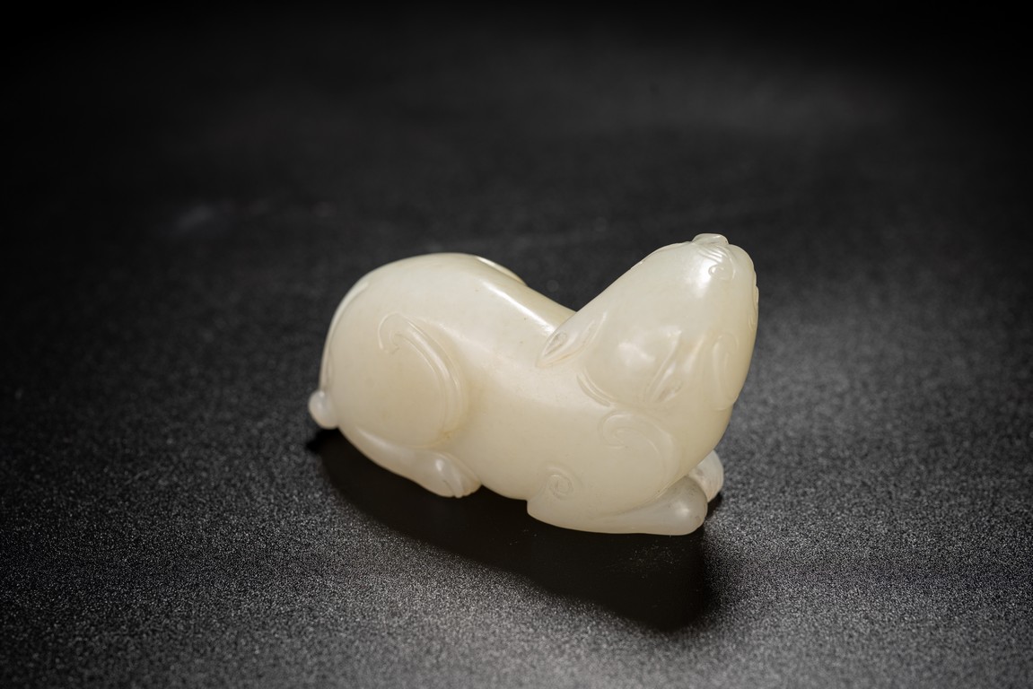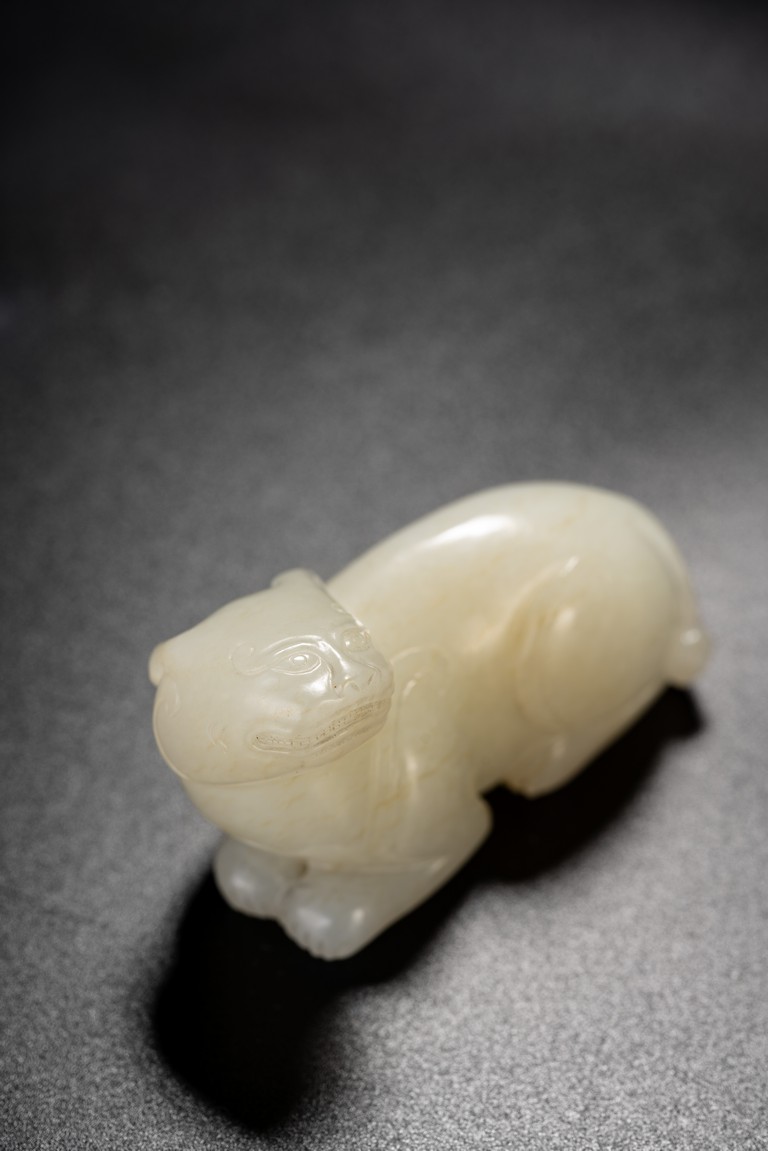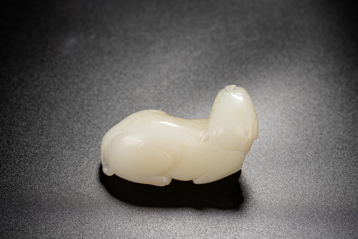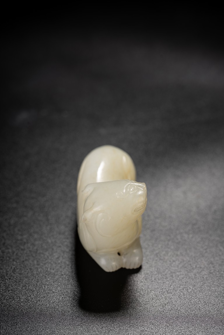和闐白玉雕琢,玉質溫潤,手感極佳。圓雕一瑞獸,伏坐於地,四肢觸地,後肢蜷於臀下,身形敦實,背脊粗壯,尾巴分兩側,表情憨態可掬,牙齒雕琢細致。整器大小適中,可把玩,可做紙鎮,亦可陳設於案頭。