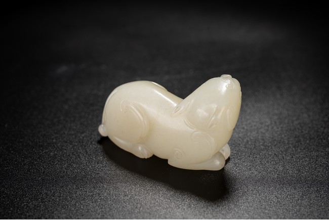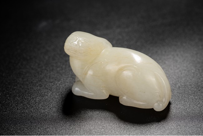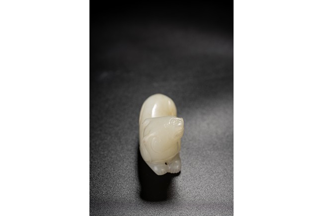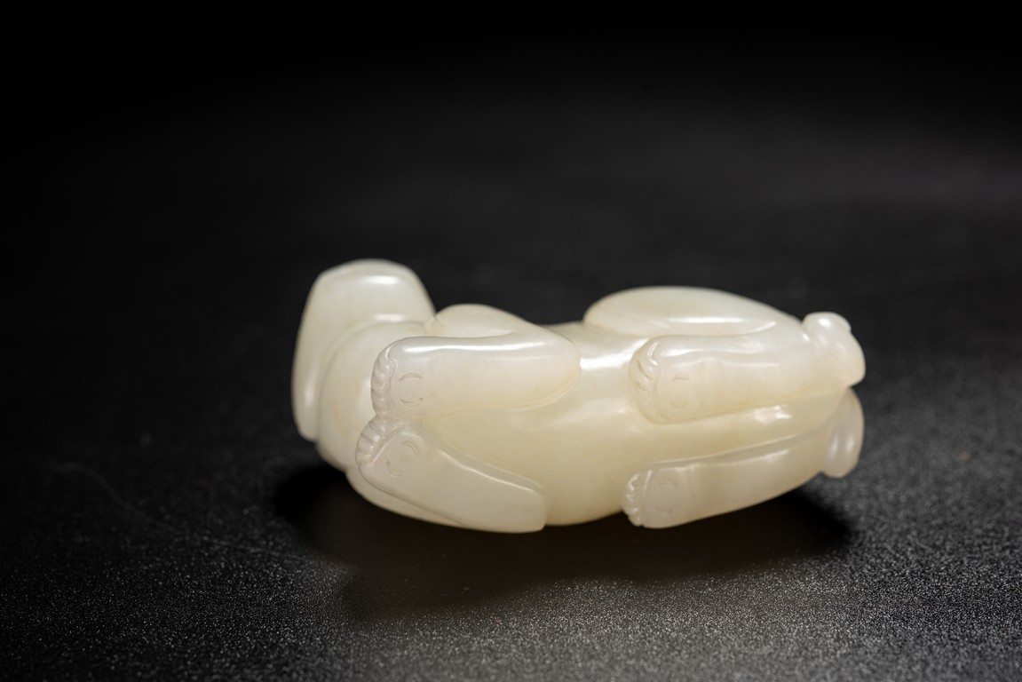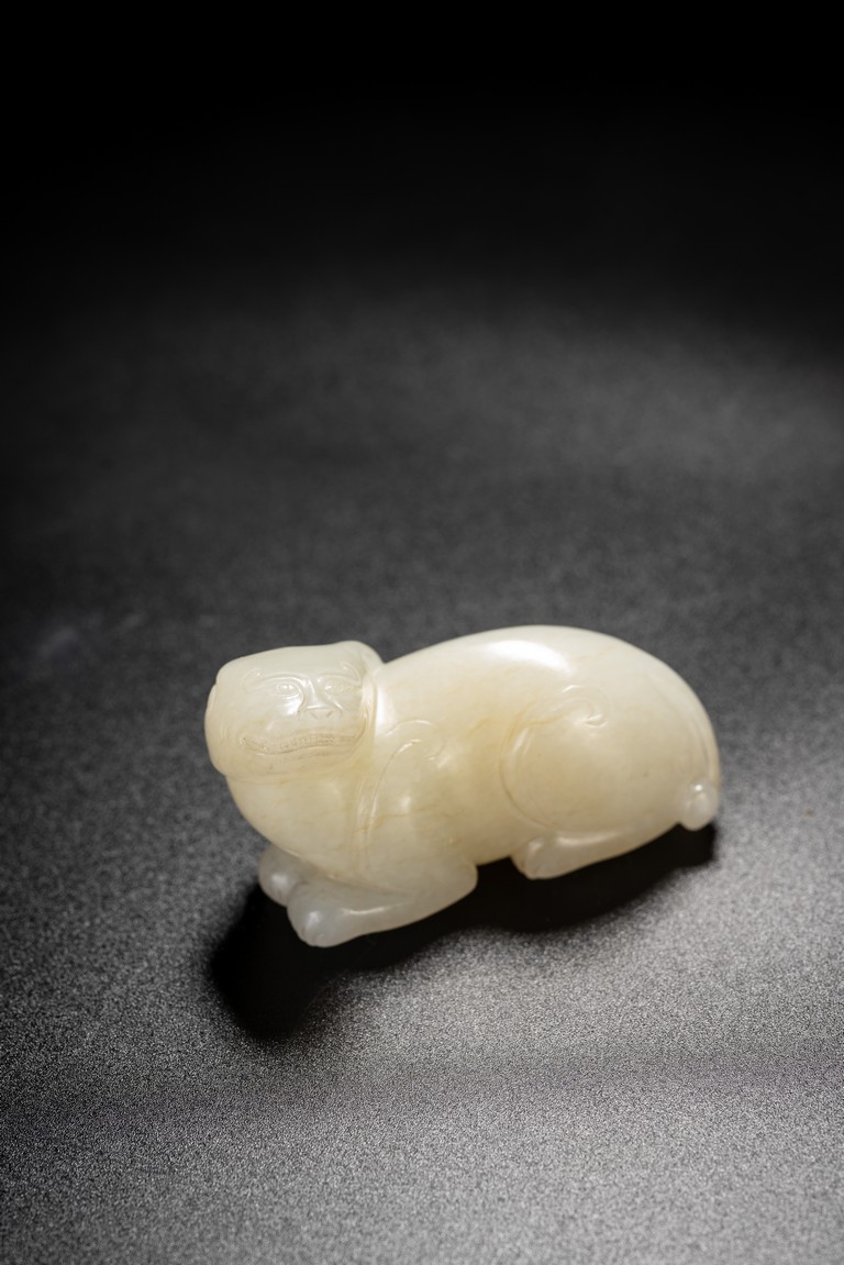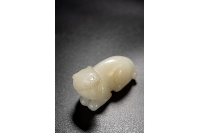 和闐白玉雕琢,玉質溫潤,手感極佳。圓雕一瑞獸,伏坐於地,四肢觸地,後肢蜷於臀下,身形敦實,背脊粗壯,尾巴分兩側,表情憨態可掬,牙齒雕琢細致。整器大小適中,可把玩,可做紙鎮,亦可陳設於案頭。