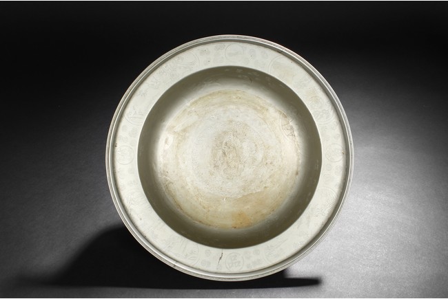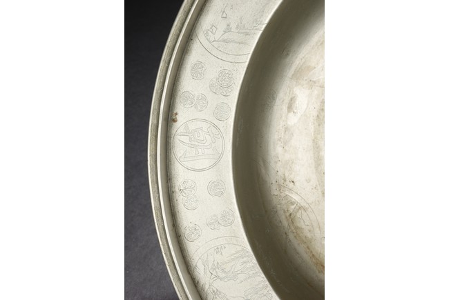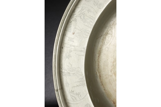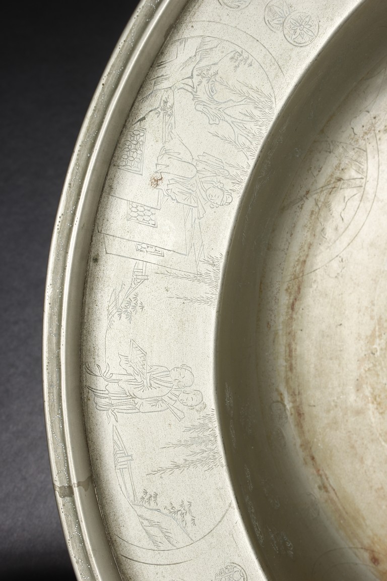Of circular form, the interior incised with figures and the mouth rim with character.