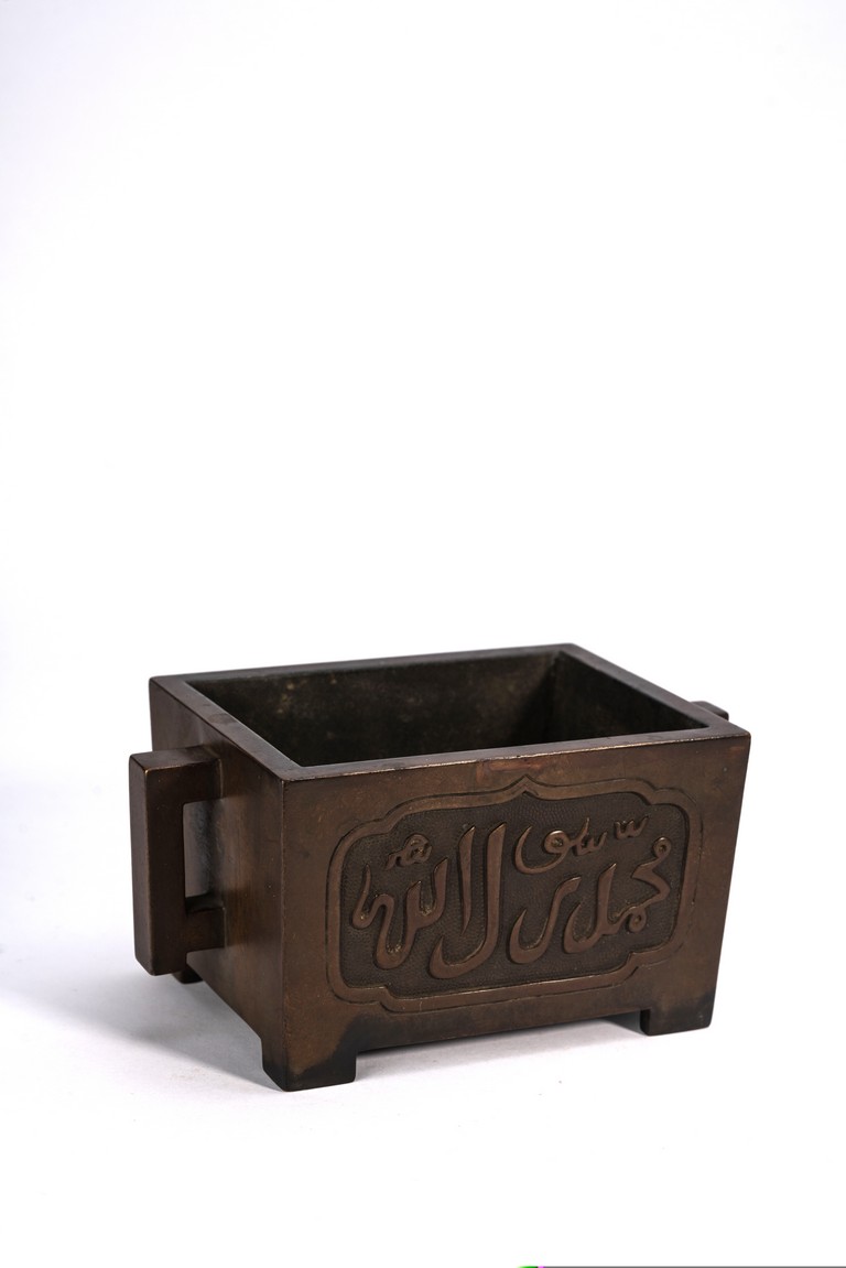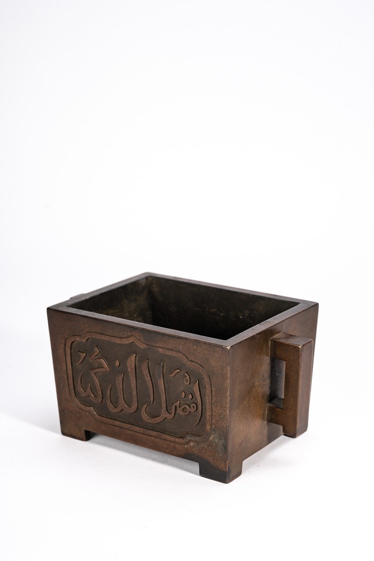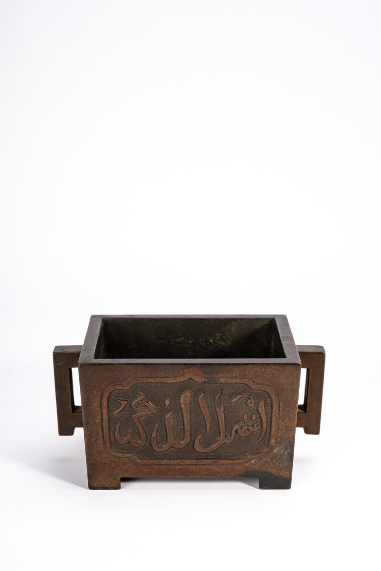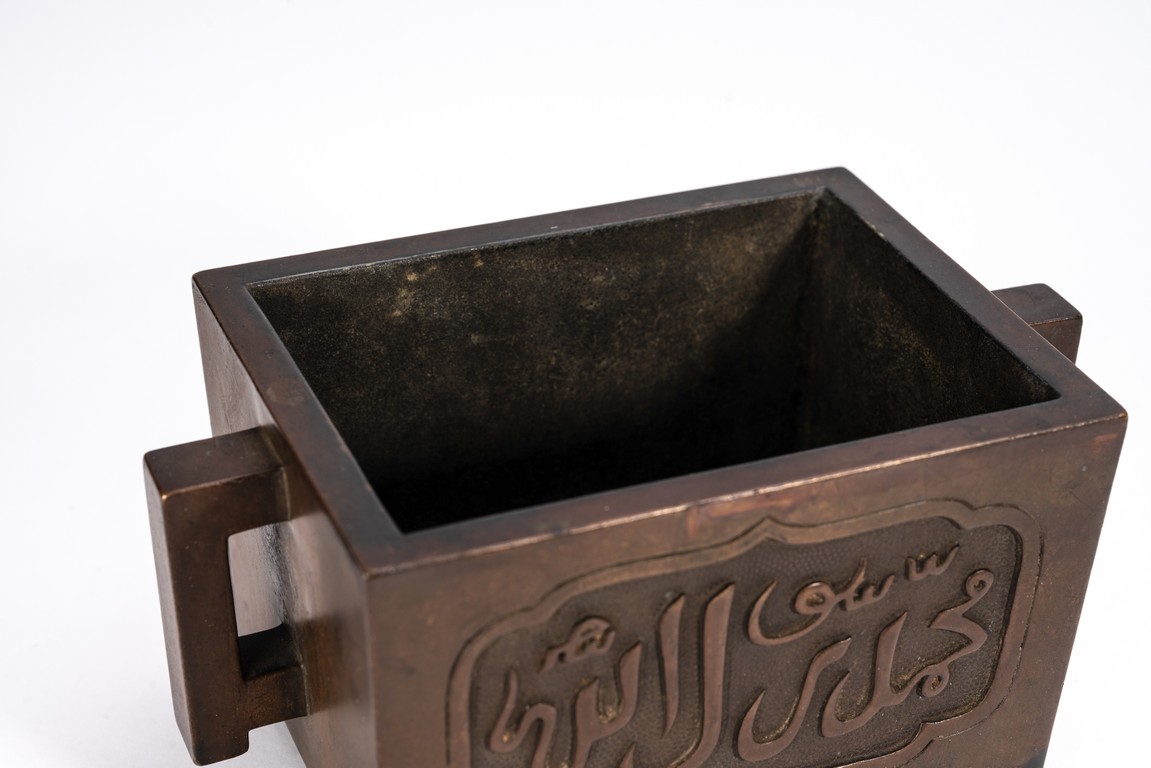 Mid Qing Dynasty period. The heavily-cast, straight-sided censer is raised on four low angular supports and set with two angular loop handles. The body cast with arabic inscriptions against a ring-punched ground within shaped cartouche, The base is cast with four character Zhengde mark.