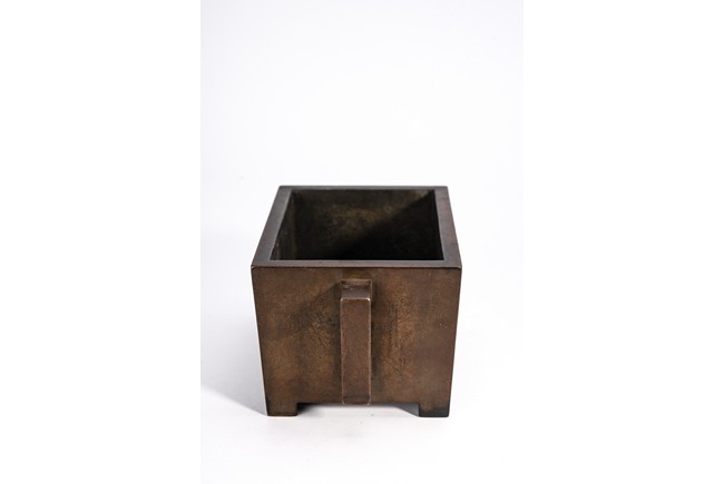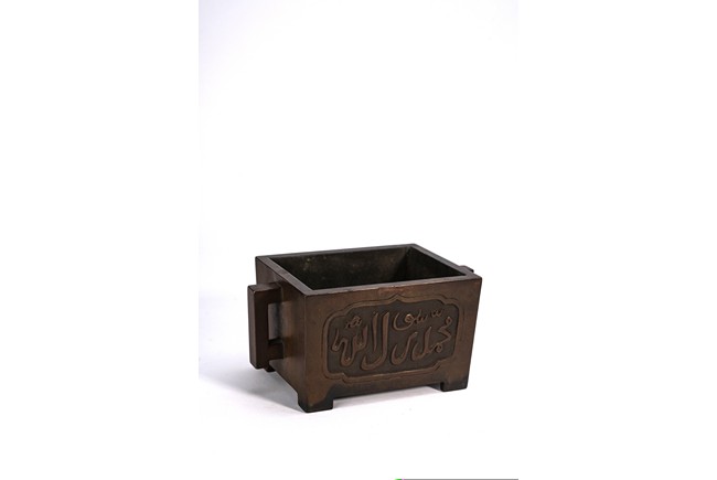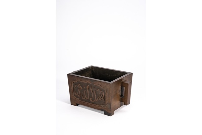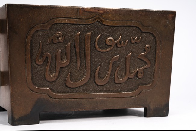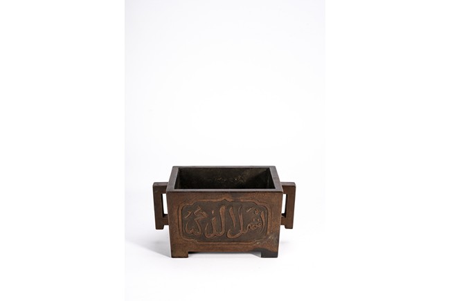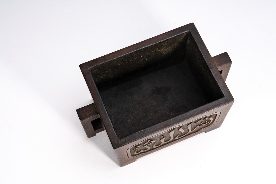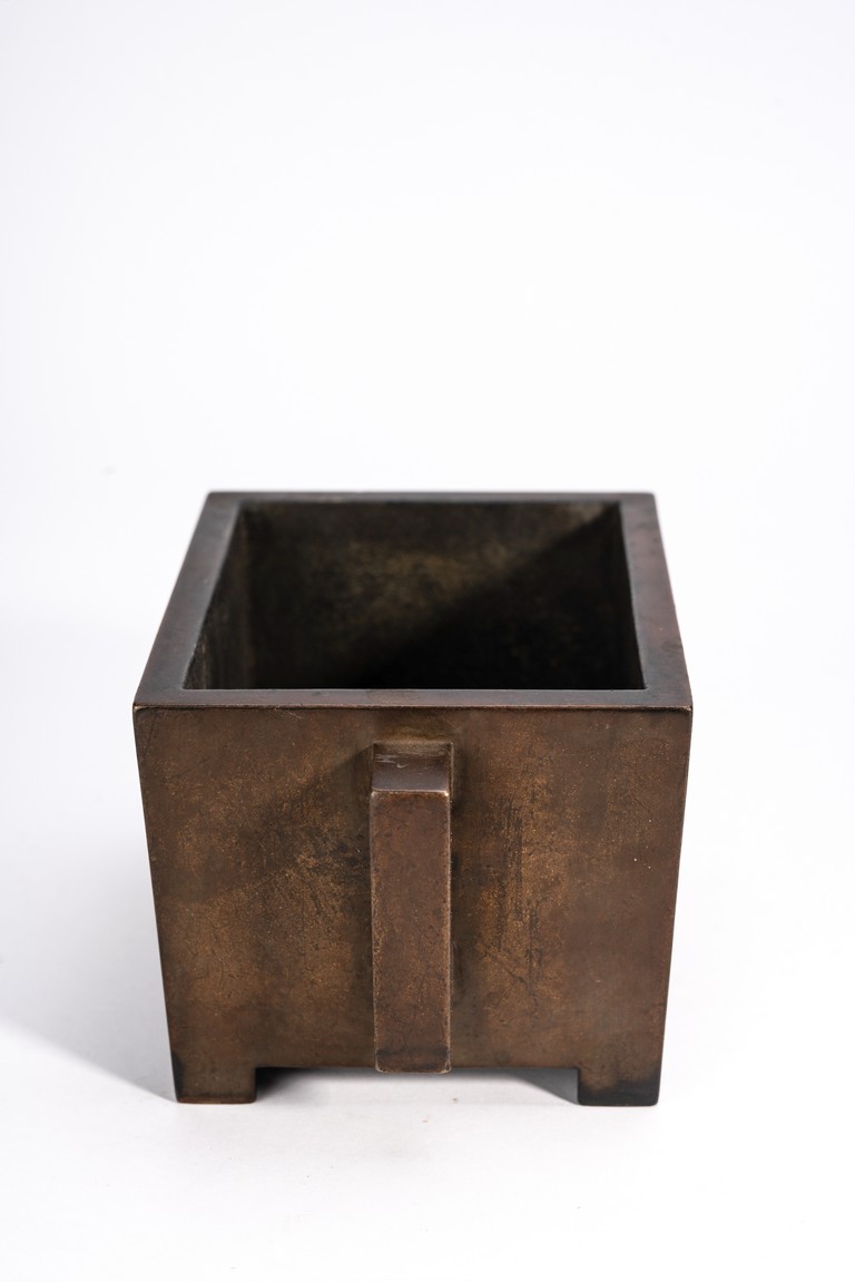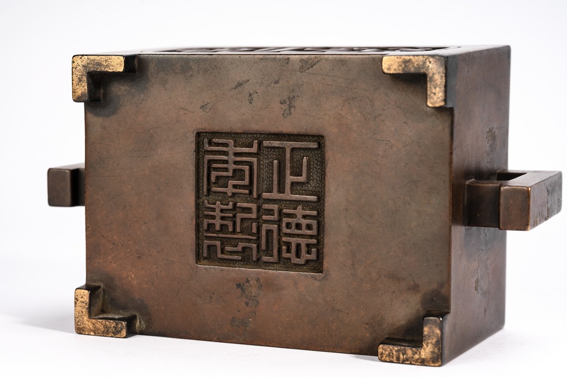 Mid Qing Dynasty period. The heavily-cast, straight-sided censer is raised on four low angular supports and set with two angular loop handles. The body cast with arabic inscriptions against a ring-punched ground within shaped cartouche, The base is cast with four character Zhengde mark.
