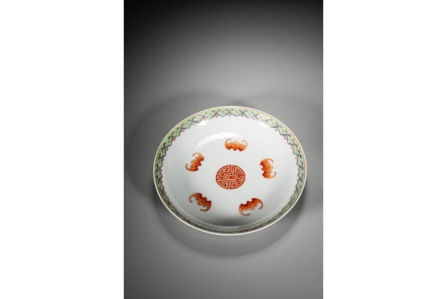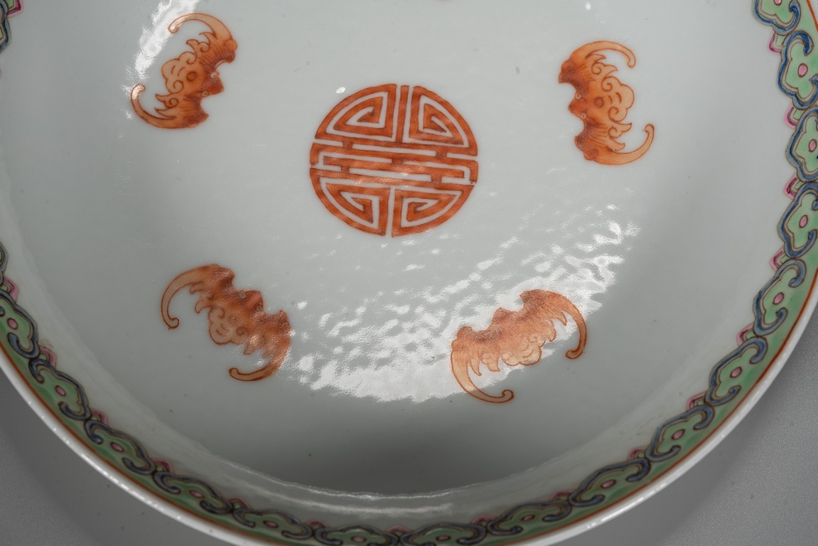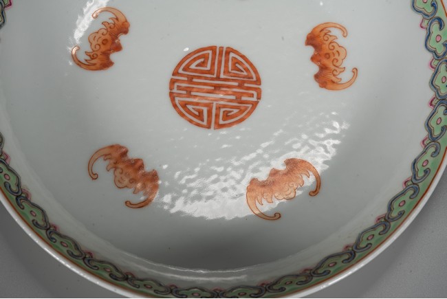 Qing Dynasty period. The interior enamelled with five bats flanking a stylized shou medallion, the mouth rim painted with a band of ruyi lappets, the exterior further decorated with stylized key-fret band with five bats and shou motif, base inscribed with four character mark.