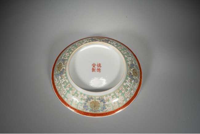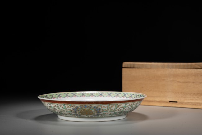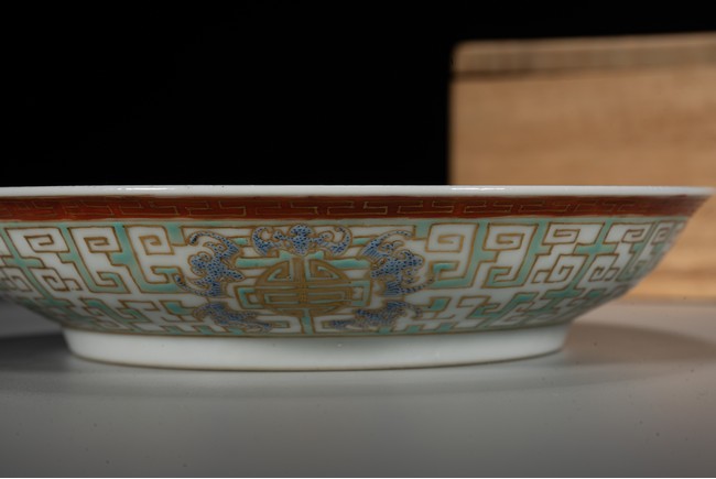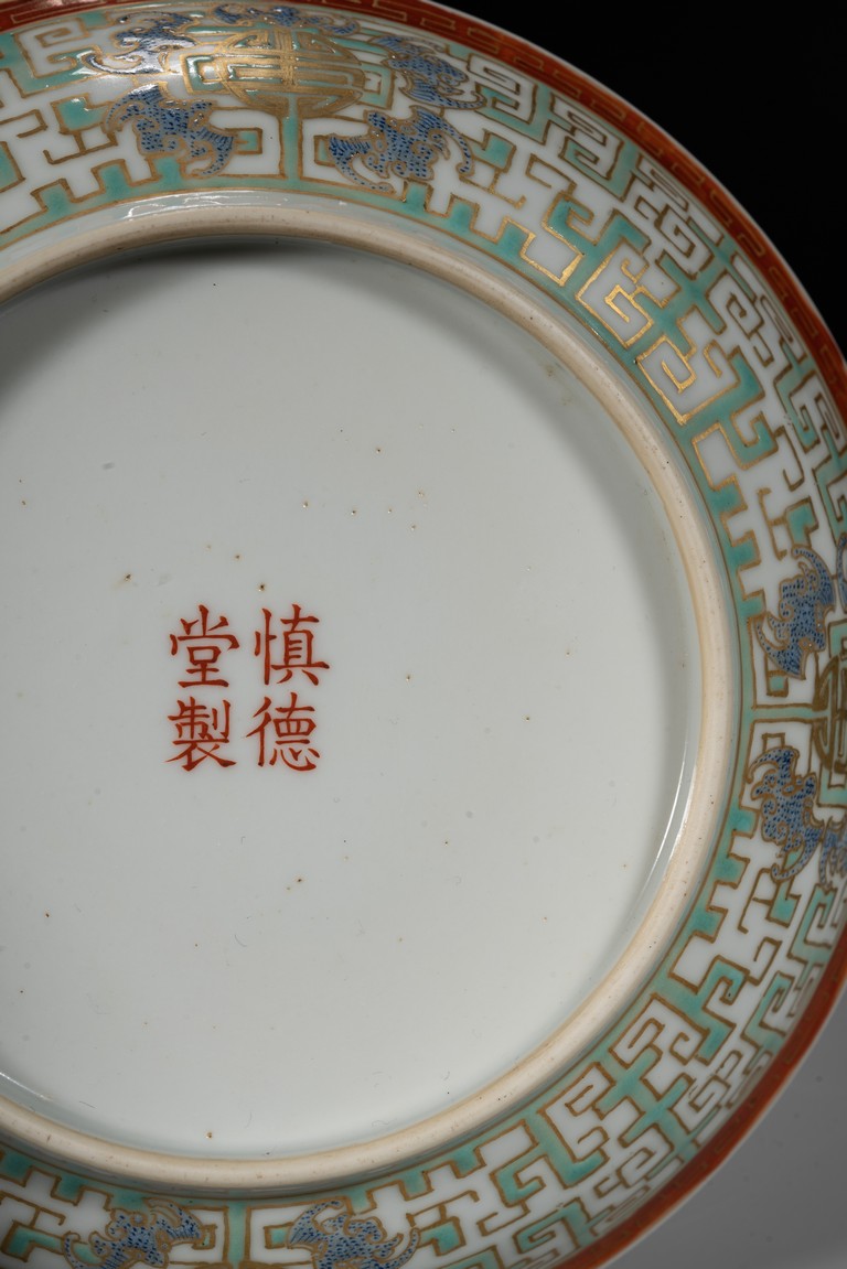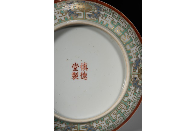 此盤敞口、淺弧腹、圈足。盤內口沿一圈如意雲紋,盤心以礬紅彩繪五蝠捧壽紋,外口沿以礬紅描繪繪一圈回紋,外壁整體采用松石綠地夾白的工藝繪制錦地回紋,並繪制五蝠捧壽紋,與盤心遙相呼應。整體器形周正,修胎規整,胎質細膩,釉面潔凈,施彩淡雅,紋飾精美,寓意吉祥,時代特征明顯,收藏佳器。底以礬紅書“慎德堂制”四字楷書款。