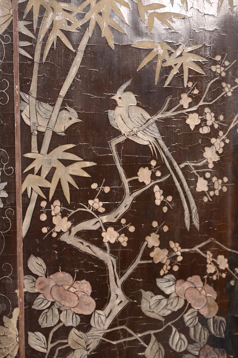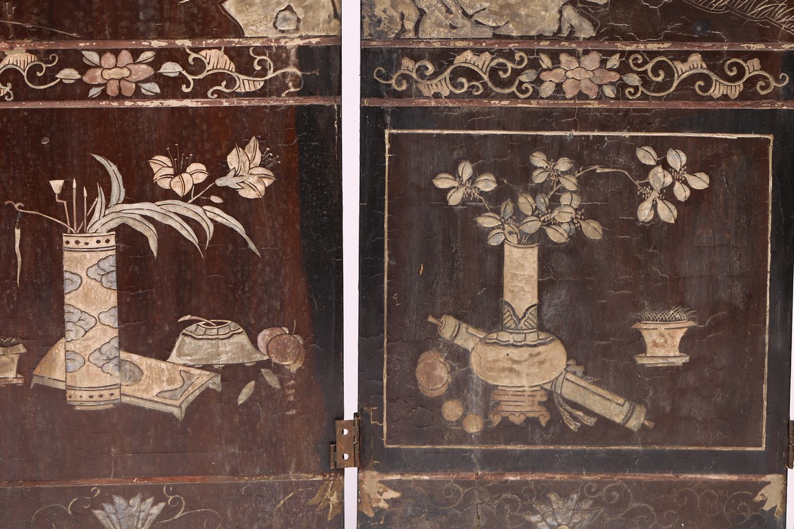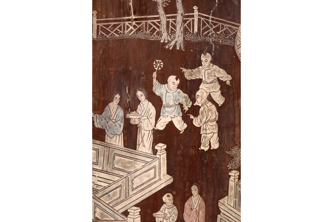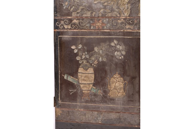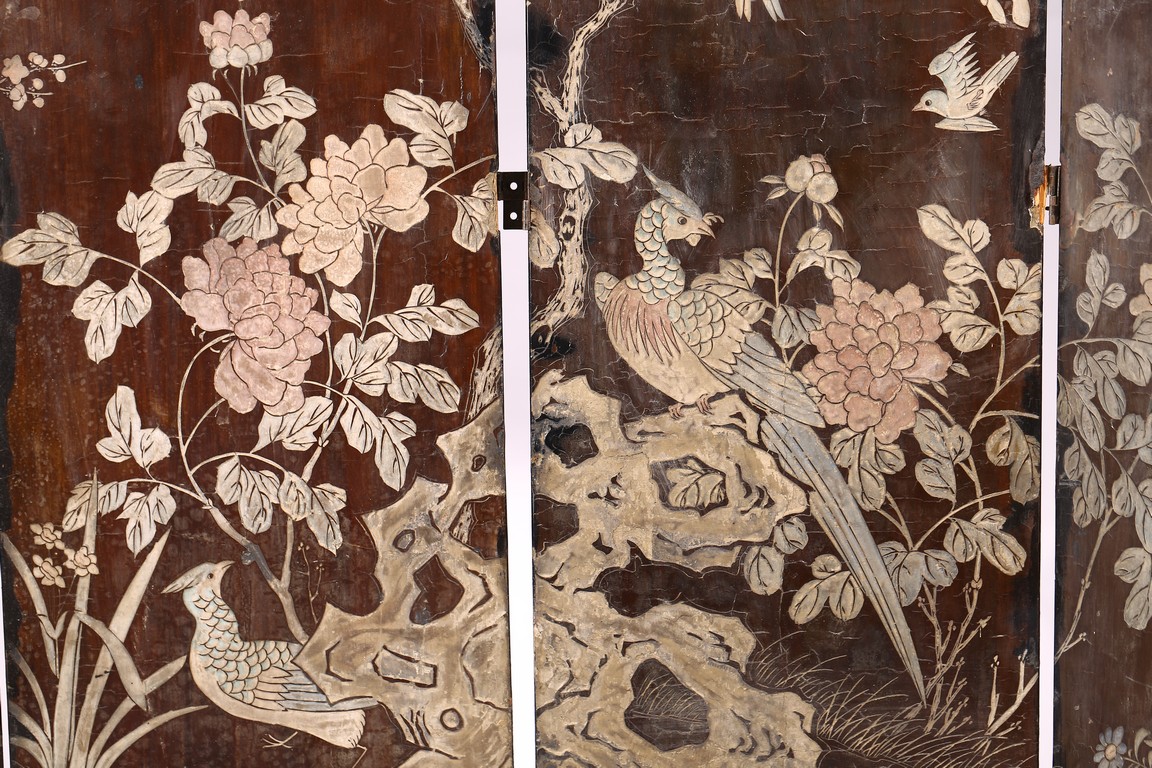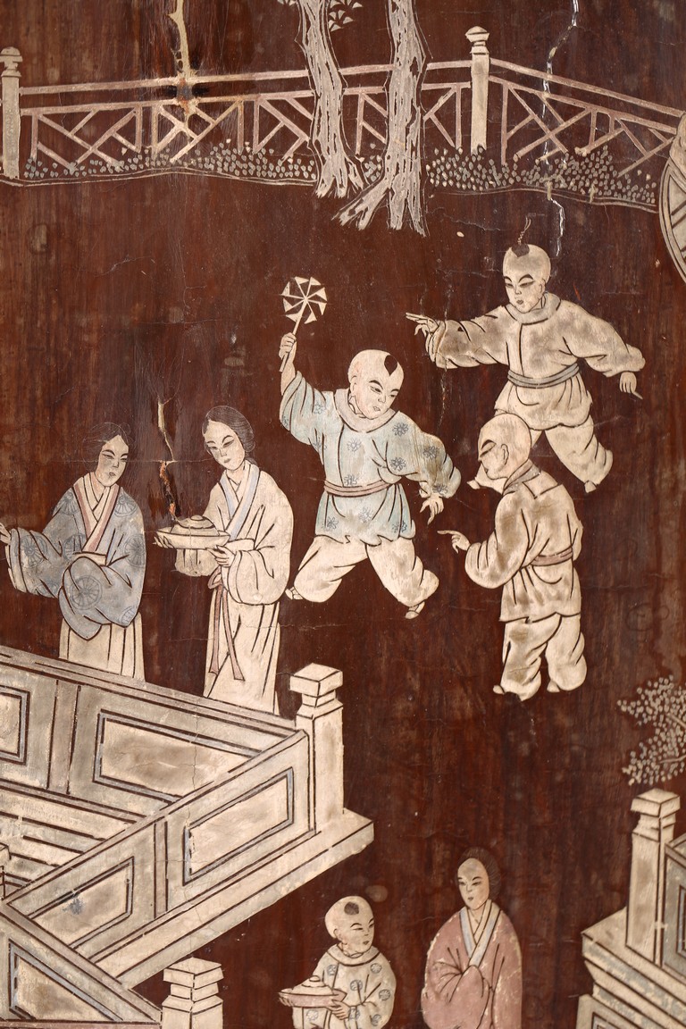Qing Dynasty Kangxi period. One side of the brown-lacquered surface carved and infilled in polychrome with a lively hundred boy scene between flower vases panels above and below, the reverse with various birds, flowers, and rockworks between landscape and vase panels.