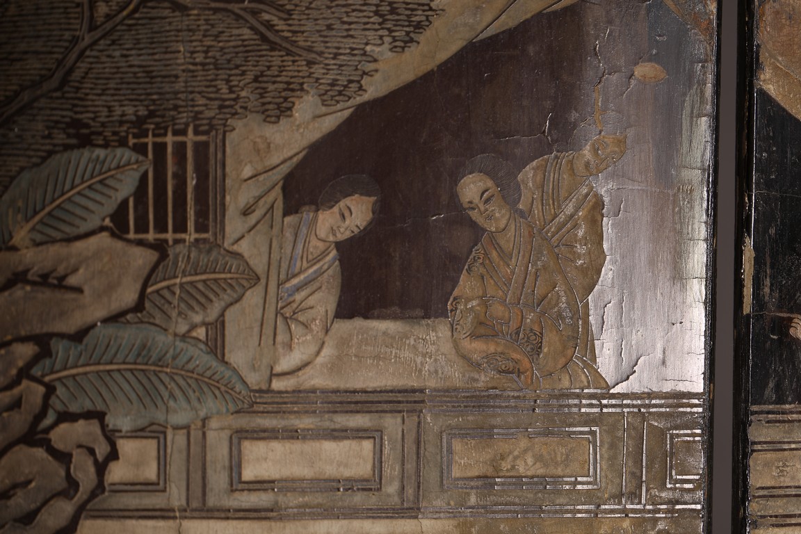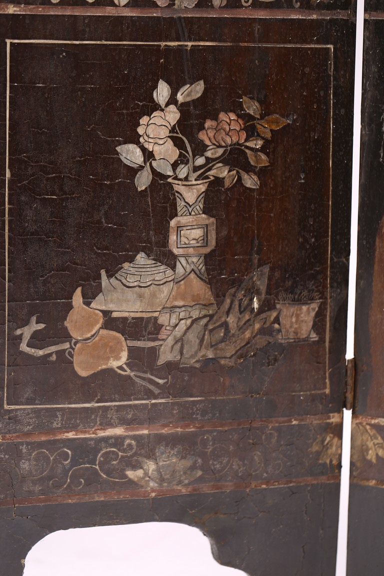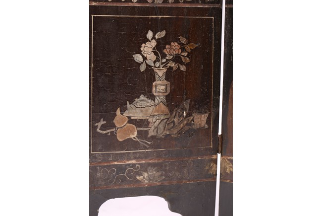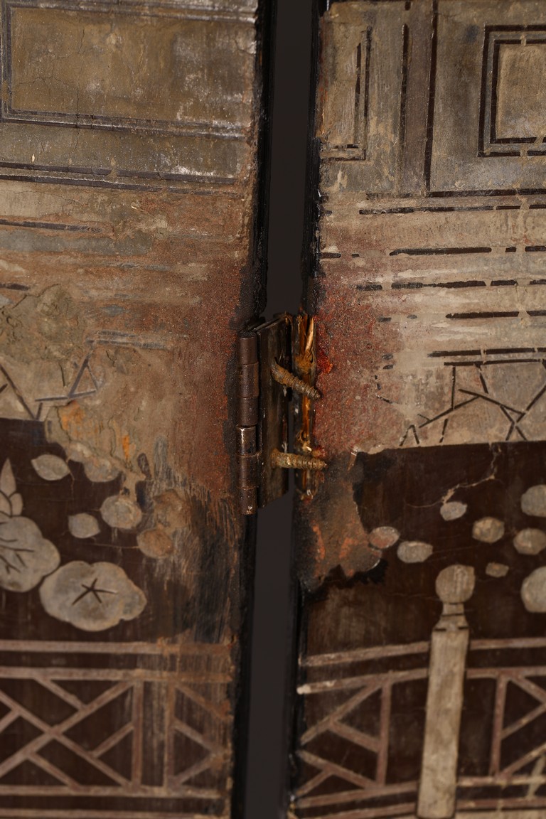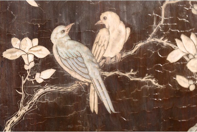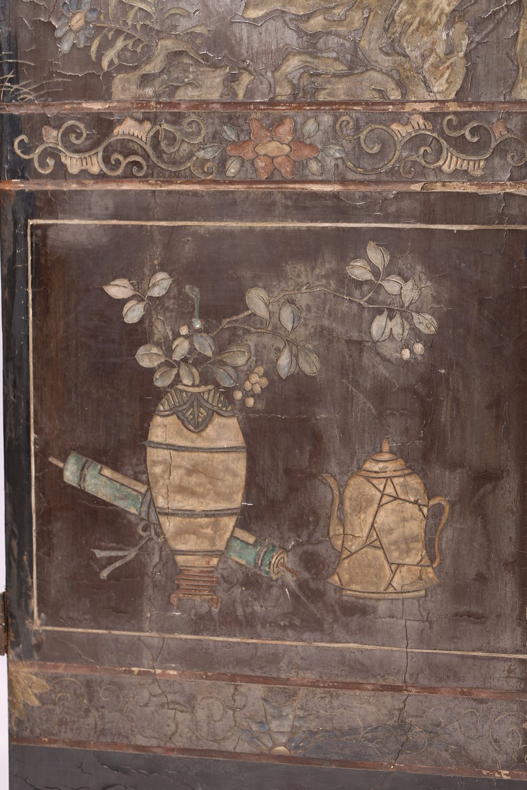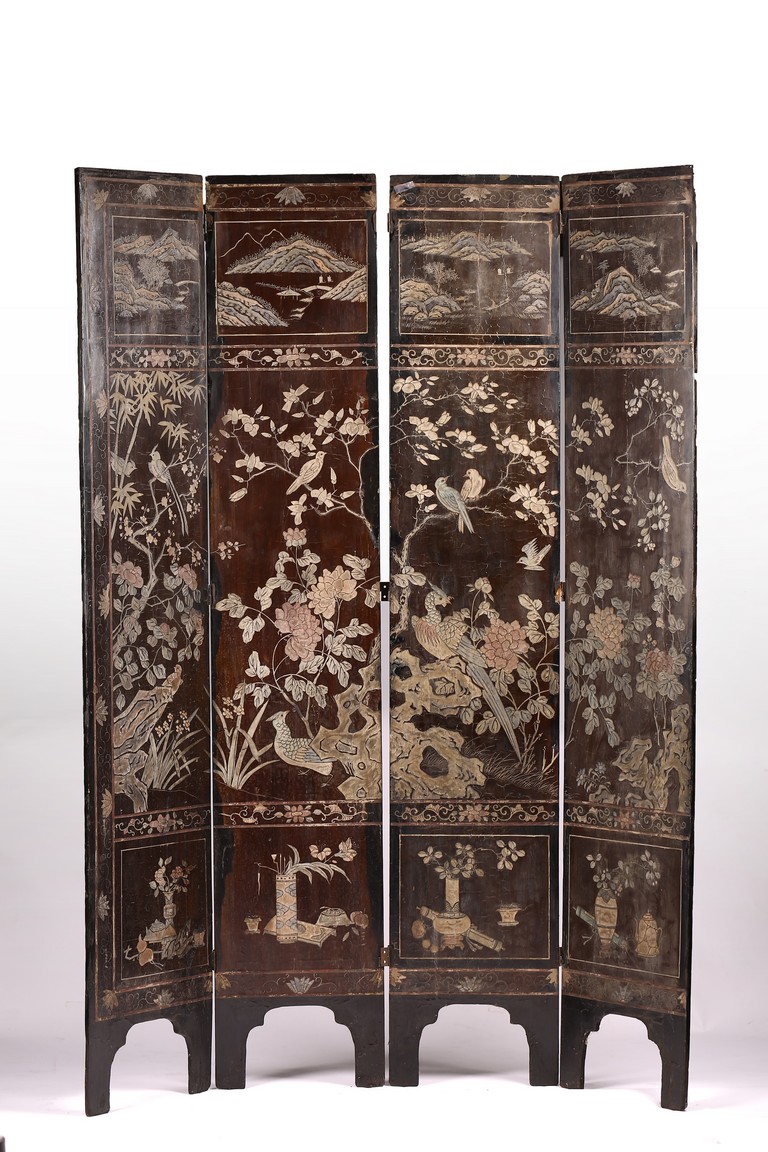 Qing Dynasty Kangxi period. One side of the brown-lacquered surface carved and infilled in polychrome with a lively hundred boy scene between flower vases panels above and below, the reverse with various birds, flowers, and rockworks between landscape and vase panels.