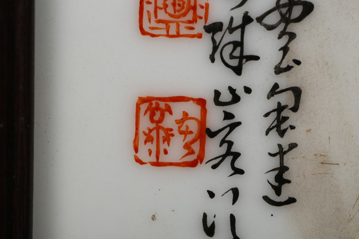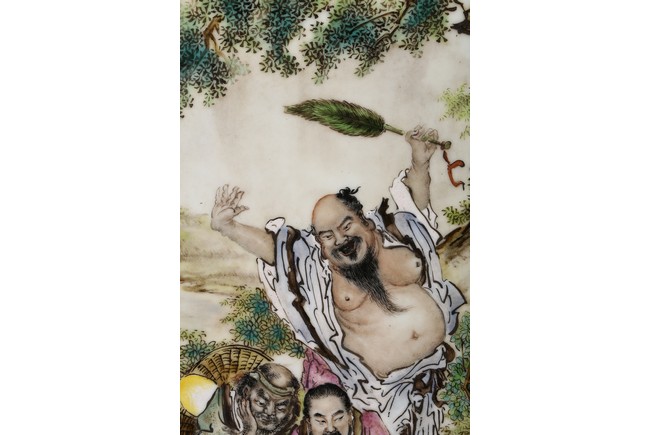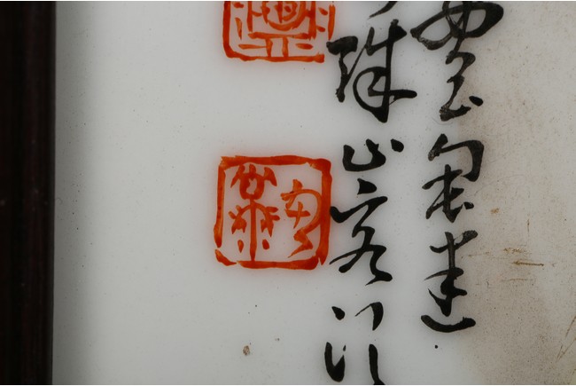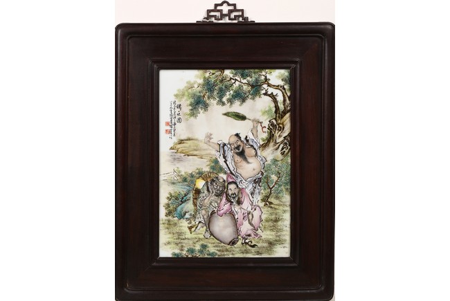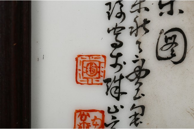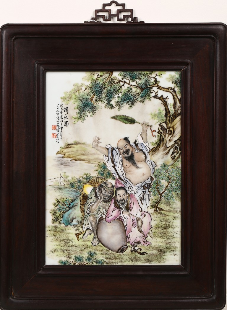 The rectangular panel two figures seated leaning against a large wine jar and a figure standing behind, set in an outdoor garden setting, upper right with inscription and two seal marks. Republic period.