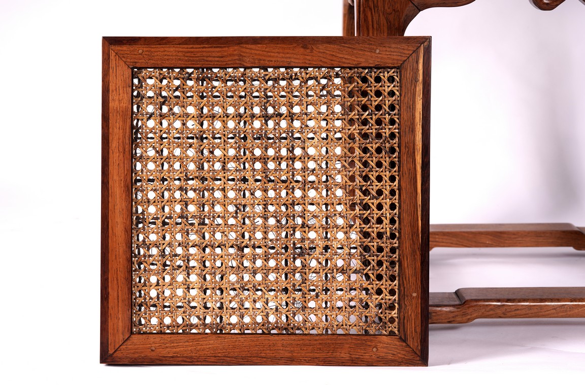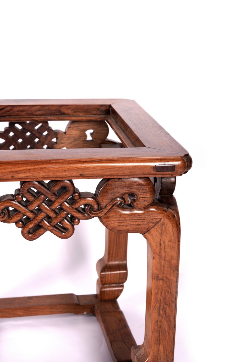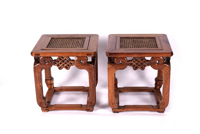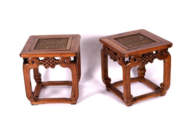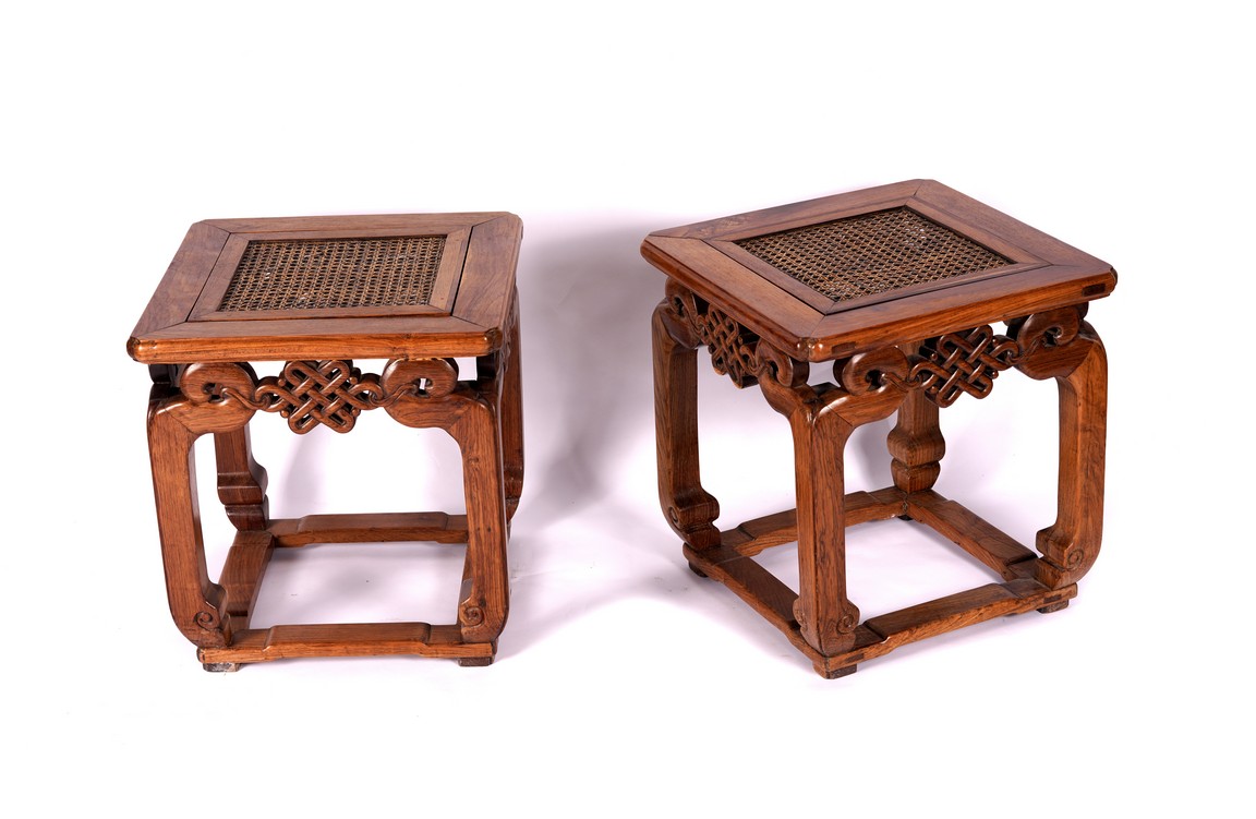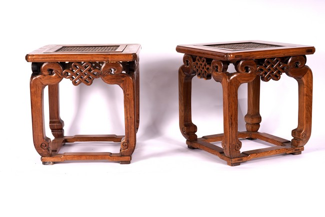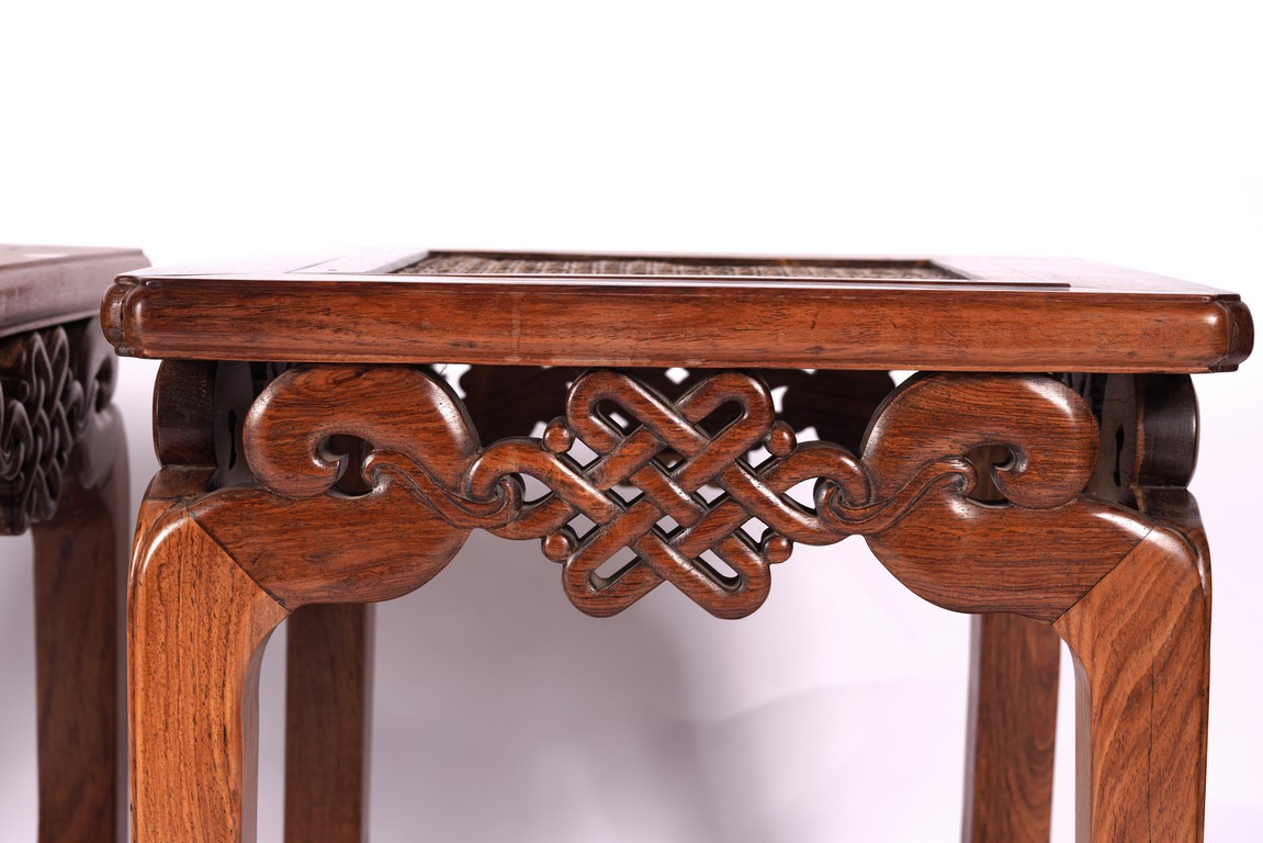 Each with a single detachable wicker stretched net top set within a molded frame, above reticulated apron carved with knot and ruyi pattern, supported on four square-section legs joined at the base by humpback stretchers.