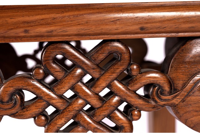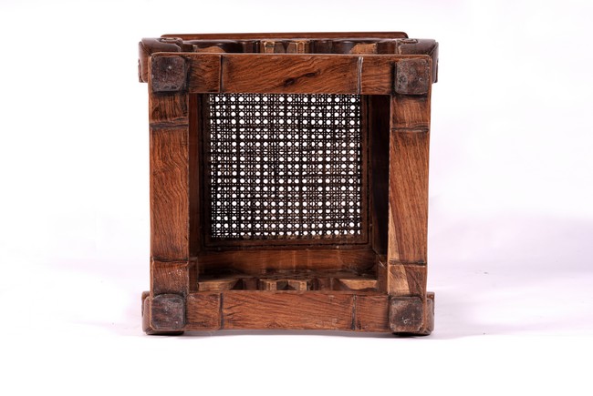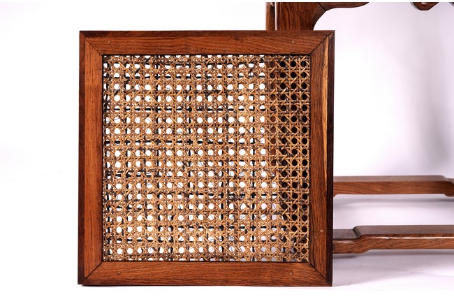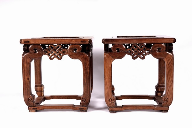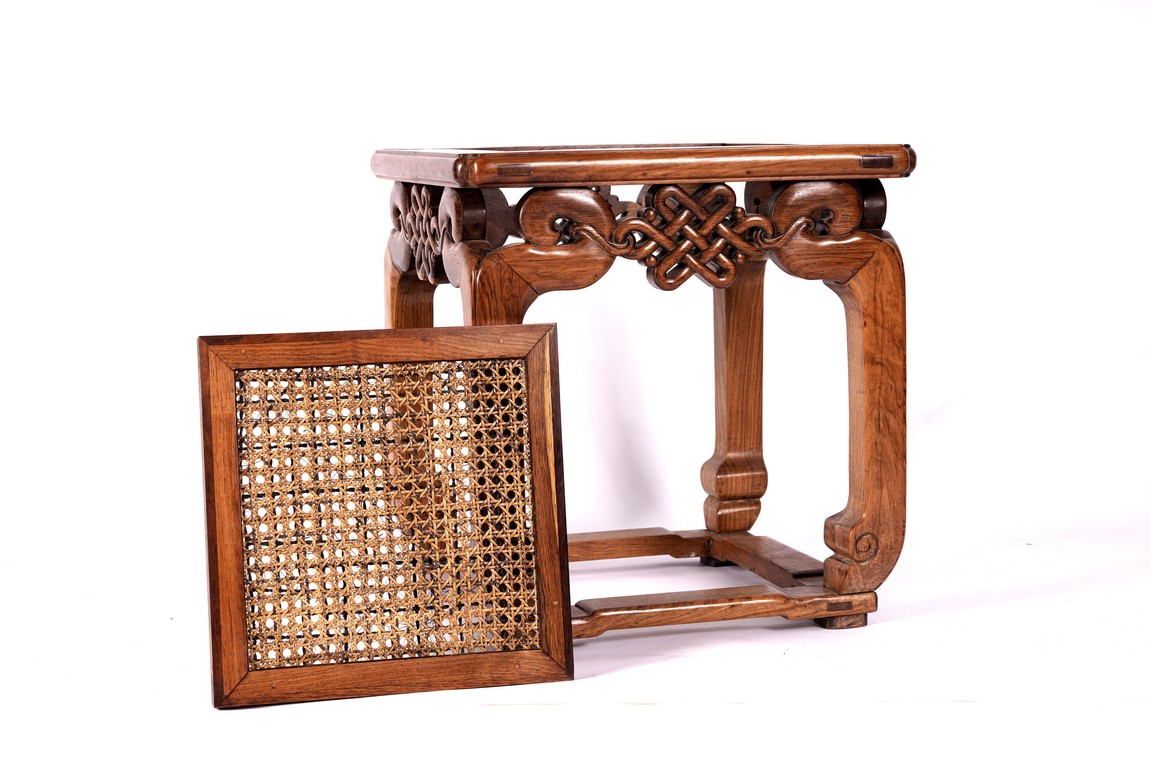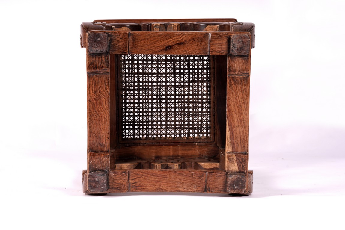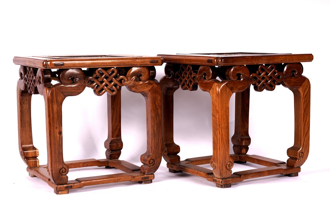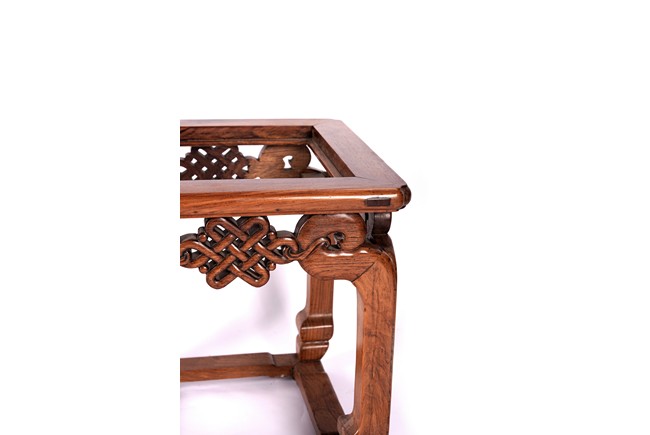 Each with a single detachable wicker stretched net top set within a molded frame, above reticulated apron carved with knot and ruyi pattern, supported on four square-section legs joined at the base by humpback stretchers.