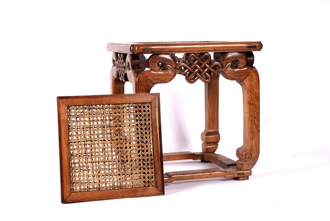 此對方凳以黃花梨為材。凳板面簡素,內嵌軟屜,下承三彎腿,側盤腸牙子,足做內翻馬蹄式,底部帶托泥。王世襄在《明式家具萃珍》中提及此種形制方凳闡述:“歷年過目,當以百計。但直足者多,彎足者少。”此方凳為彎足者實用性與觀賞性極佳,歷久彌新,材質珍稀,收藏佳品。