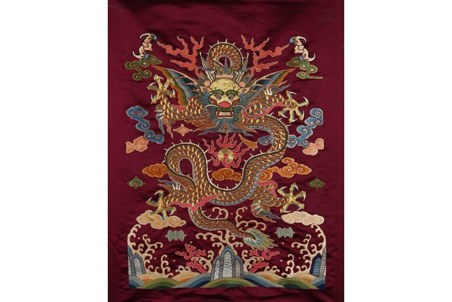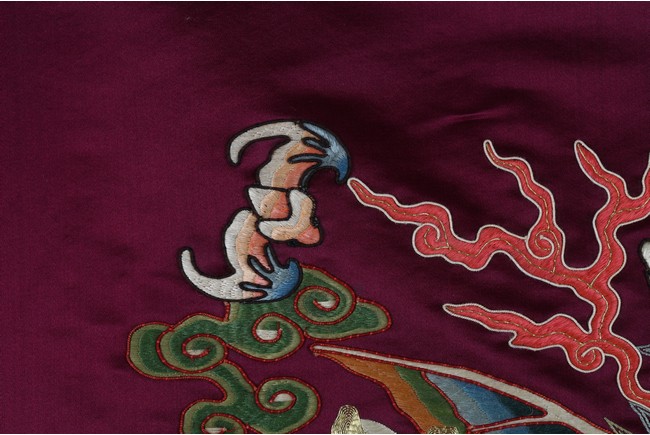 The large panel with a single five clawed dragon in gold thread amidst clouds and above waves, to the sides with a pairs of bat, all reserved on reddish purple ground.