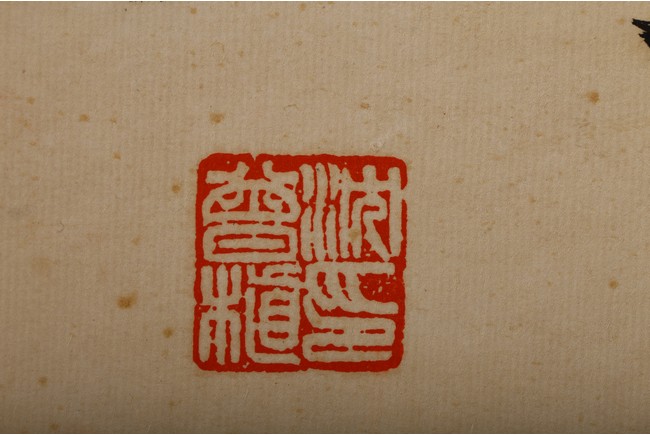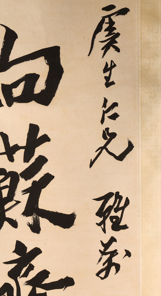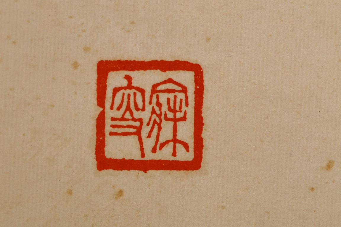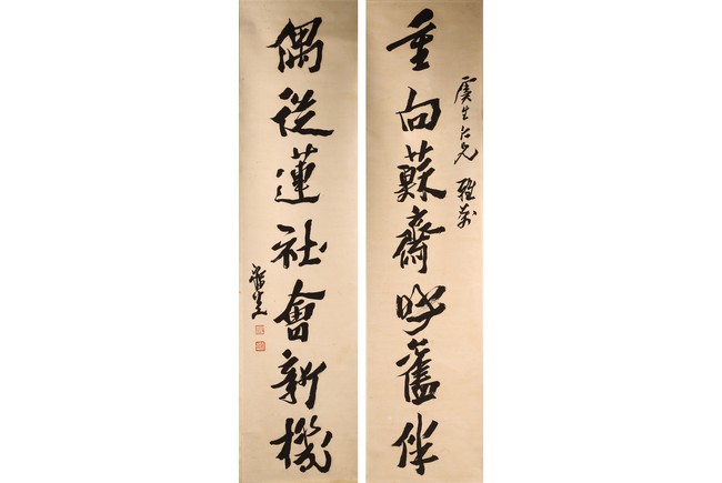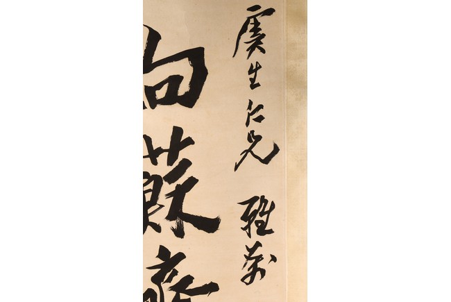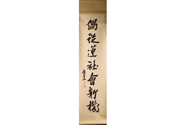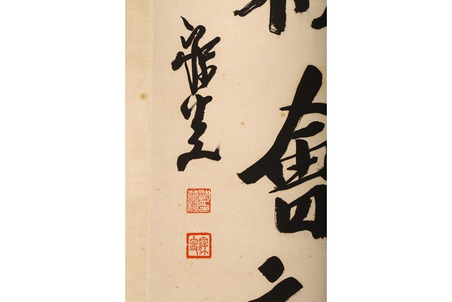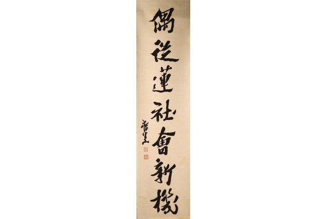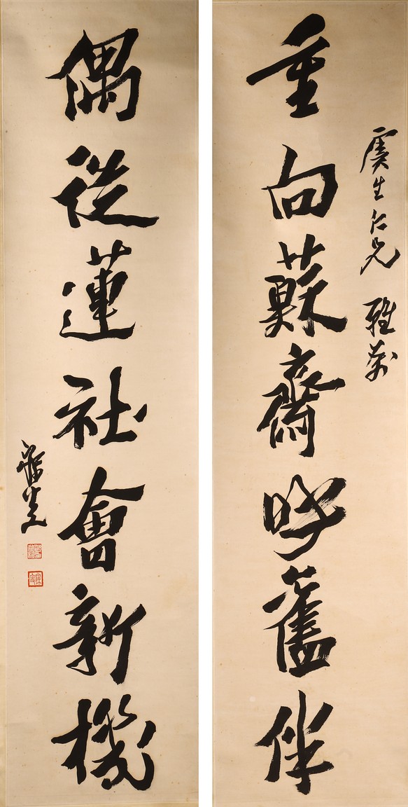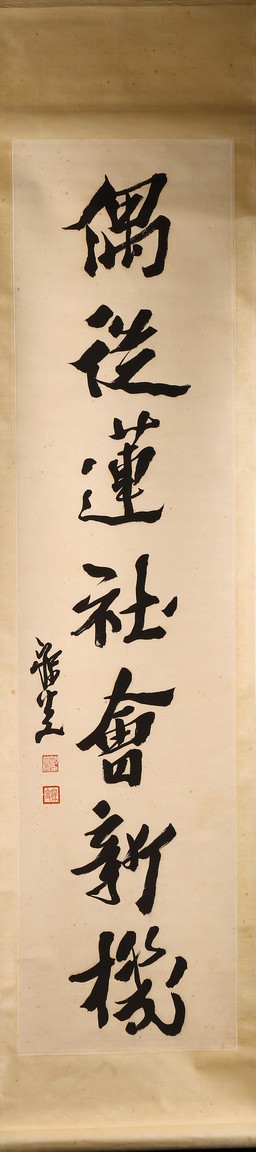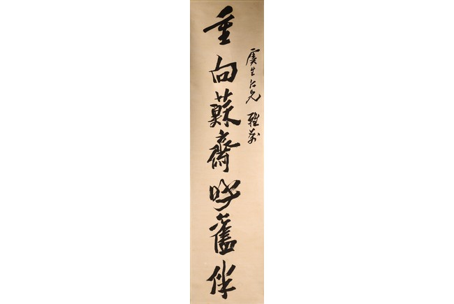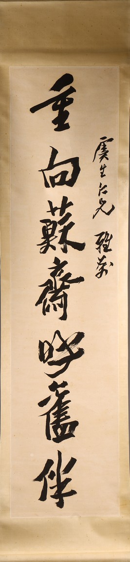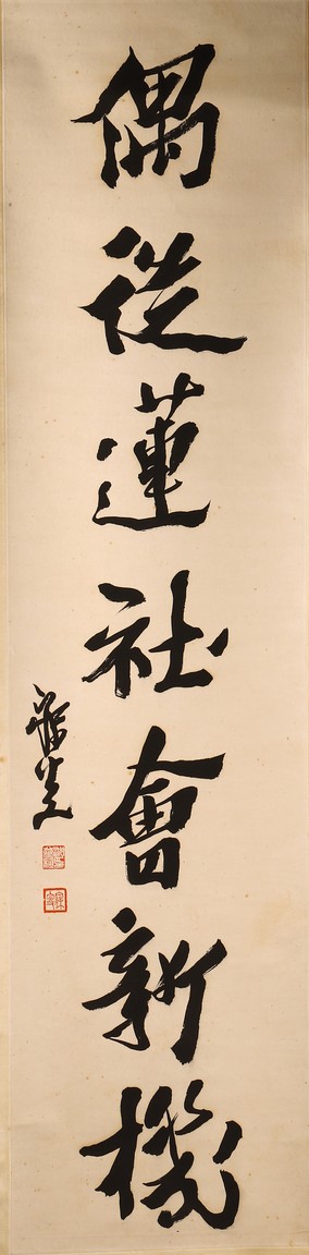 Ink on paper. Hanging scroll. Running script calligraphy. With dedication, Signed Mei Sou, with two seals of the artist.