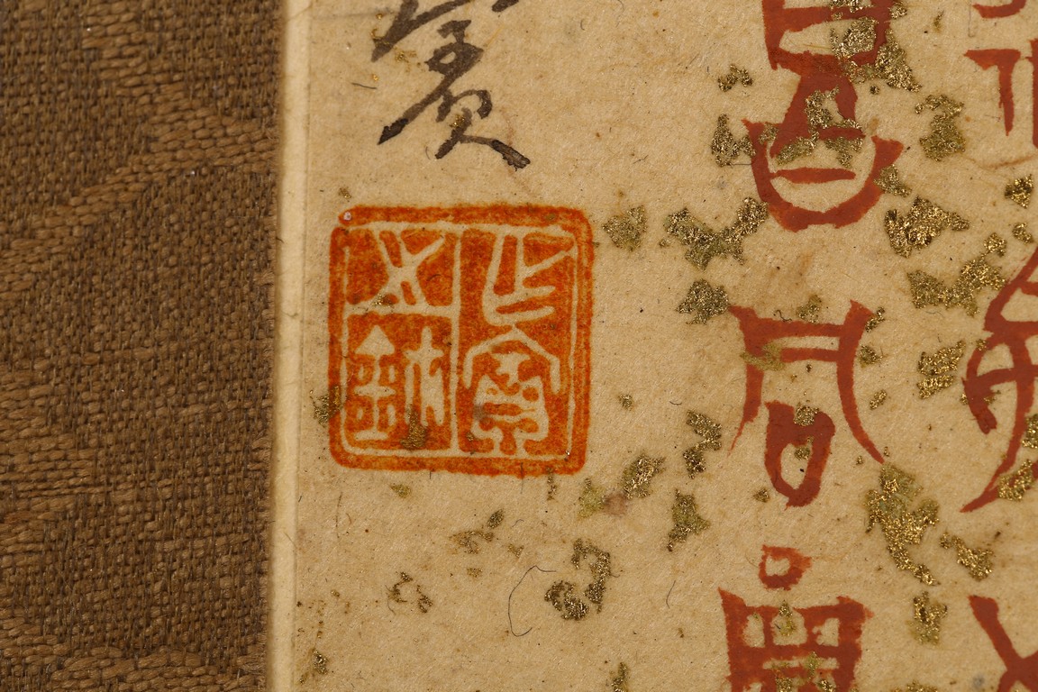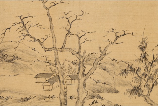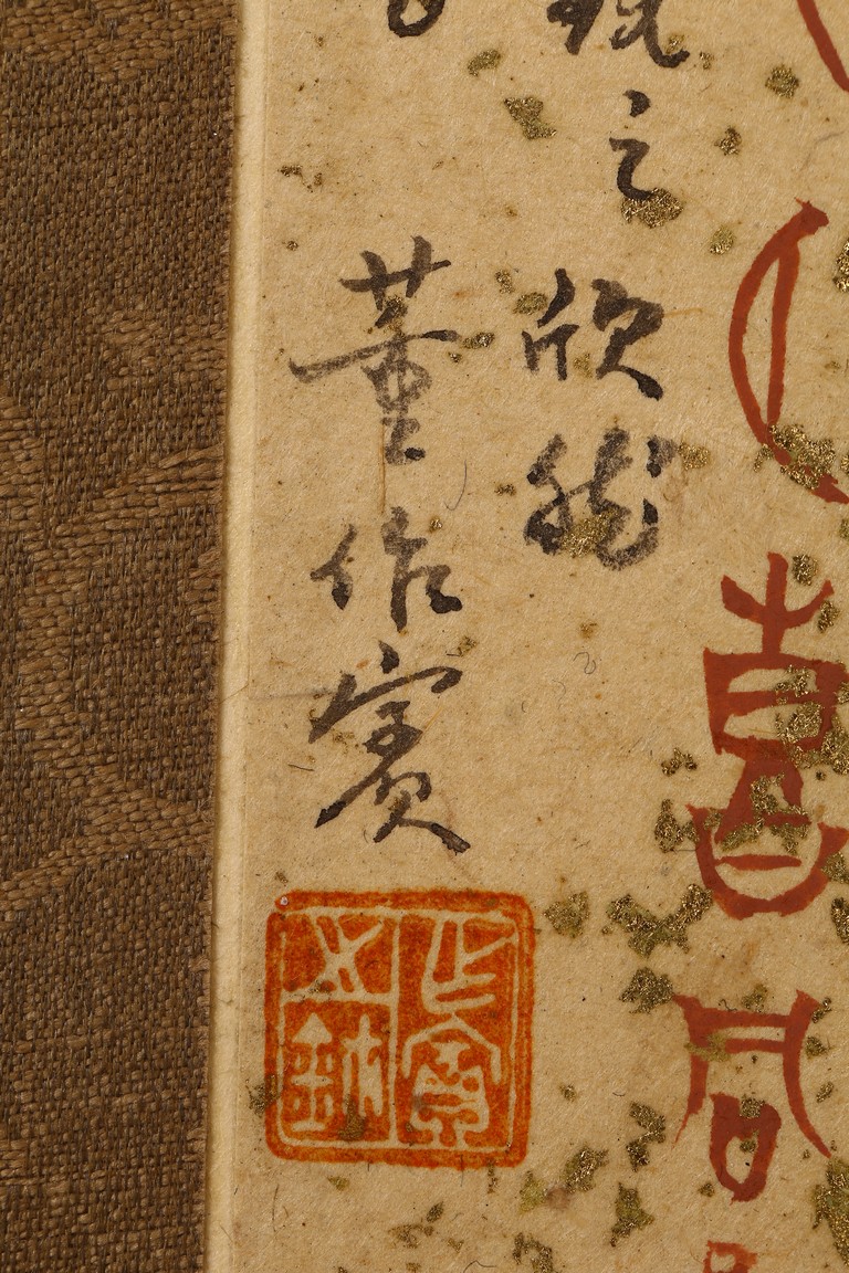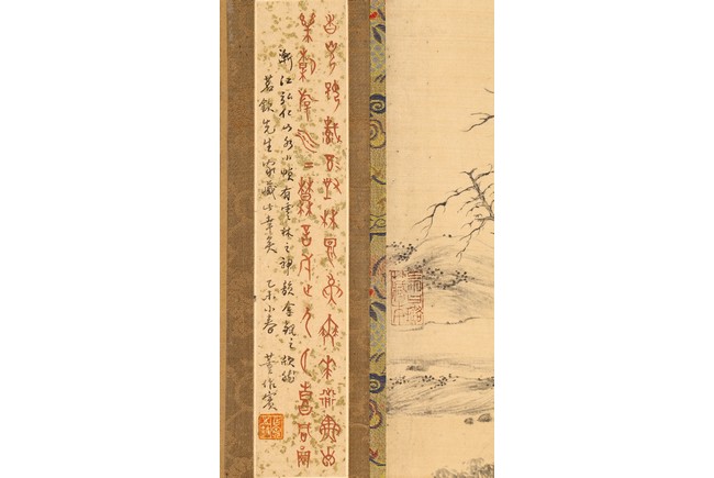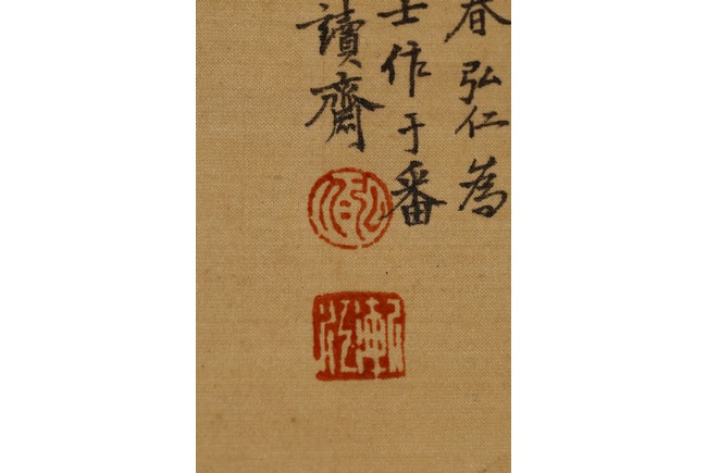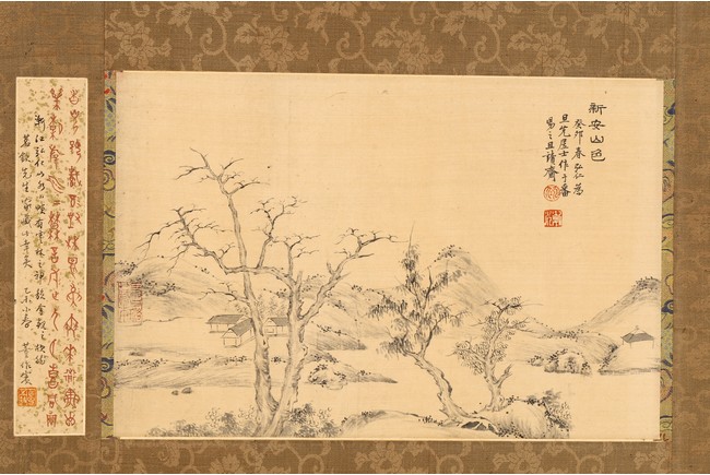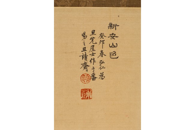 Chinese School. Mountain Landscape of Xin An. Inscribed and signed Hong Ren with two seal marks of the artist and a seal mark of collector. Mounted on paper. With colophon signed Dong Zuobing with one seal mark.