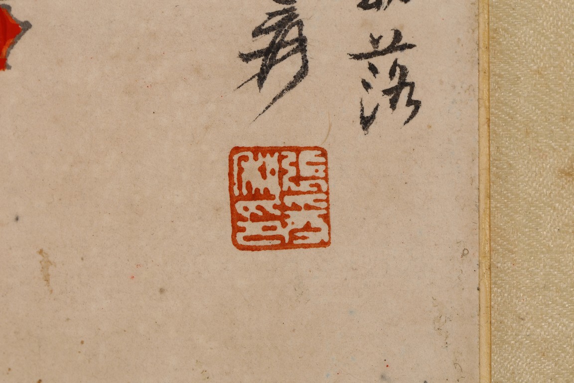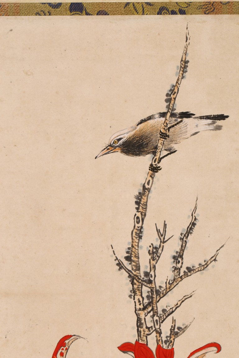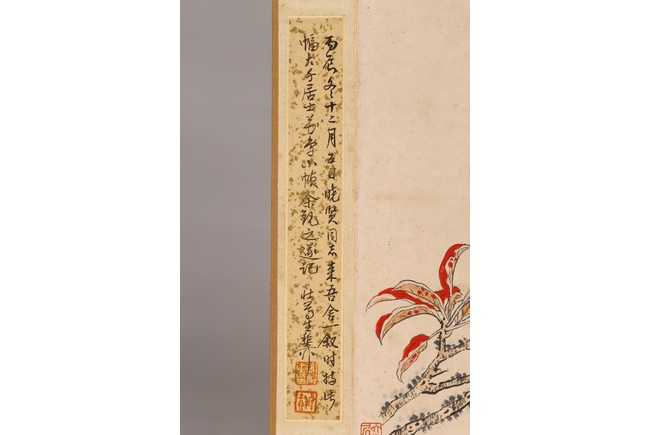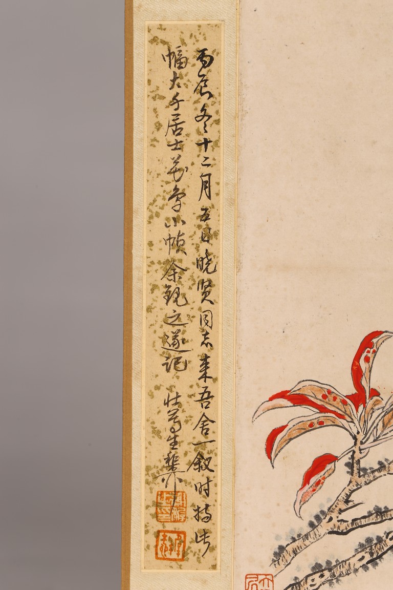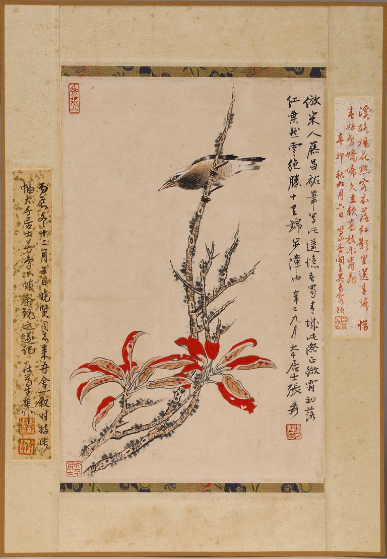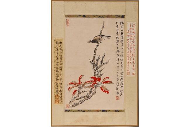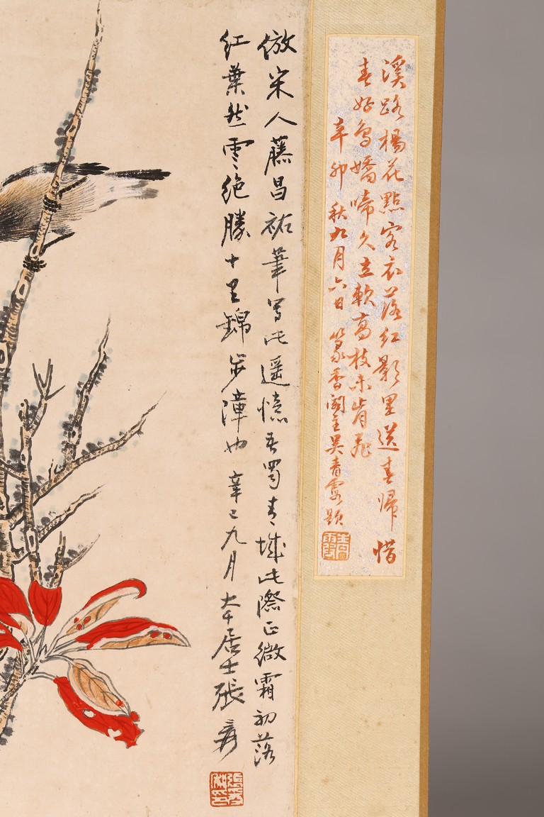 Chinese School. Bird. Mounted on paper. Inscribed and signed Zhang Yuan,with three seals of the artist, and two colophons signed Wu Changshuo and Xie Zhiliu. Attributed to Zhang Daqian.