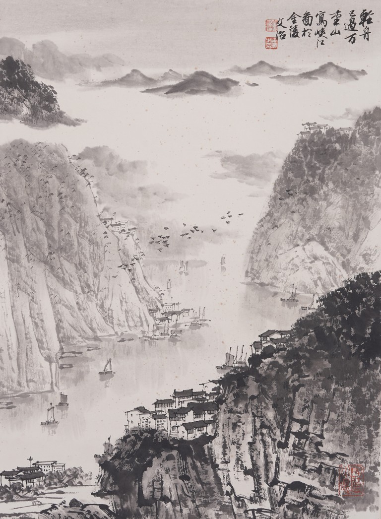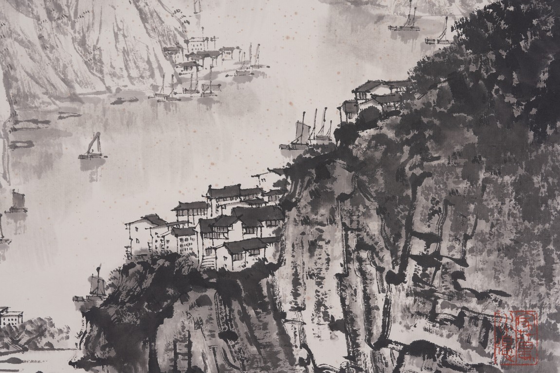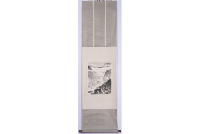Ink on paper. Landscape. Hanging scroll, inscribed and signed Wen Zhi, with three seal marks of the artist.
