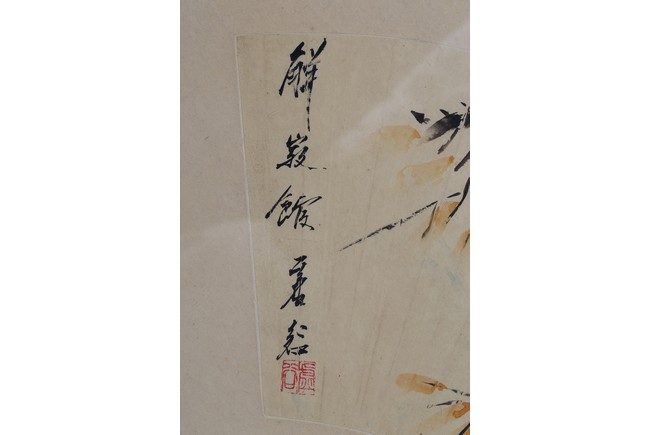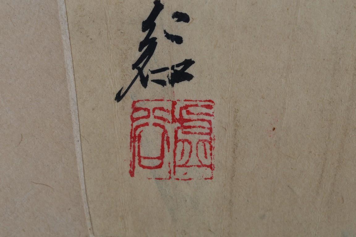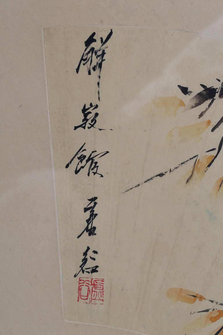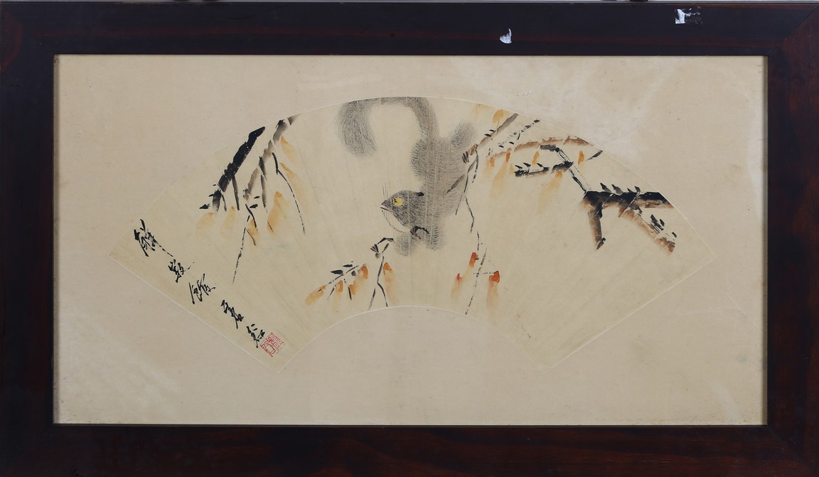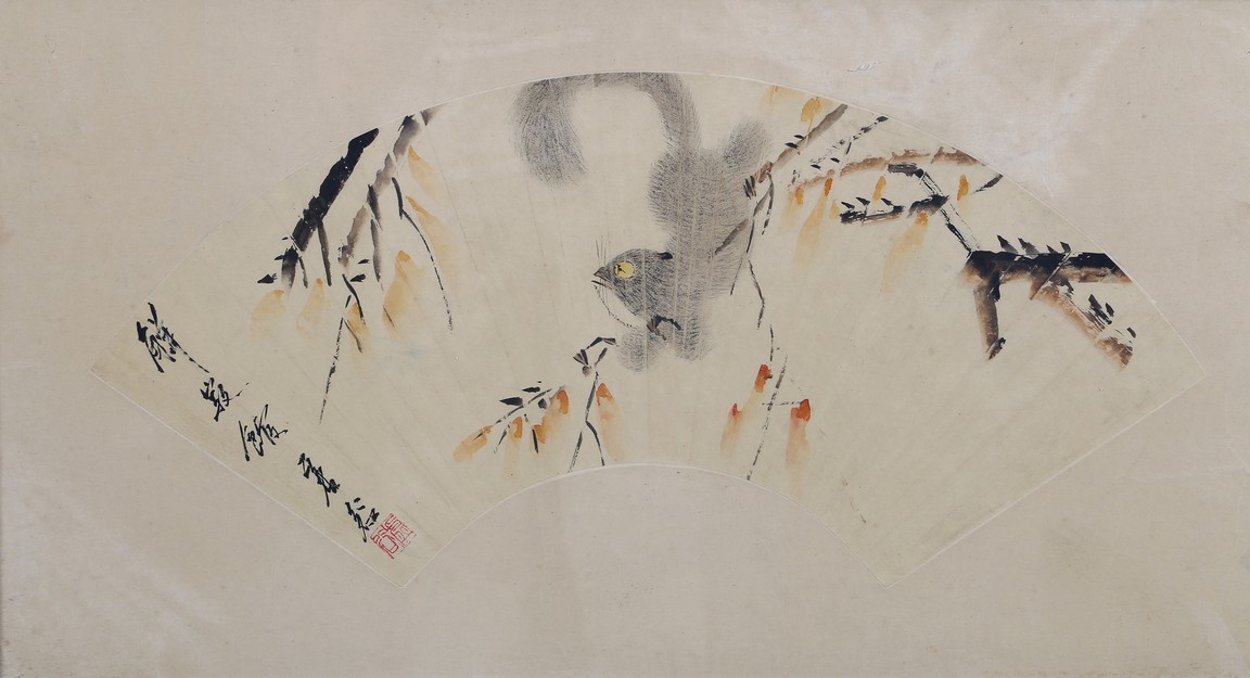 Color and ink on paper. Squirrel. Fan painting. Framed. Inscribed and with one seal mark.