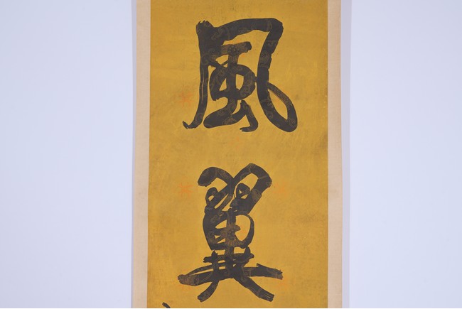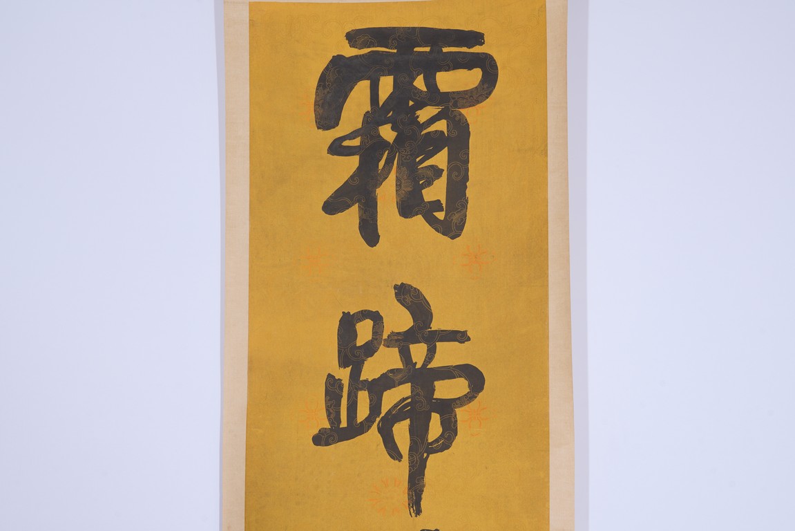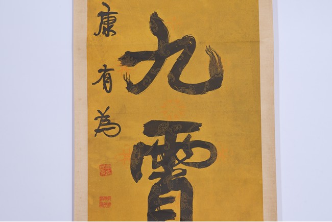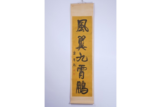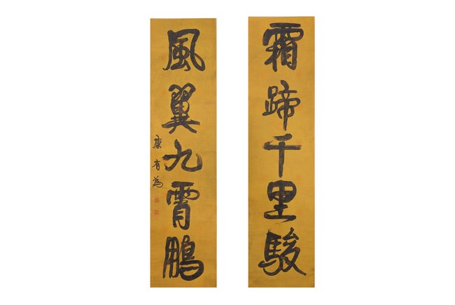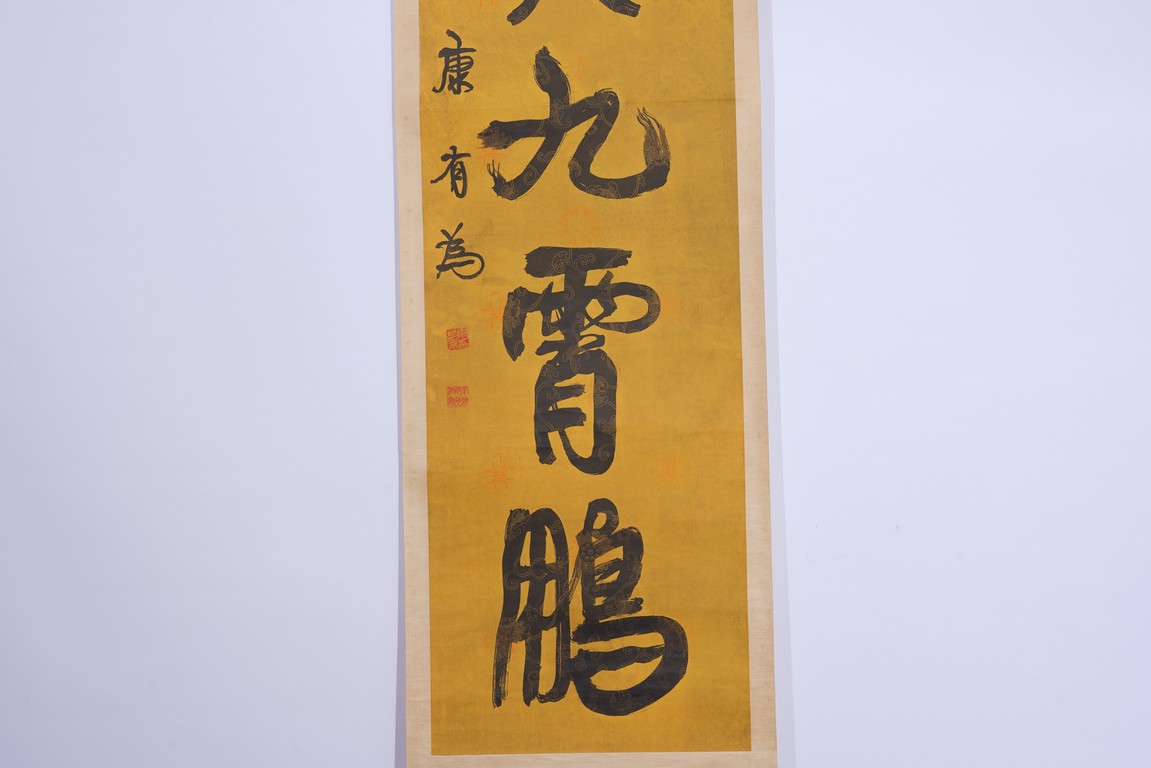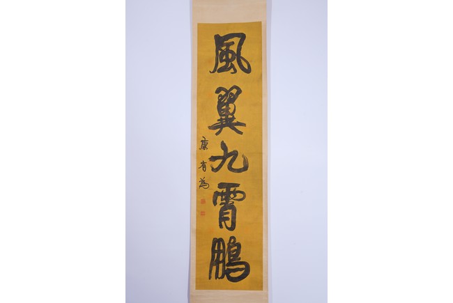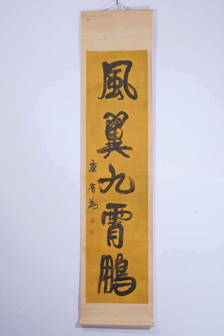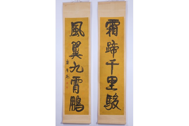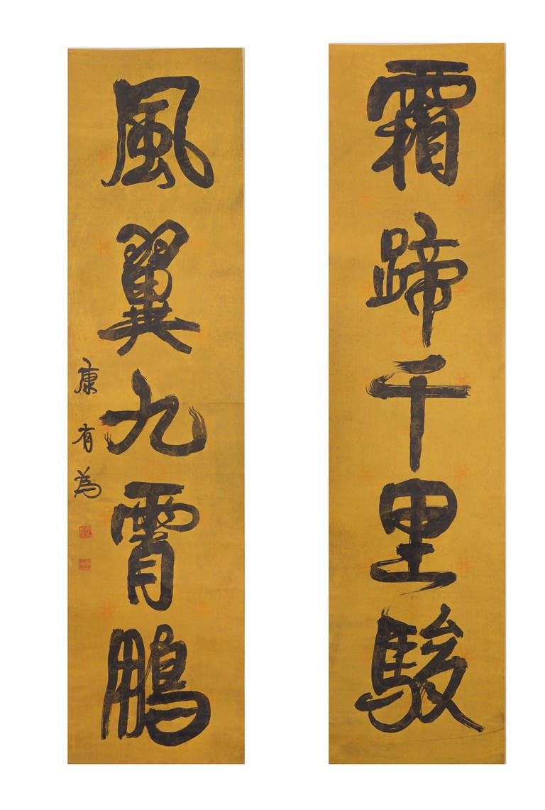 Ink on paper. Five character calligraphy couplet. Hanging scroll. Signed Kang Youwei, with two seal marks of the artist.