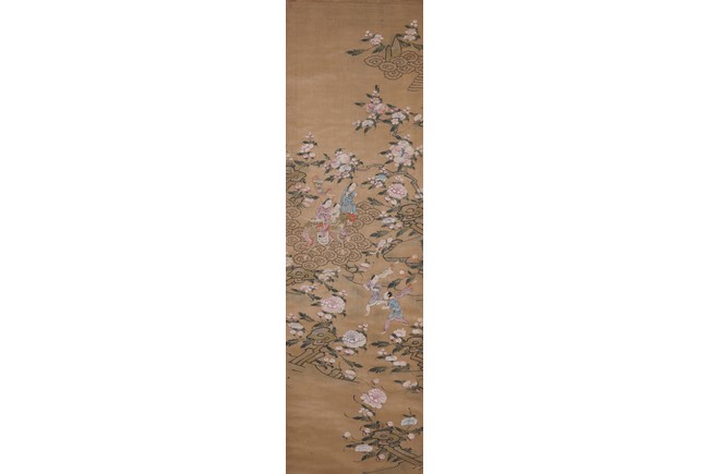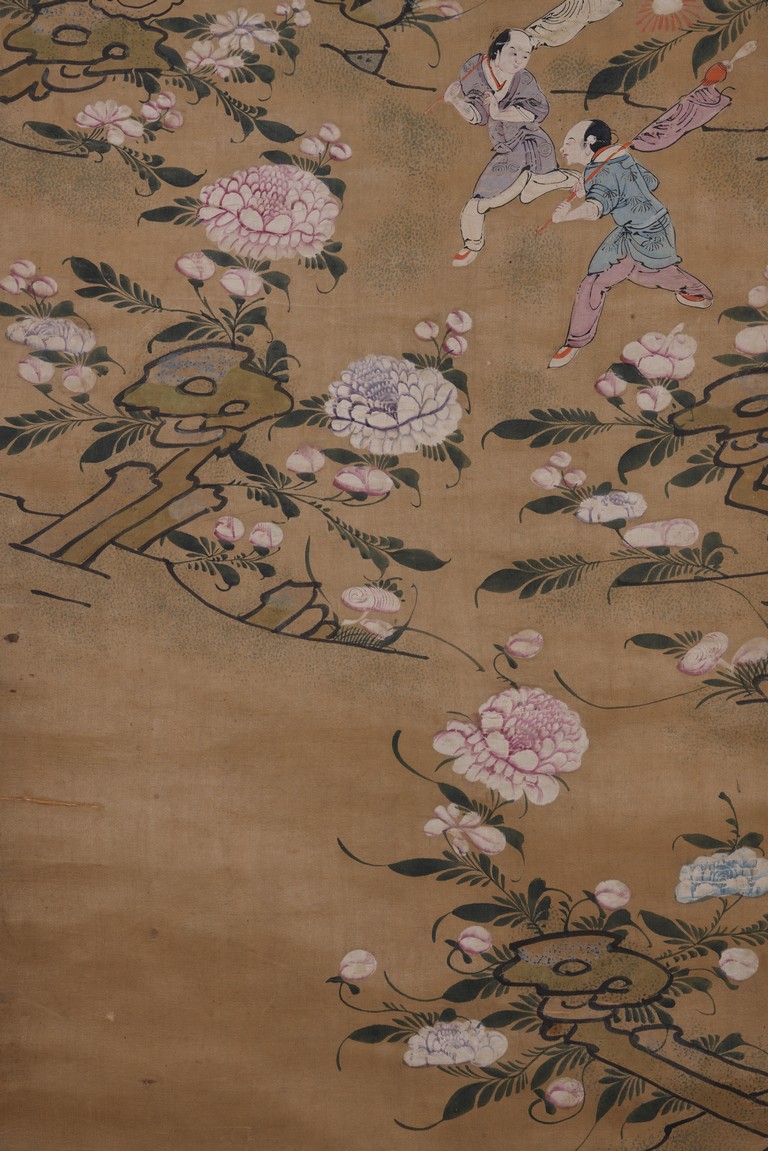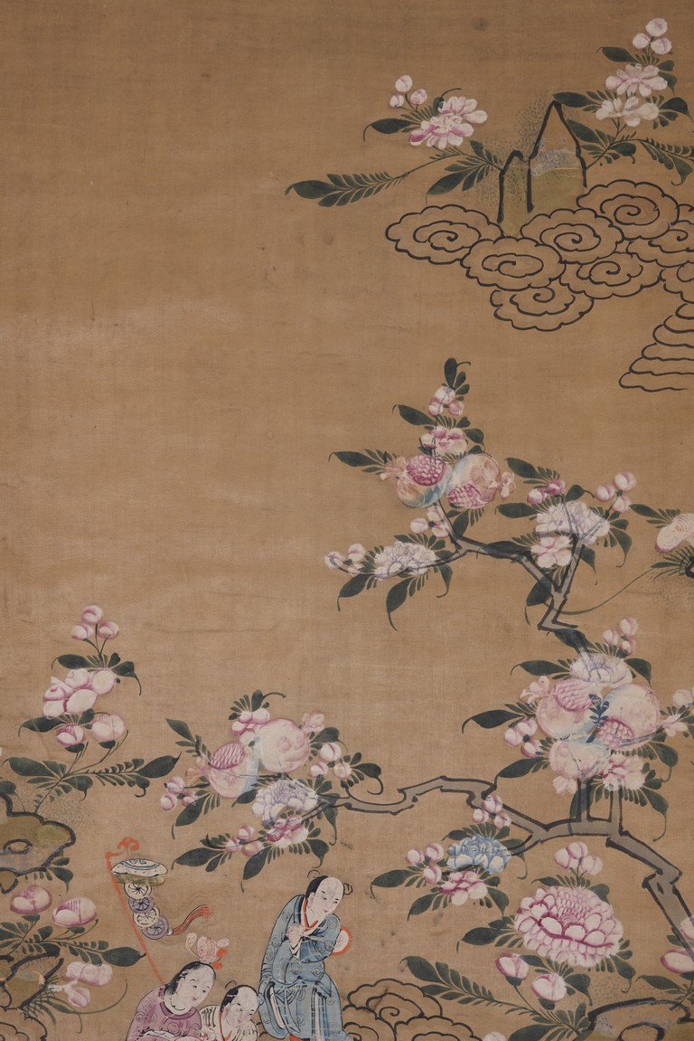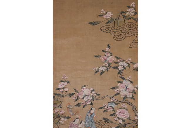 Chinese. Qing Dynasty period. Chinese color and ink on silk 'immortals and flowers' painting. Hanging scroll. Anonymous.