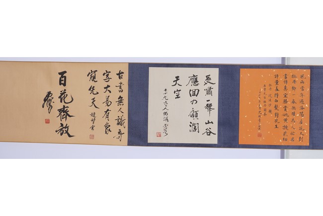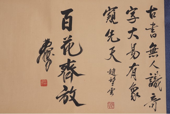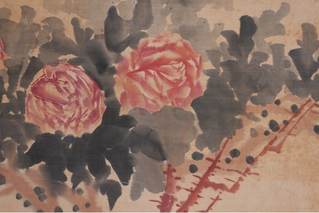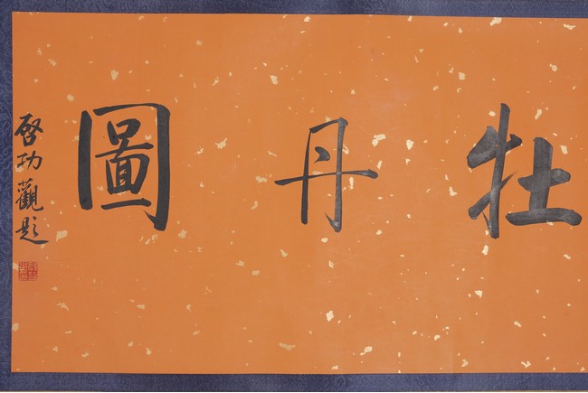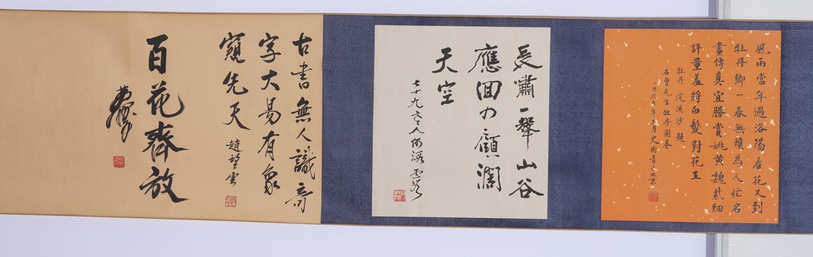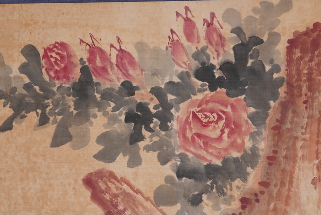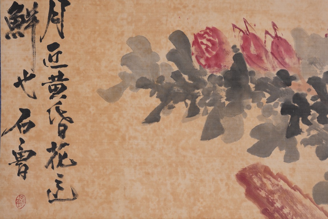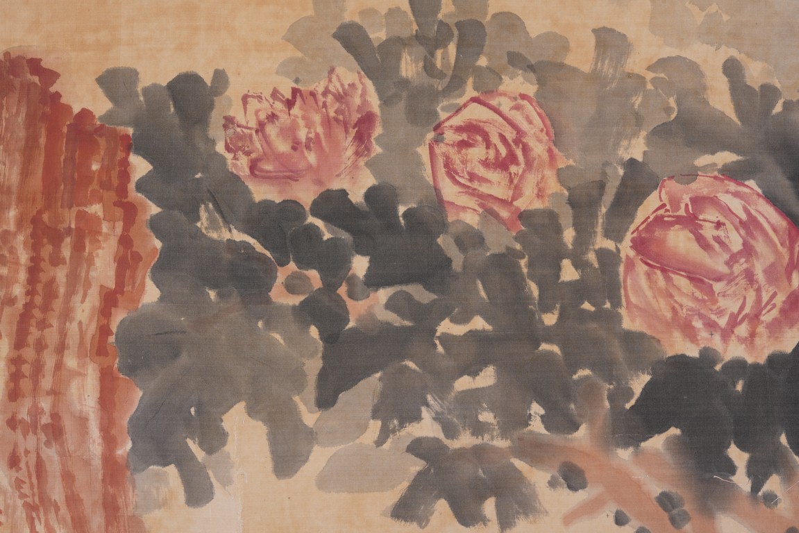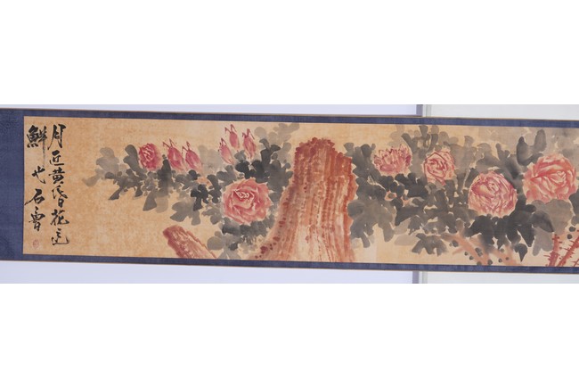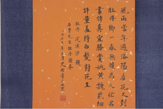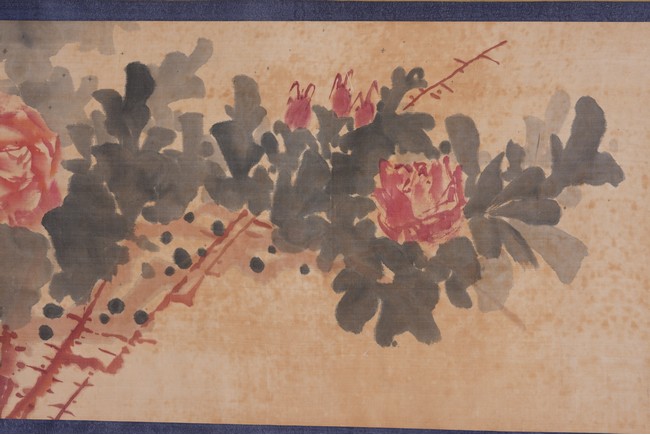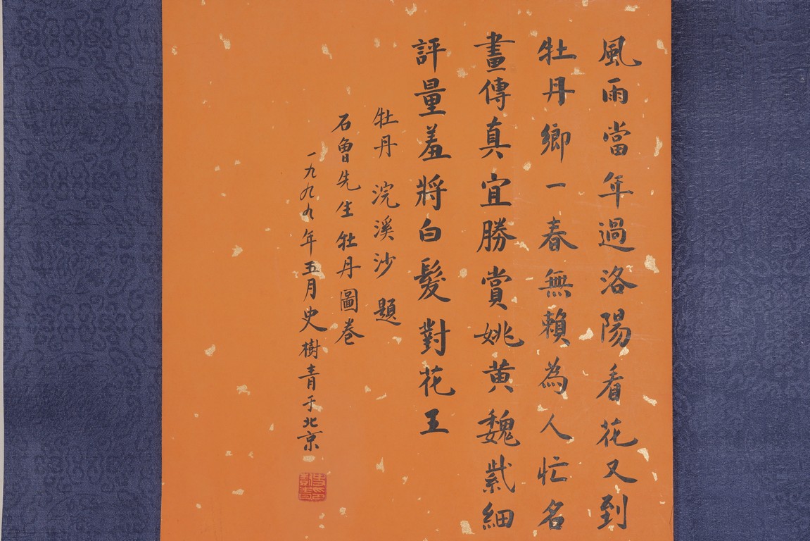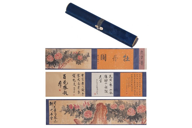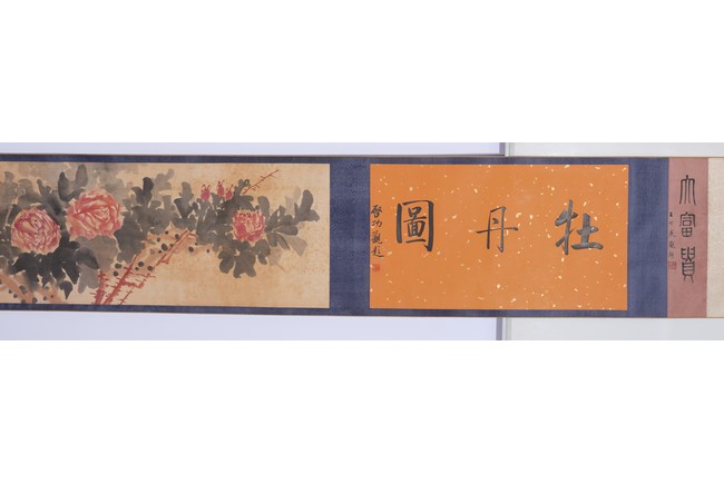 Color and ink on paper. Peonies. Handscroll. Inscribed and signed Shi Lu, with frontispiece signed and three signed colophones at the end.