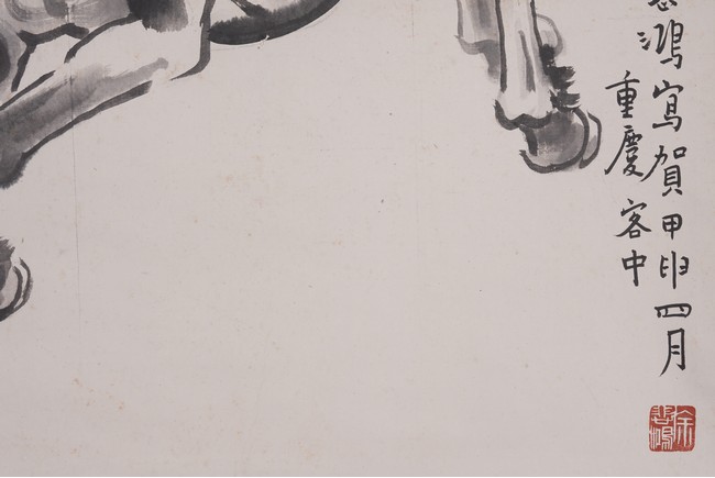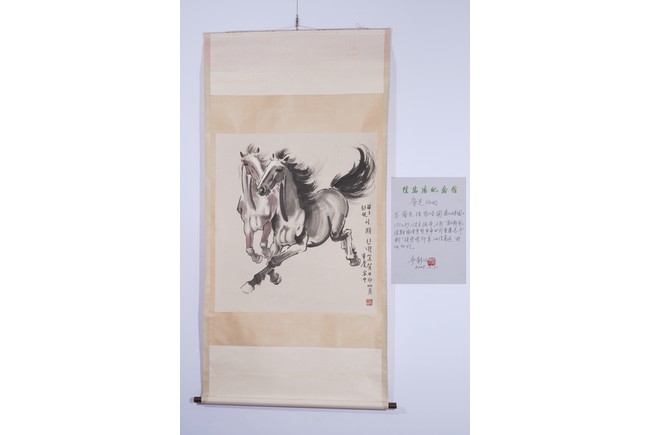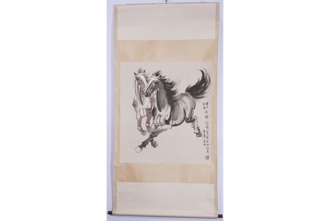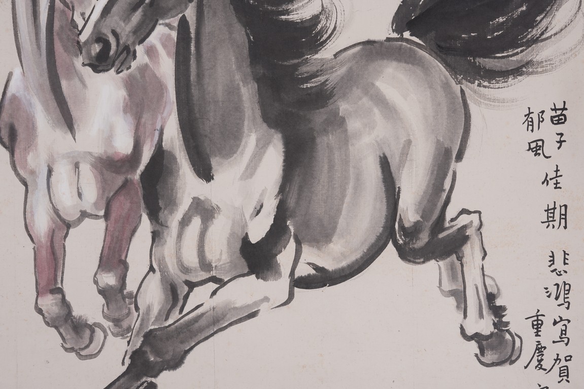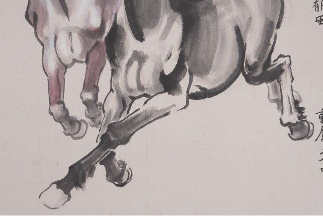 A COLOR AND INK ON PAPER 'HORSES' PAINTING, XU BEIHONG 徐悲鴻 奔馬圖 設色紙本 立軸