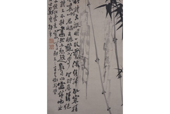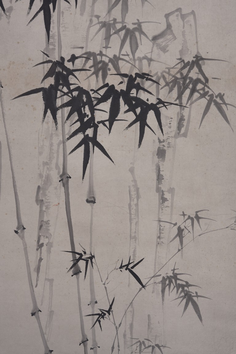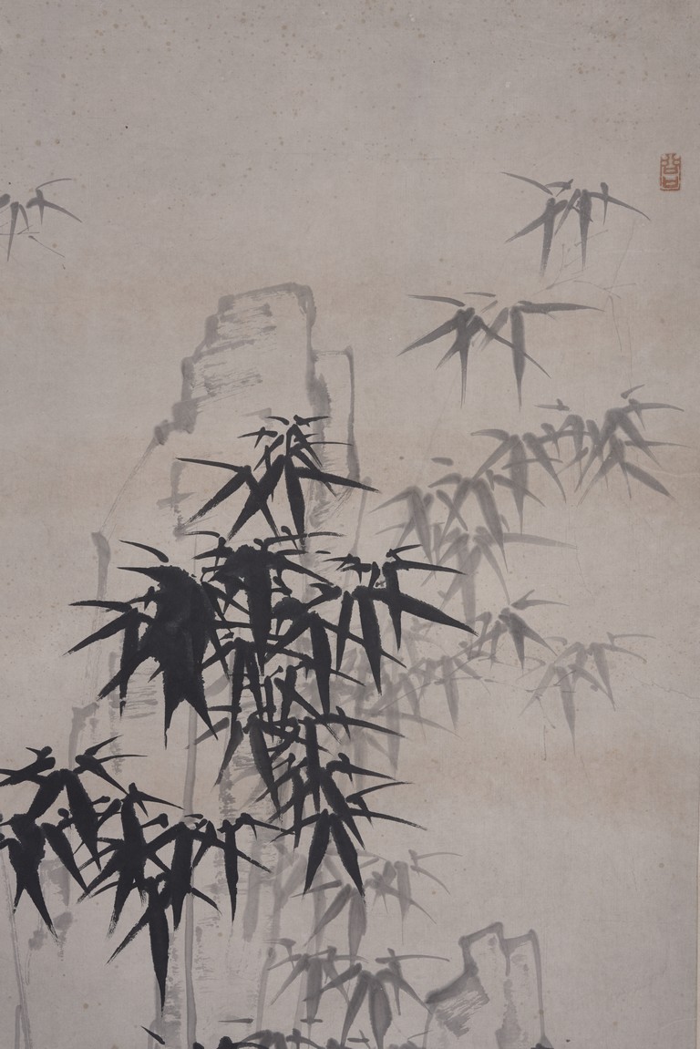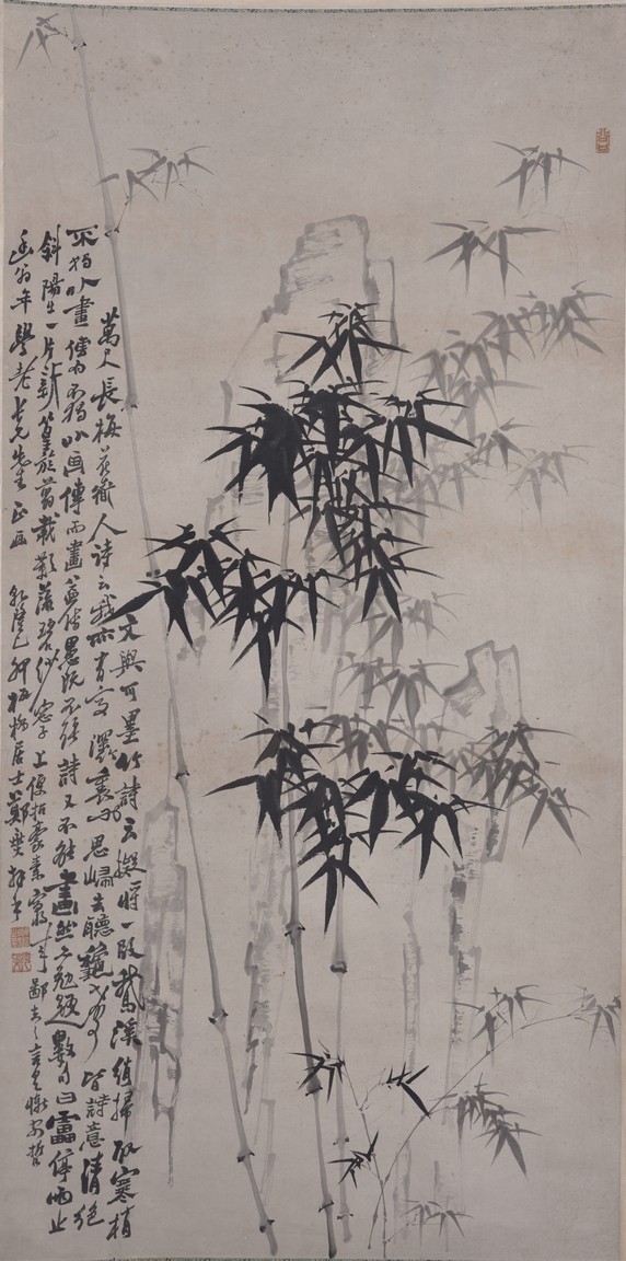 Ink on paper. Bamboo. Inscribed and signed Zheng Xie, with three seal marks of the artist. Hanging scroll.