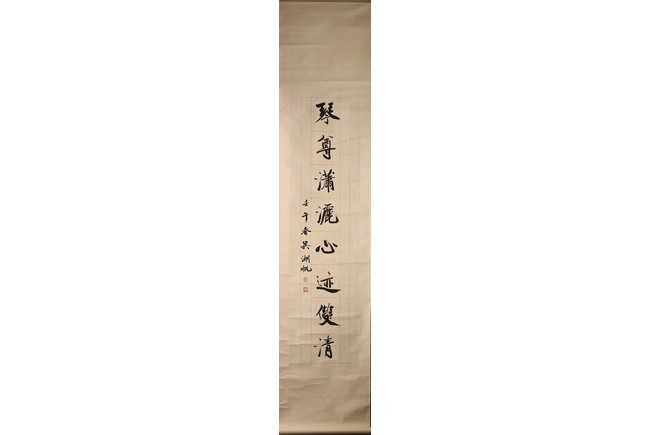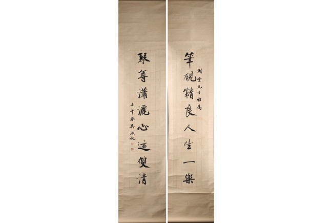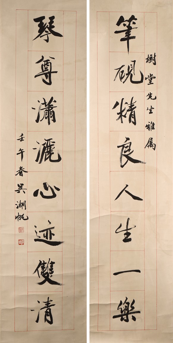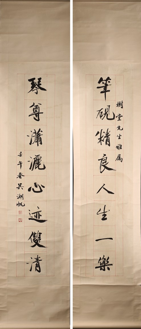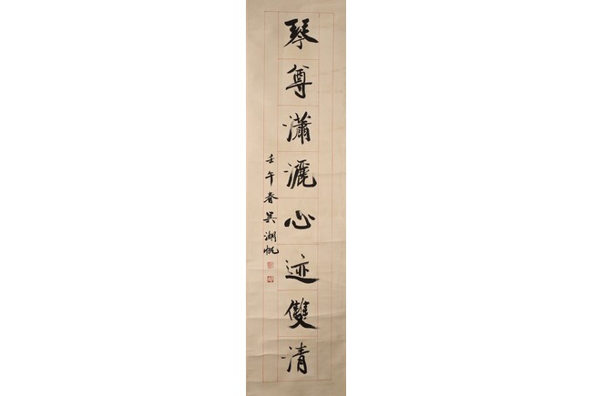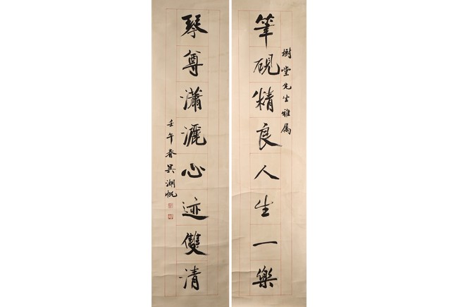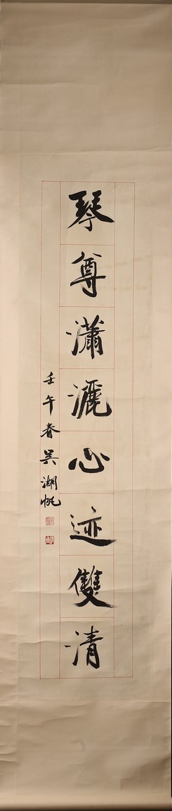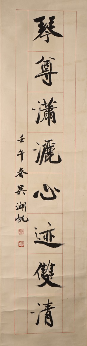 Ink on paper. Calligraphy couplet. Hanging scroll. Inscribed and signed Wu Hufan, with two seal marks of the artist.