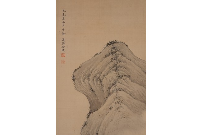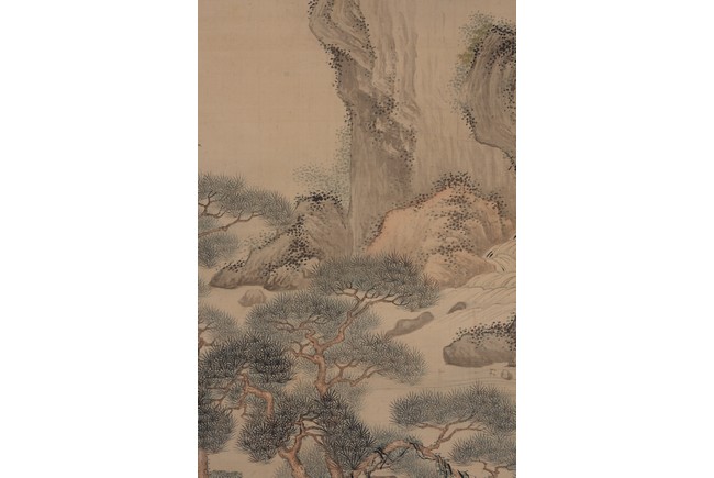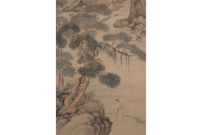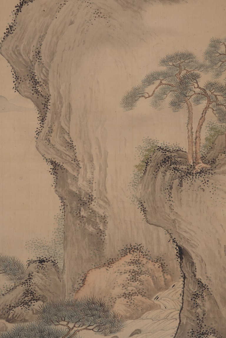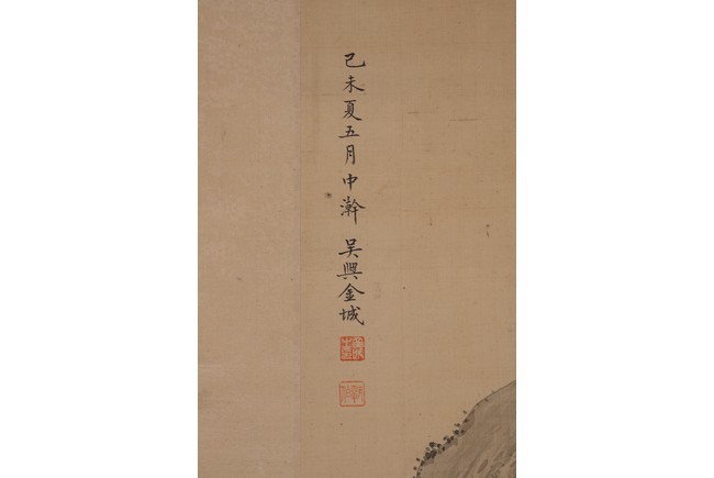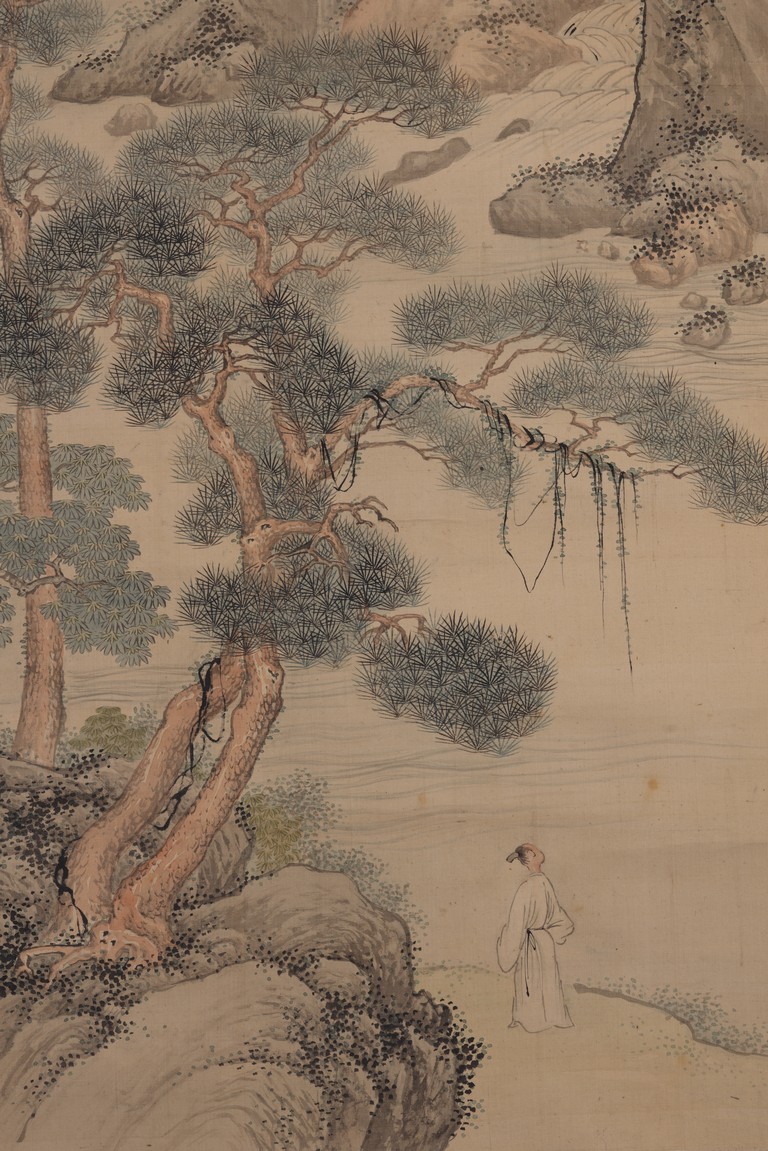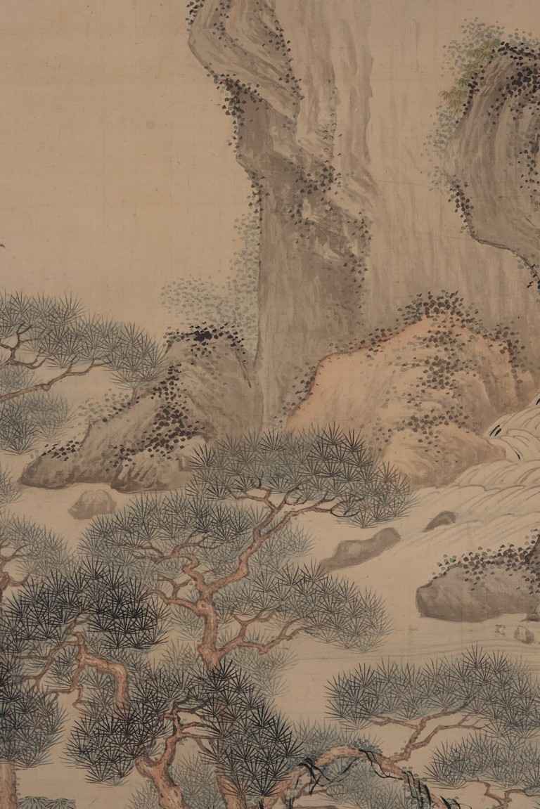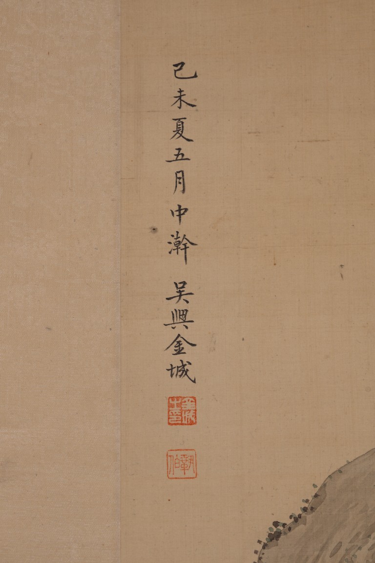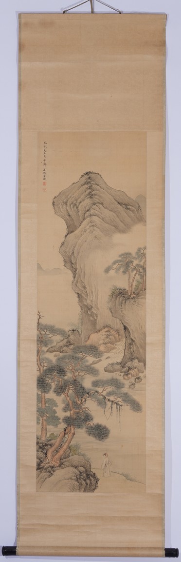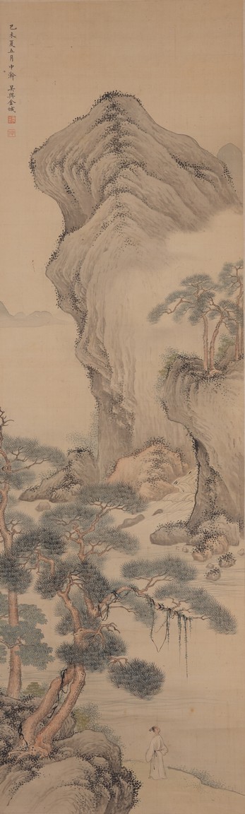 Color and ink on silk. Hanging scroll. scholar in mountain landscape. Inscribed and signed Jin Cheng, with two seal marks of the artist.