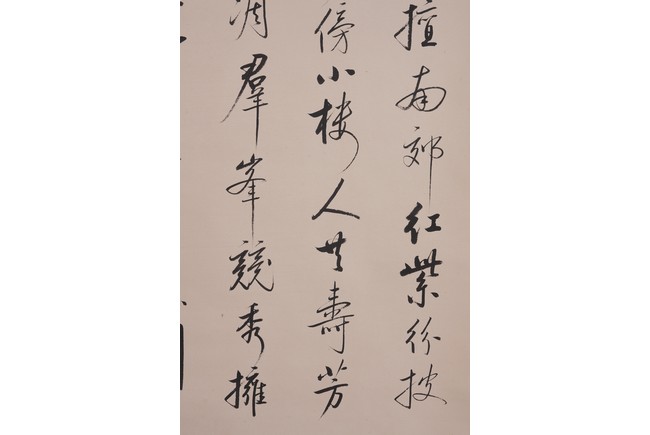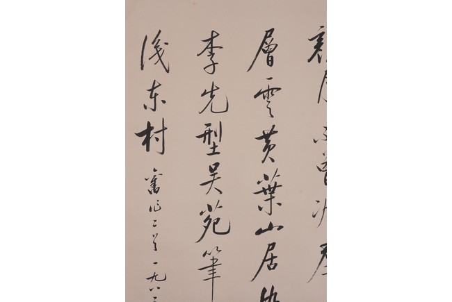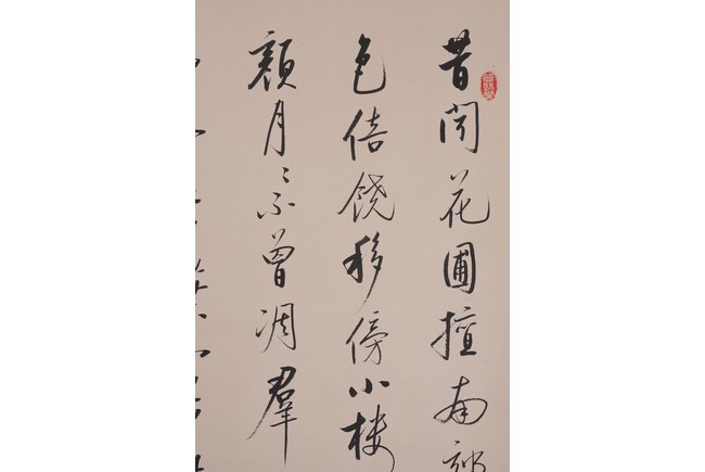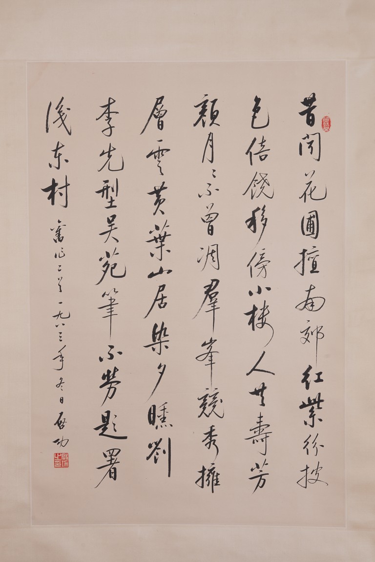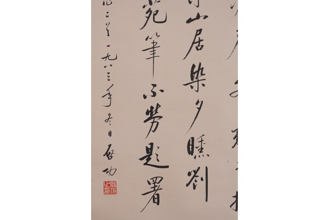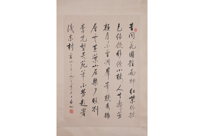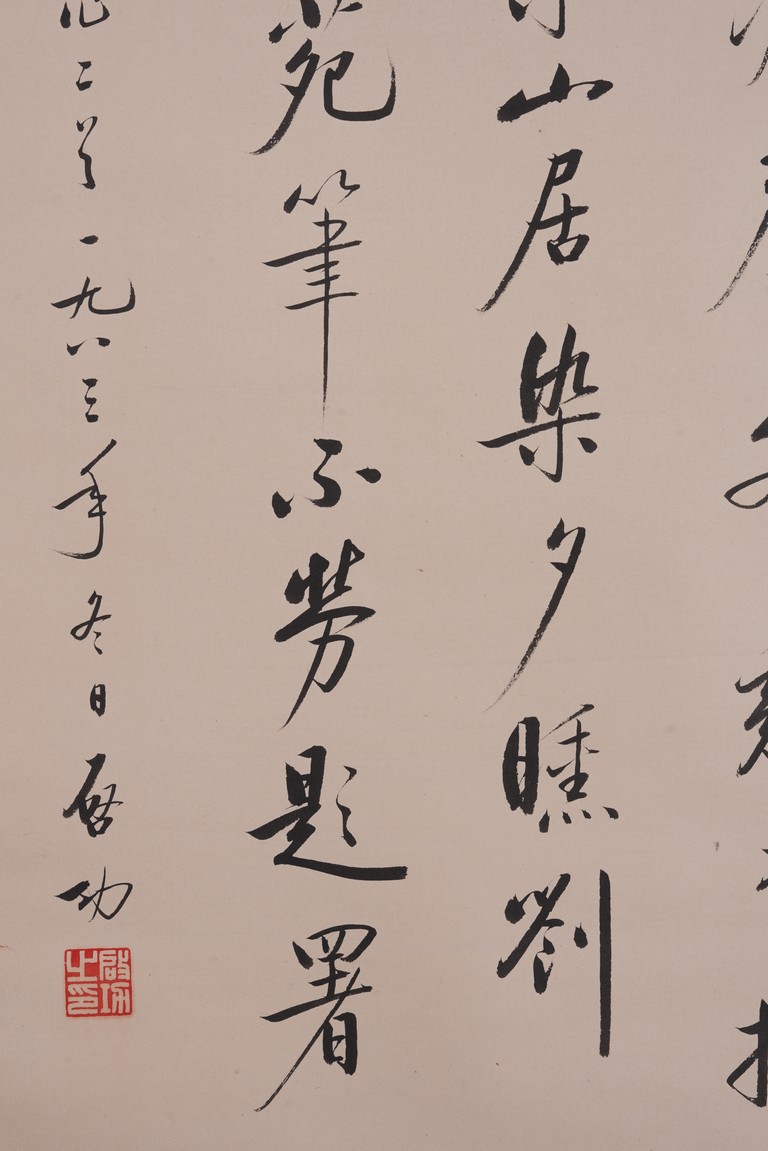 Ink on paper. Hanging scroll. Running script calligraphy. Inscribed and signed Qi Gong, with two seal marks of the artist.