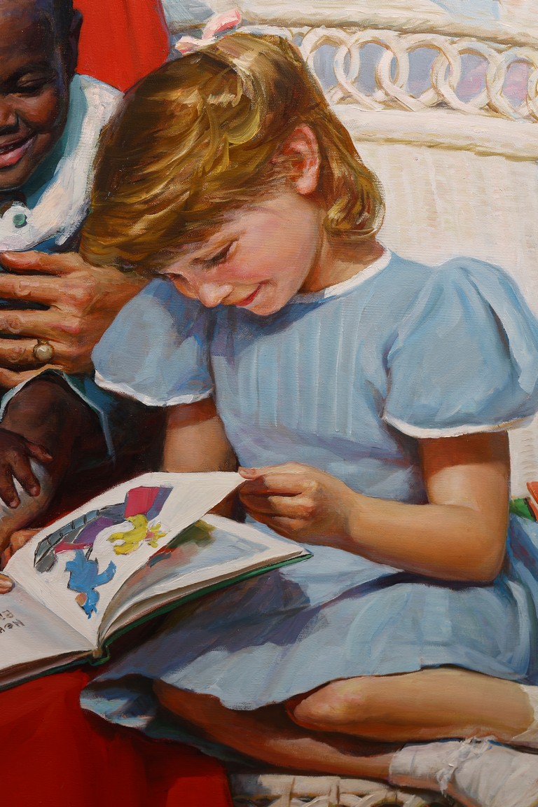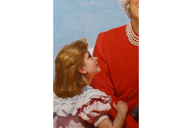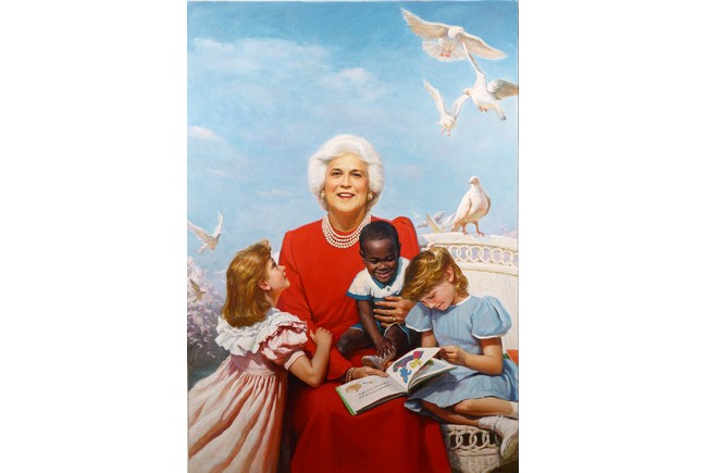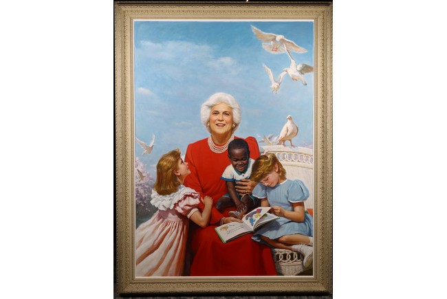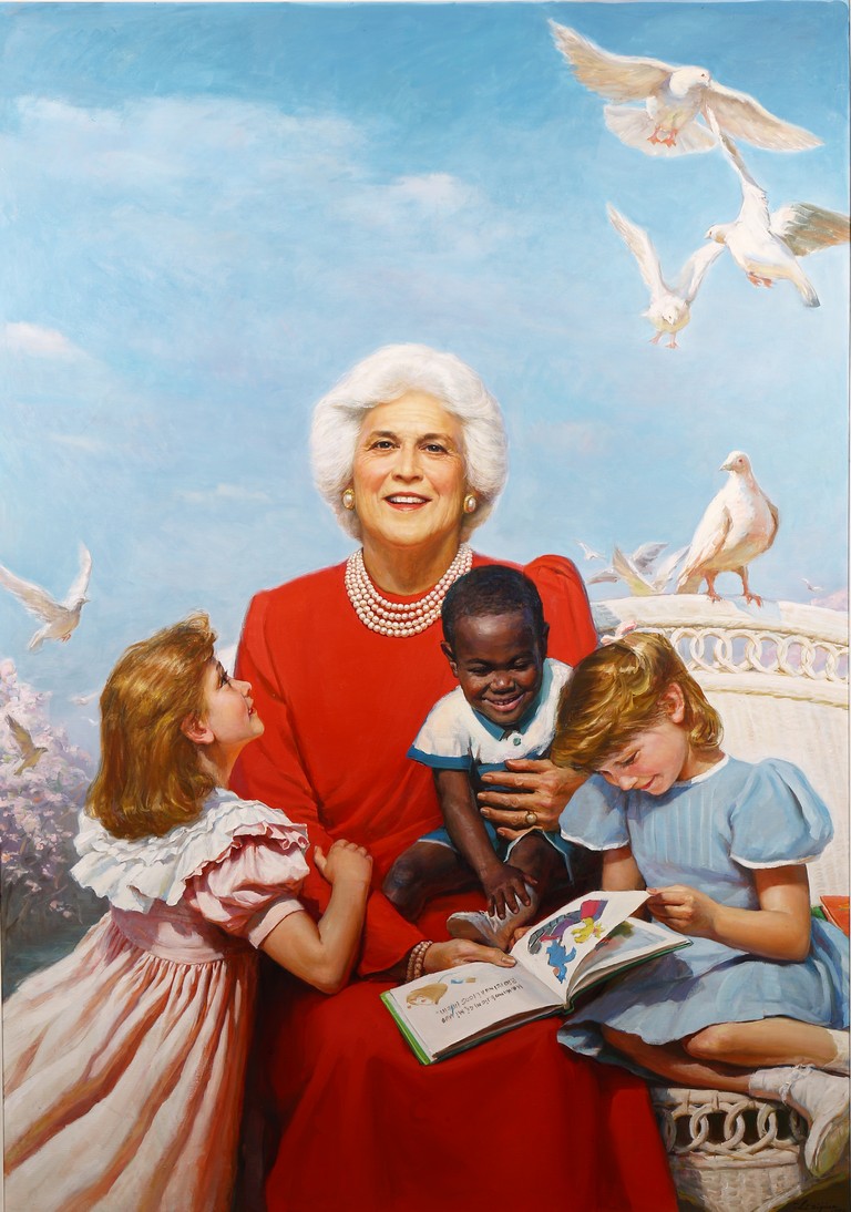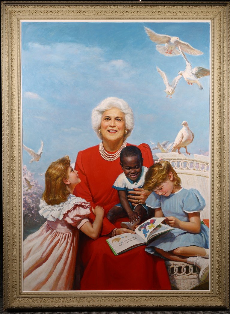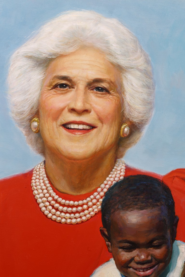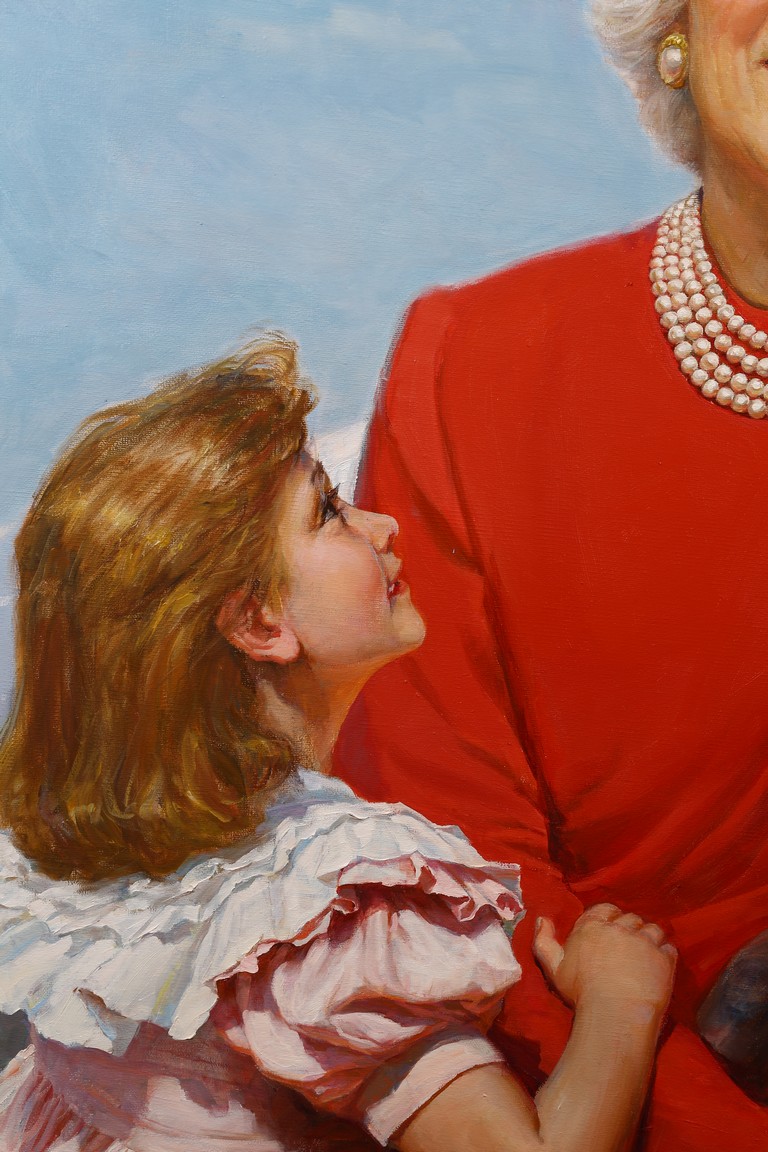 Oil on canvas. Framed. As a special tribute to the then First Lady Barbara Bush for her efforts and dedication in promoting Family literacy, in May of 1990, Pinki Chen, the then owner of Flair for Art Gallery in Mission Road, Alhambra commissioned the talented artist Zi-Jian li to create this oil painting. In this artwork, wearing a beautiful red dress and trademark of white pearl necklace, Mrs. Bush was reading a book with her board smile and motherly love to three children. The two girls are daughters of former City Manager, Kevin Murphy. This painting was first shown and displayed in the Flair for Art Gallery. Since then, it has been kept by Pinki Chen. Barbara Bush (June 8, 1925 – April 17, 2018) was the First Lady of the United States from 1989 to 1993 as the wife of George H. W. Bush, who served as the 41st President of the United States. She was the founder of the Barbara Bush Foundation for Family Literacy. She previously was Second Lady of the United States from 1981 to 1989. Among her six children are George W. Bush, the 43rd President of the United States, and Jeb Bush, the 43rd Governor of Florida. As First Lady, Family literacy was Barbara Bush's cause, and she called it the most important issue we have. She became involved with many literacy organizations, served on literacy committees and chaired many reading organizations. Eventually, she helped develop the Barbara Bush Foundation for Family Literacy. She continued to be dedicated to eliminating the generational cycle of illiteracy in America by supporting programs where parents and their young children are able to learn together. During the early 1980s, after statistics had shown that foreign-born immigrants from Latin America had nearly quintupled just since 1960, statistics showed that 35 million adults could not read above the eighth-grade level and that 23 million were not able to read beyond a fourth-grade level. During her lifetime Mrs. Bush remained active in the foundation and served as honorary chair.