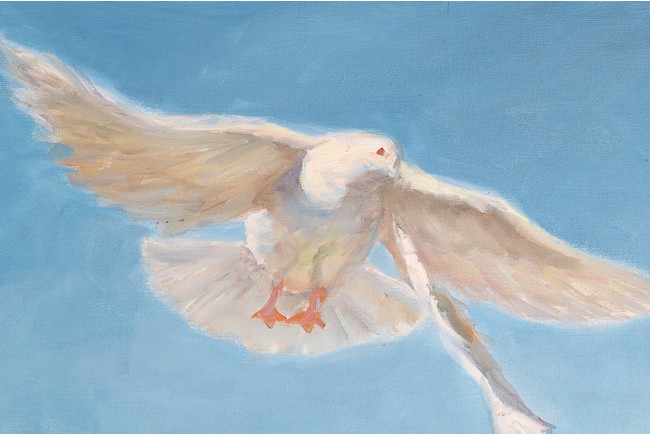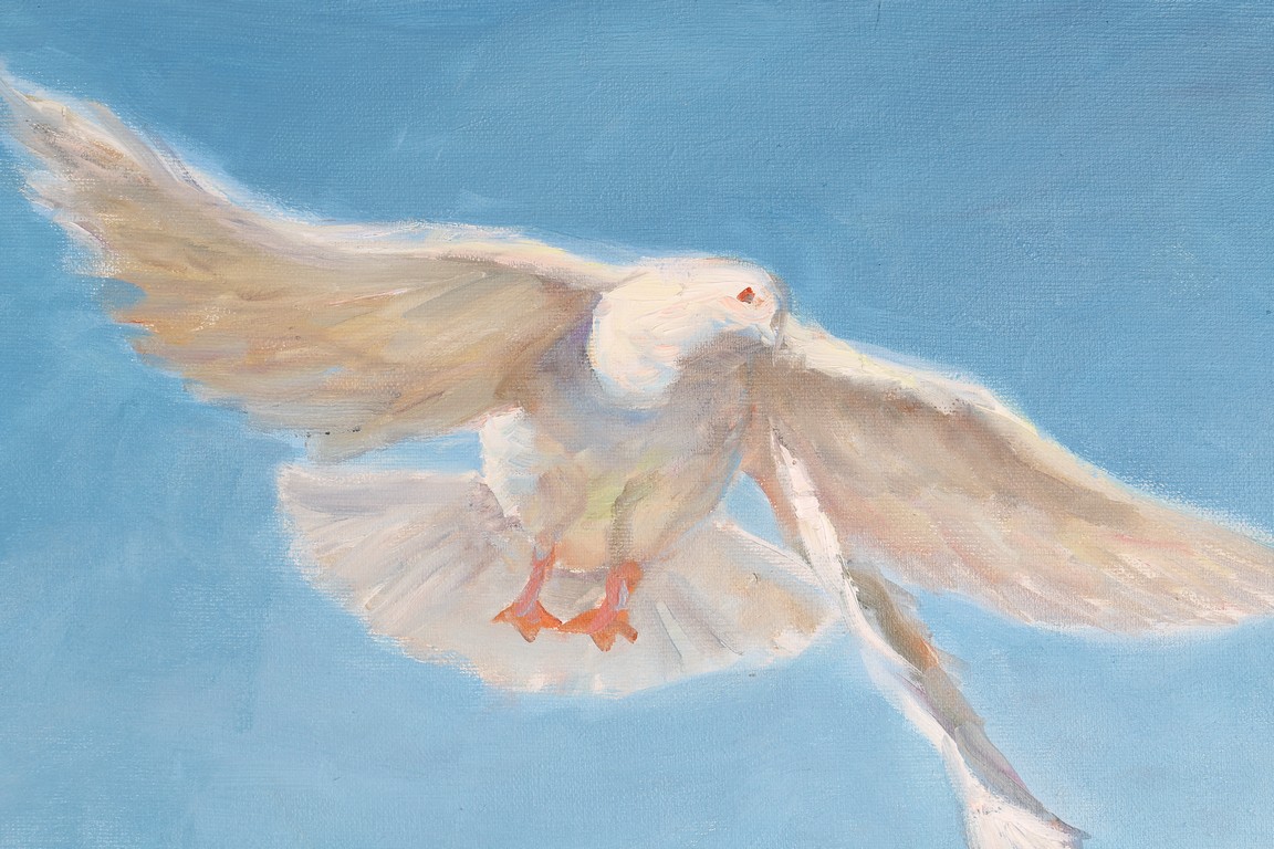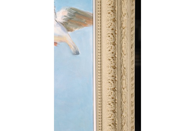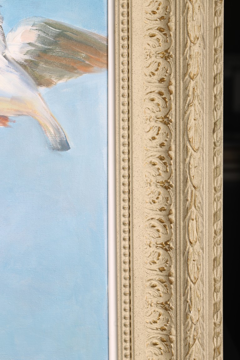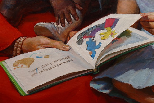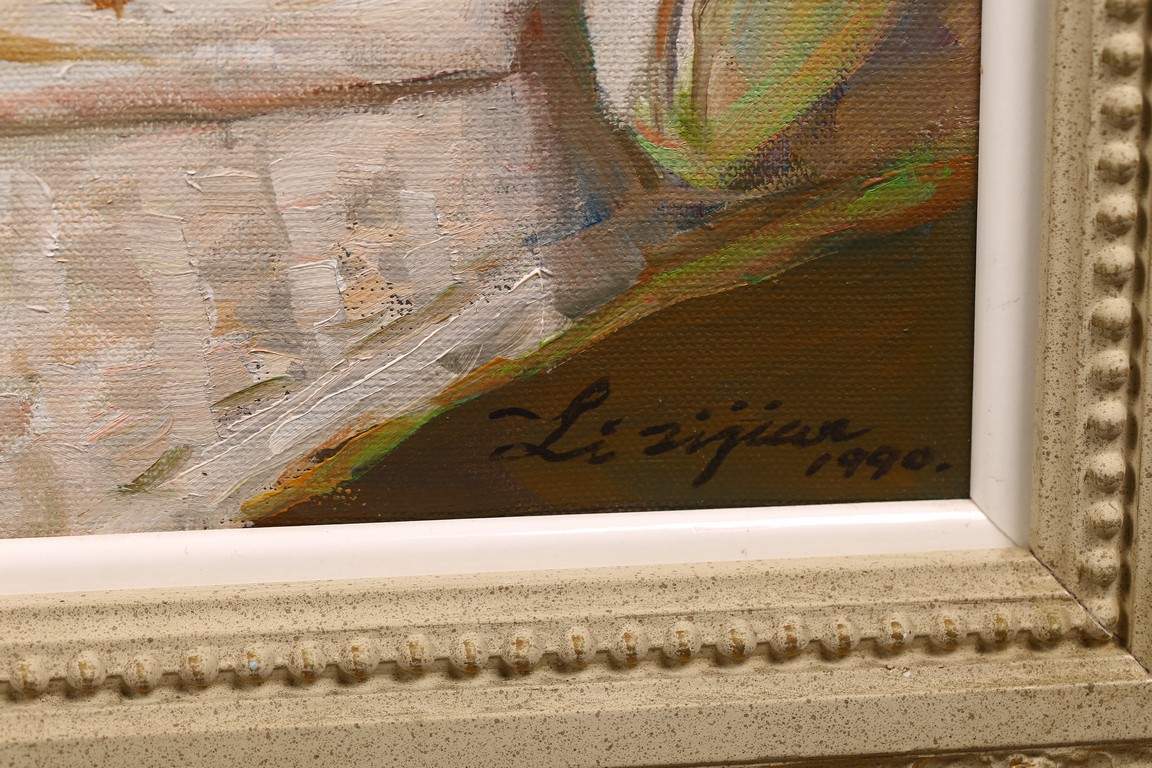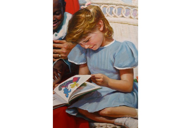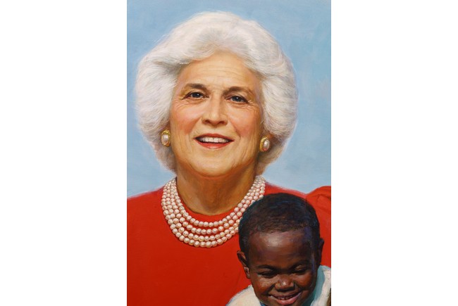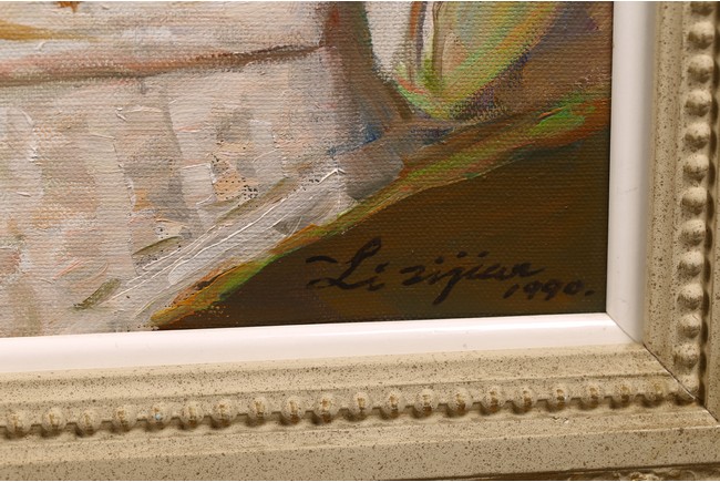 Oil on canvas. Framed. As a special tribute to the then First Lady Barbara Bush for her efforts and dedication in promoting Family literacy, in May of 1990, Pinki Chen, the then owner of Flair for Art Gallery in Mission Road, Alhambra commissioned the talented artist Zi-Jian li to create this oil painting. In this artwork, wearing a beautiful red dress and trademark of white pearl necklace, Mrs. Bush was reading a book with her board smile and motherly love to three children. The two girls are daughters of former City Manager, Kevin Murphy. This painting was first shown and displayed in the Flair for Art Gallery. Since then, it has been kept by Pinki Chen. Barbara Bush (June 8, 1925 – April 17, 2018) was the First Lady of the United States from 1989 to 1993 as the wife of George H. W. Bush, who served as the 41st President of the United States. She was the founder of the Barbara Bush Foundation for Family Literacy. She previously was Second Lady of the United States from 1981 to 1989. Among her six children are George W. Bush, the 43rd President of the United States, and Jeb Bush, the 43rd Governor of Florida. As First Lady, Family literacy was Barbara Bush's cause, and she called it the most important issue we have. She became involved with many literacy organizations, served on literacy committees and chaired many reading organizations. Eventually, she helped develop the Barbara Bush Foundation for Family Literacy. She continued to be dedicated to eliminating the generational cycle of illiteracy in America by supporting programs where parents and their young children are able to learn together. During the early 1980s, after statistics had shown that foreign-born immigrants from Latin America had nearly quintupled just since 1960, statistics showed that 35 million adults could not read above the eighth-grade level and that 23 million were not able to read beyond a fourth-grade level. During her lifetime Mrs. Bush remained active in the foundation and served as honorary chair.