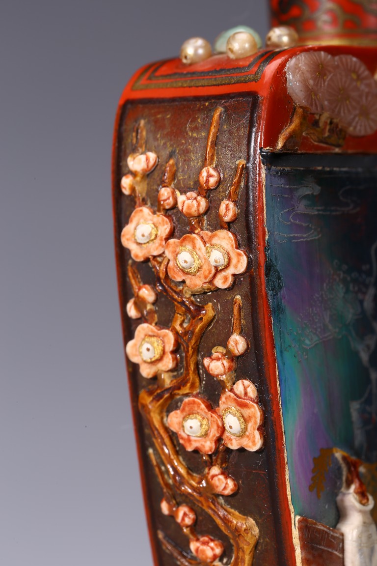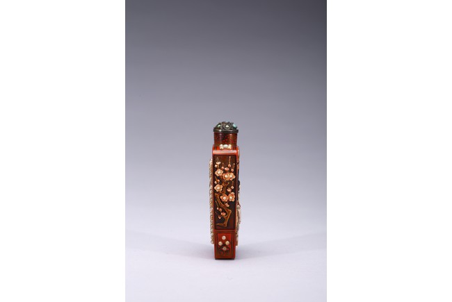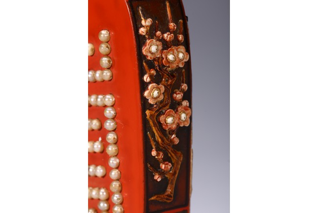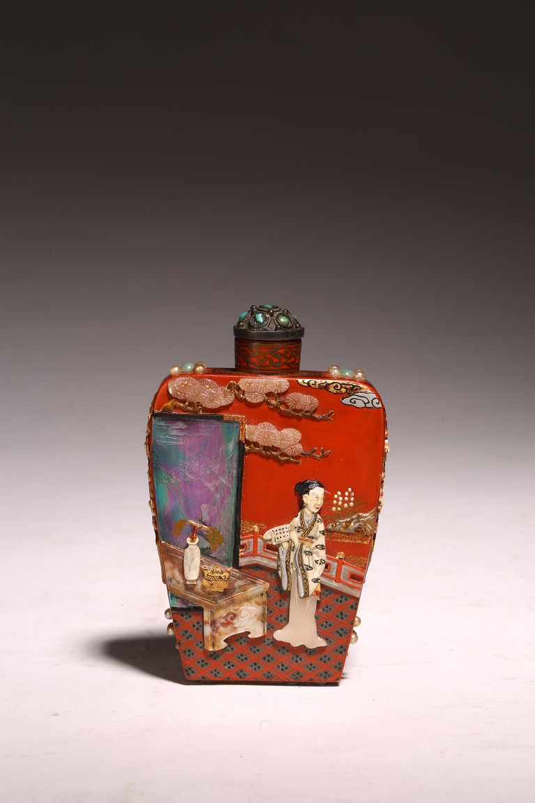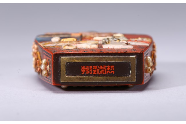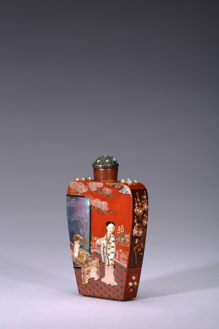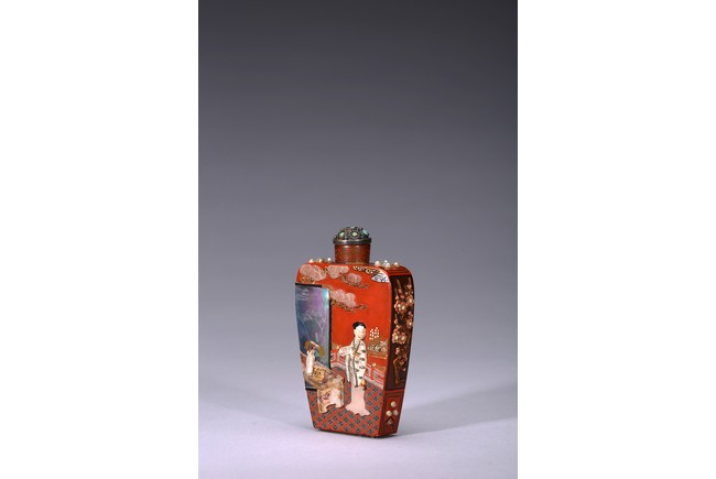 Qing Dynasty period. The flattened shield form body coated with layer of red lacquer, richly decorated in carnelian, mother-of-pearl, soapstone, pearl, gold, and lacquer with a graceful lady chanting poems in front of massive painted screen, set in a fenced garden terrace on one side, the reverse with numerous even-sized pearls forming a stylized shou character, each of the narrow shoulders with a panel of prunus blossoms, the base inscribed in red lacquer with four character Qianlong mark.