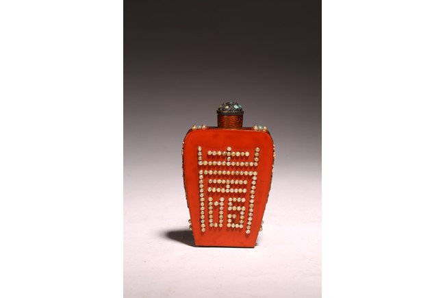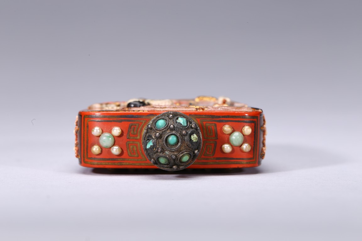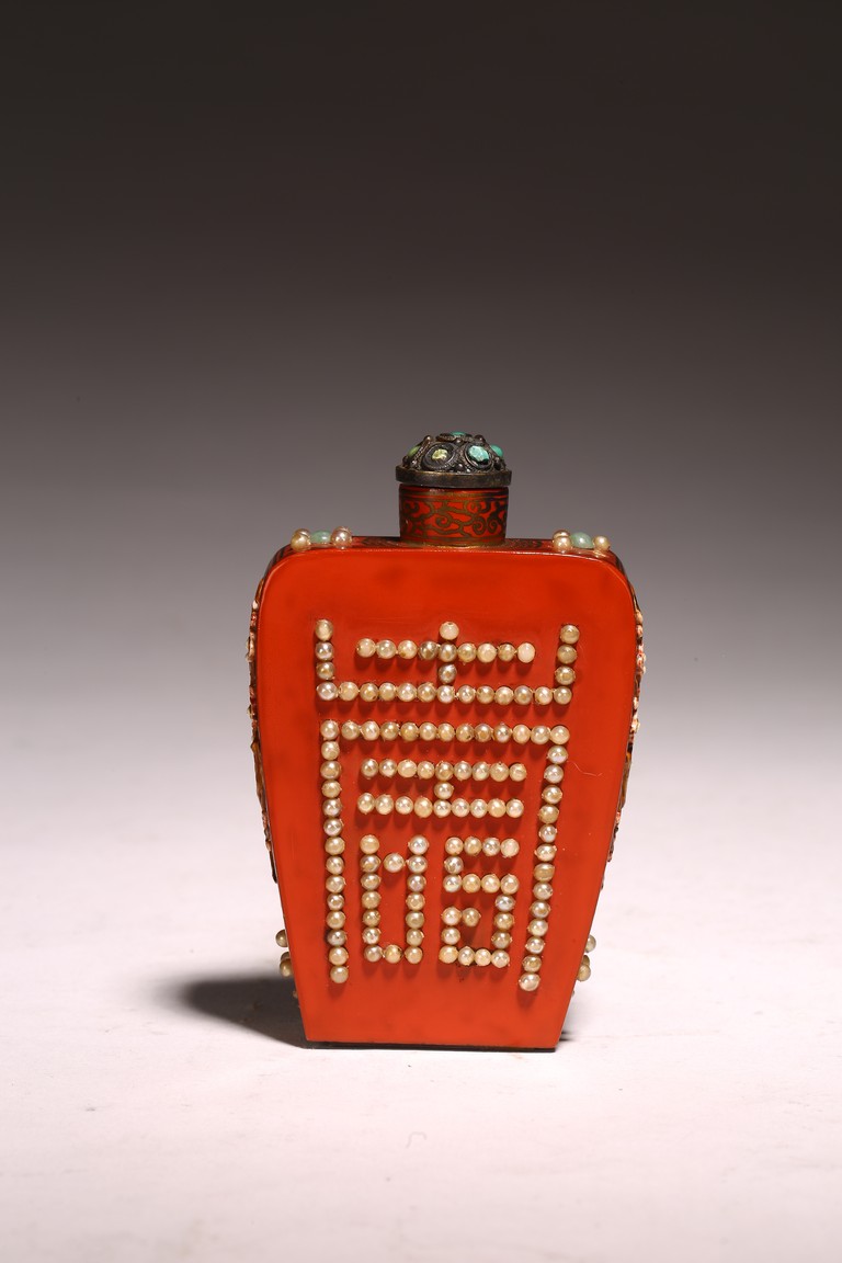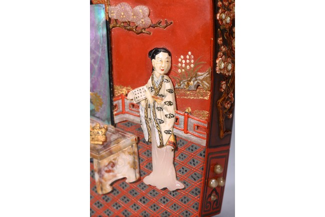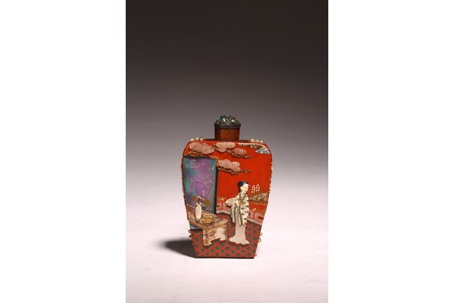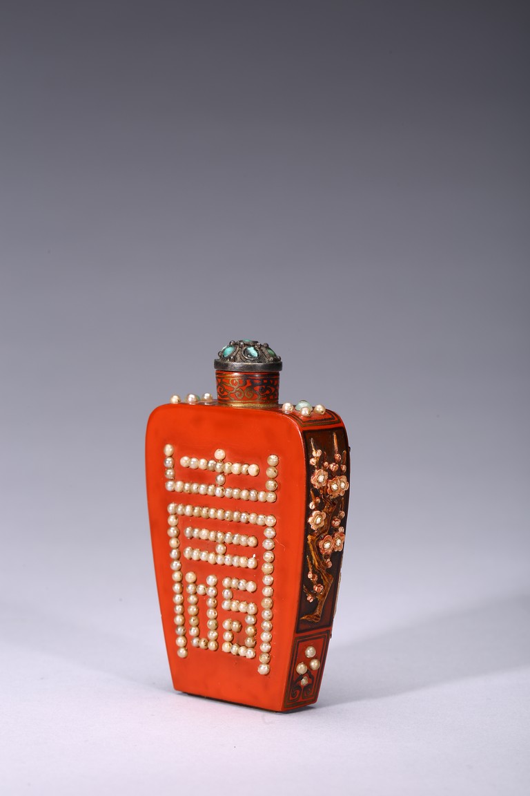 Qing Dynasty period. The flattened shield form body coated with layer of red lacquer, richly decorated in carnelian, mother-of-pearl, soapstone, pearl, gold, and lacquer with a graceful lady chanting poems in front of massive painted screen, set in a fenced garden terrace on one side, the reverse with numerous even-sized pearls forming a stylized shou character, each of the narrow shoulders with a panel of prunus blossoms, the base inscribed in red lacquer with four character Qianlong mark.
